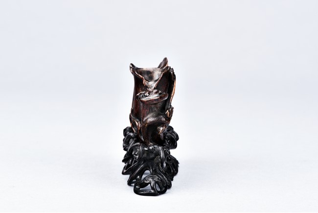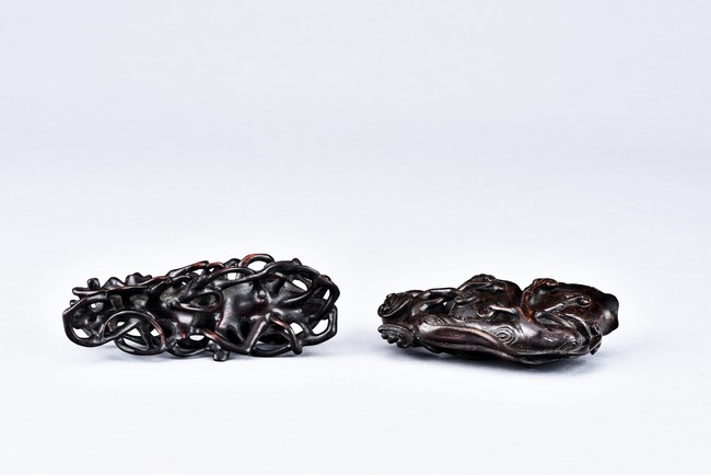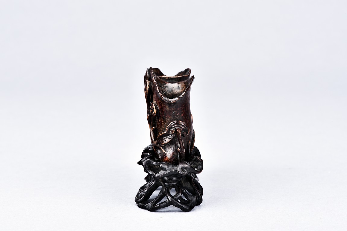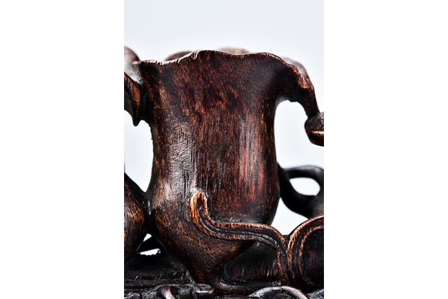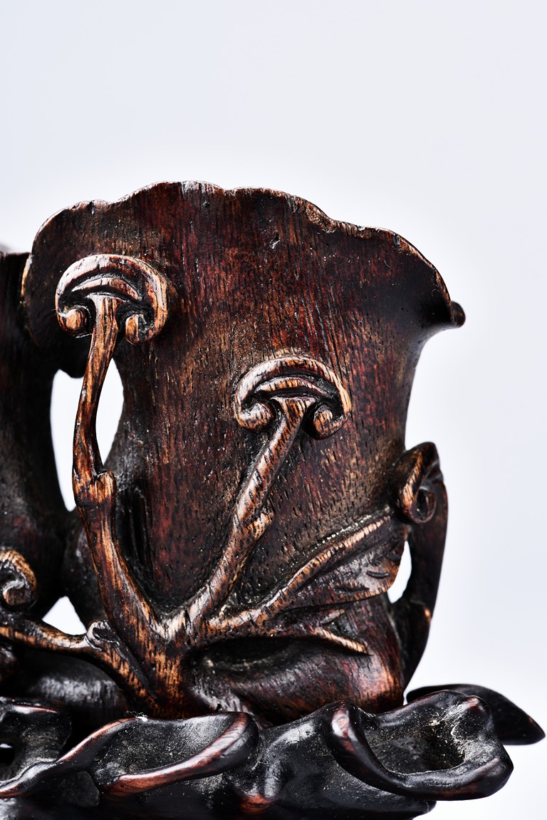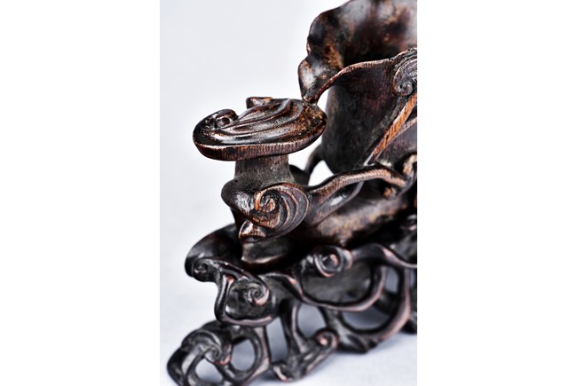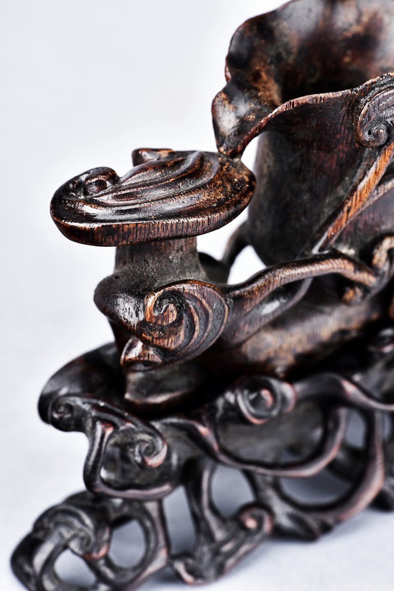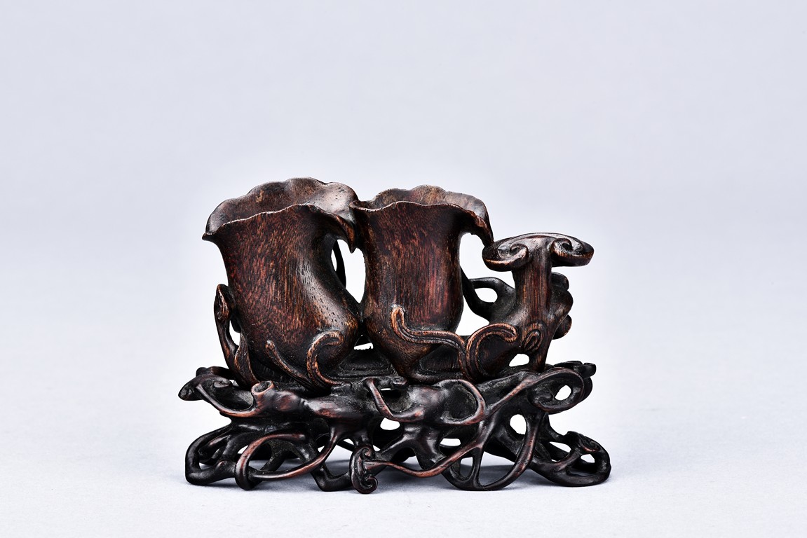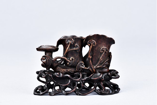 Carved as two magnolia with wide openings, the inside well-hollowed, and a smaller lingzhi head, all supported on finely carved and pierced stand. Qing Dynasty period