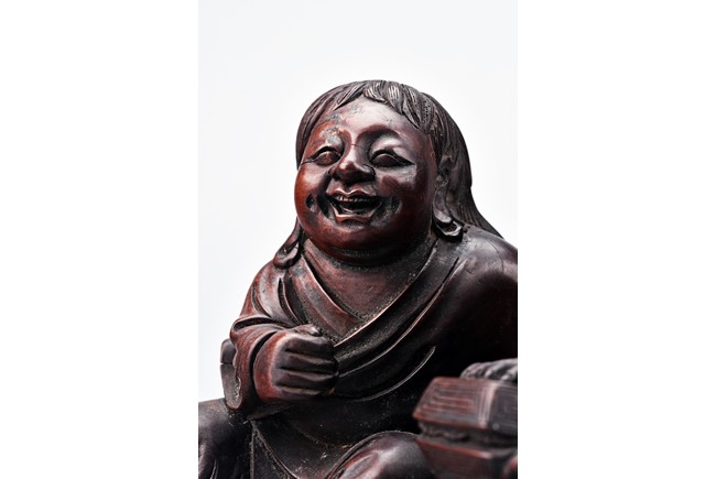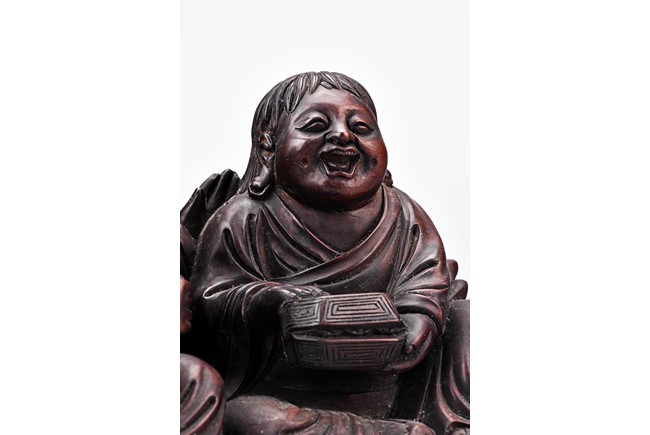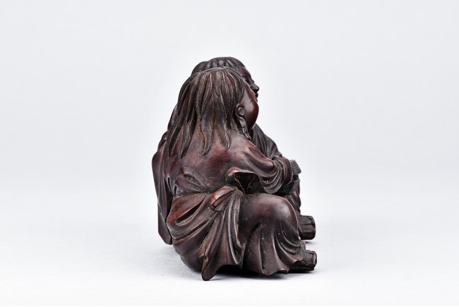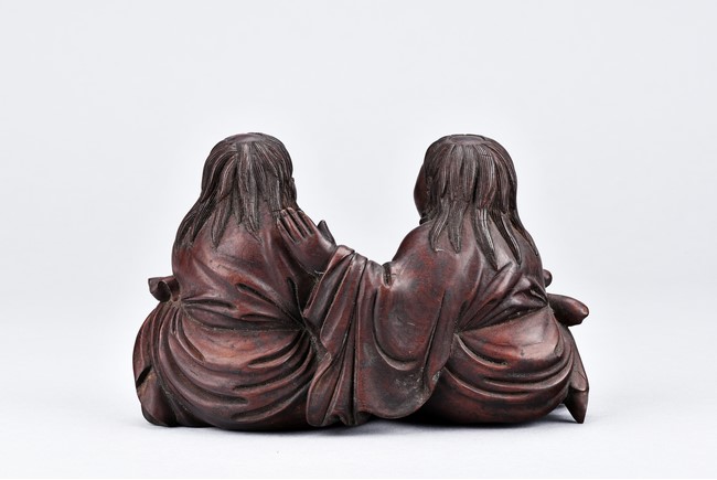 The two immortal shown seated next to each other, one holding a cover box, left knee raised, wearing long robe and face with laughing expression. hair finely incised; the other's left hand patting on partner's back. right hand in a fist, with laughing expression. Qing Dynasty period