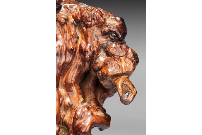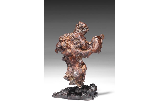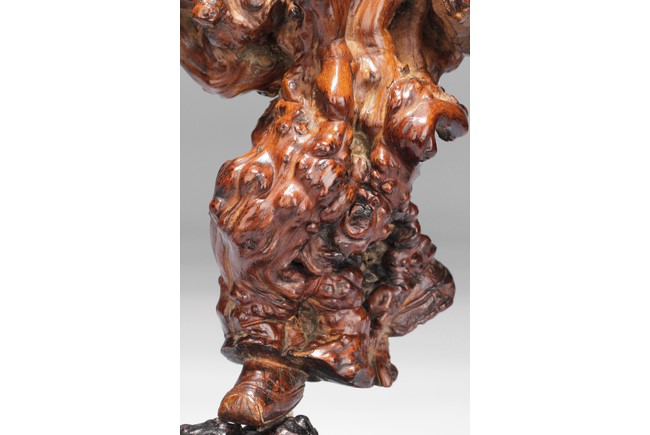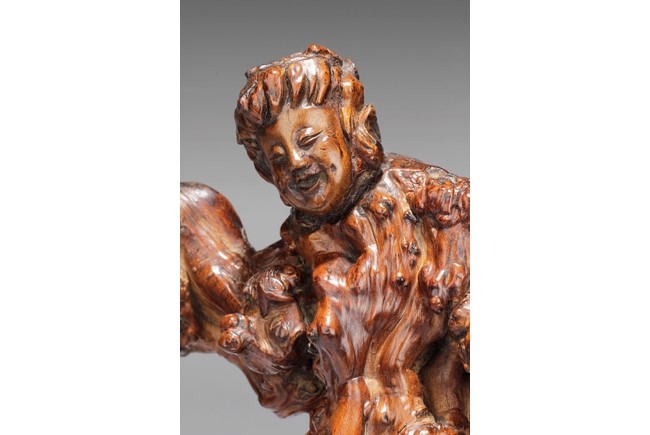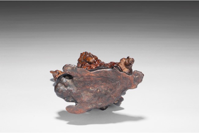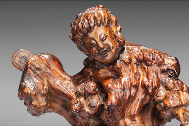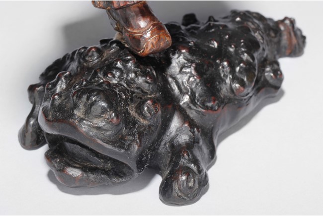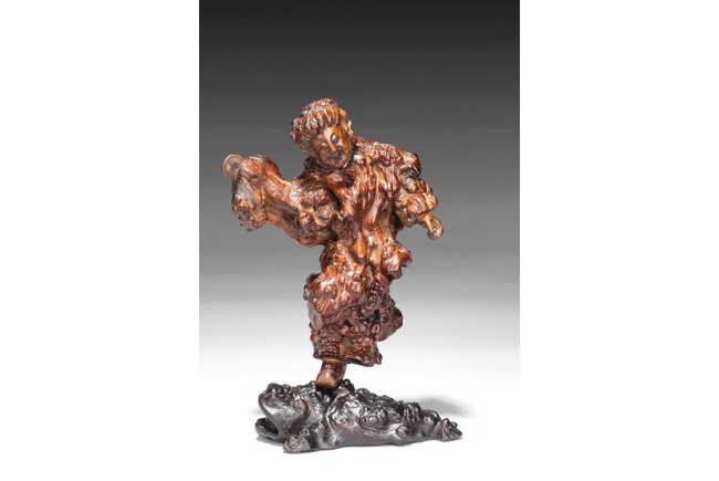 The well carved root figure depicts Liu Hai holding a Chinese coin, standing with one foot on top of the frog. Republic period.