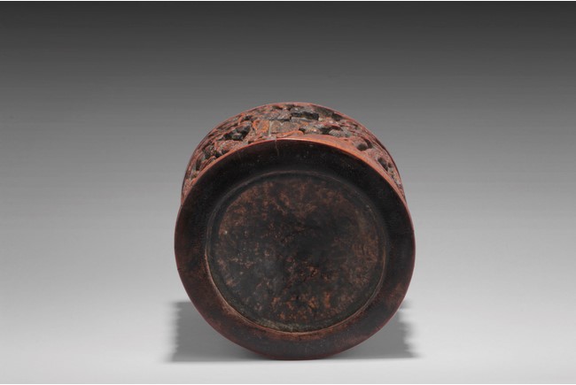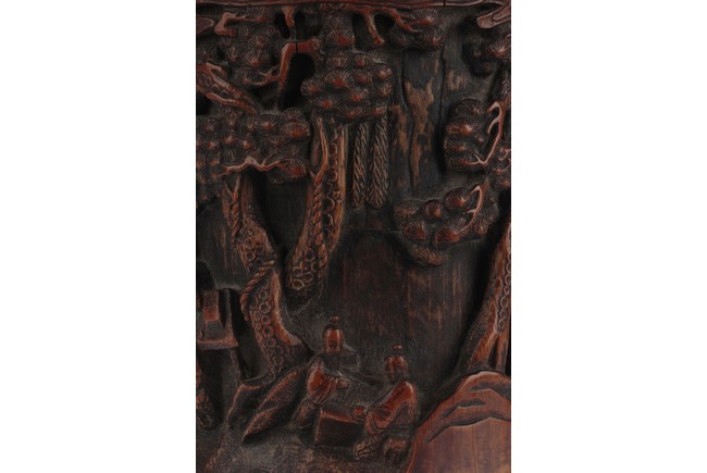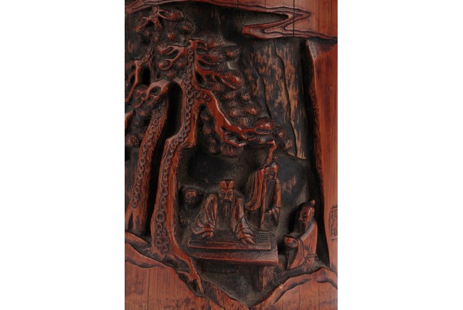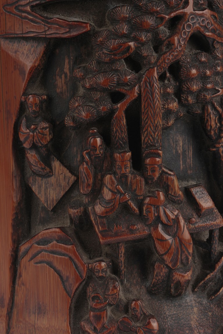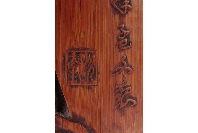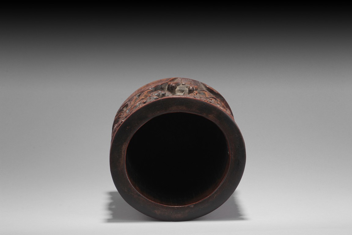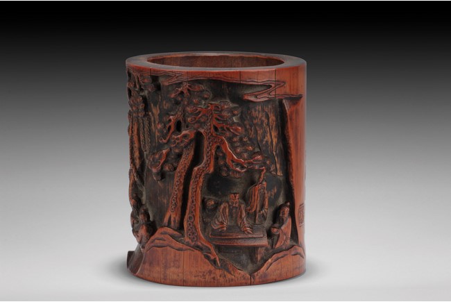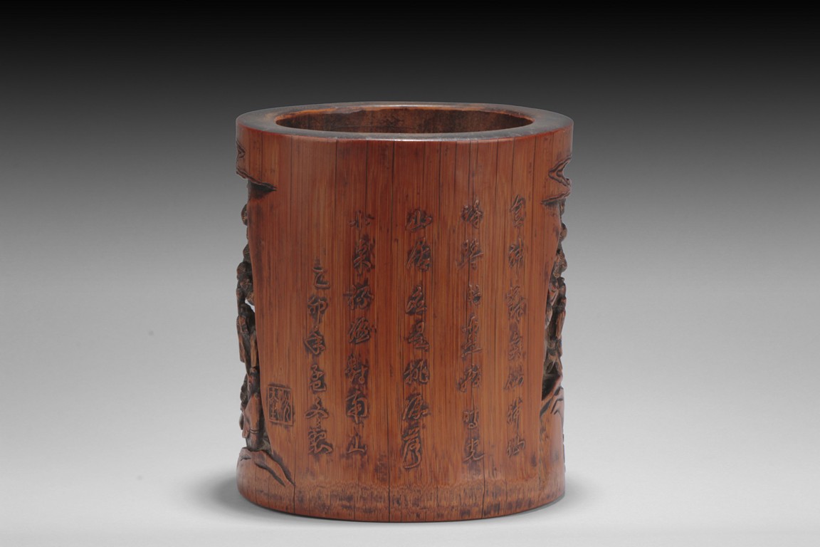 Of cylindrical form, the brush pot low relief carved with elders and kids enjoying different activities within a mountain and forest setting, the back carved with Chinese poem, complete with artist signature and mark. Republic period.