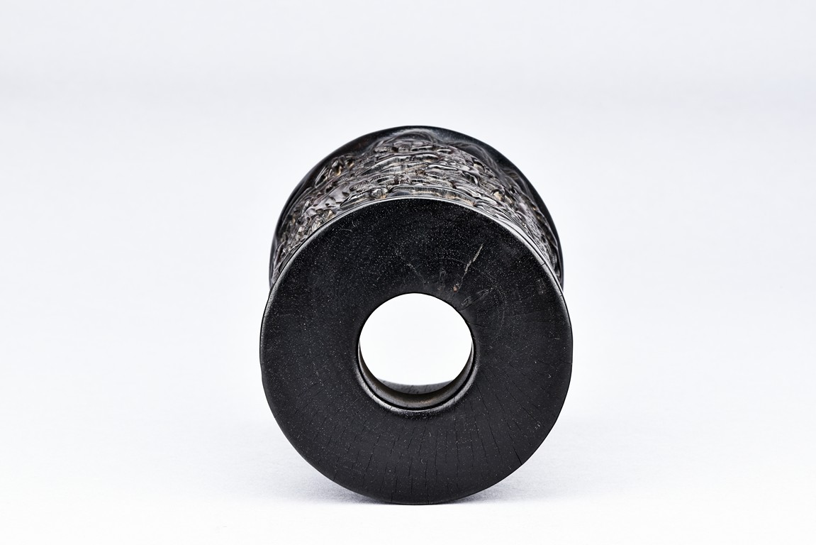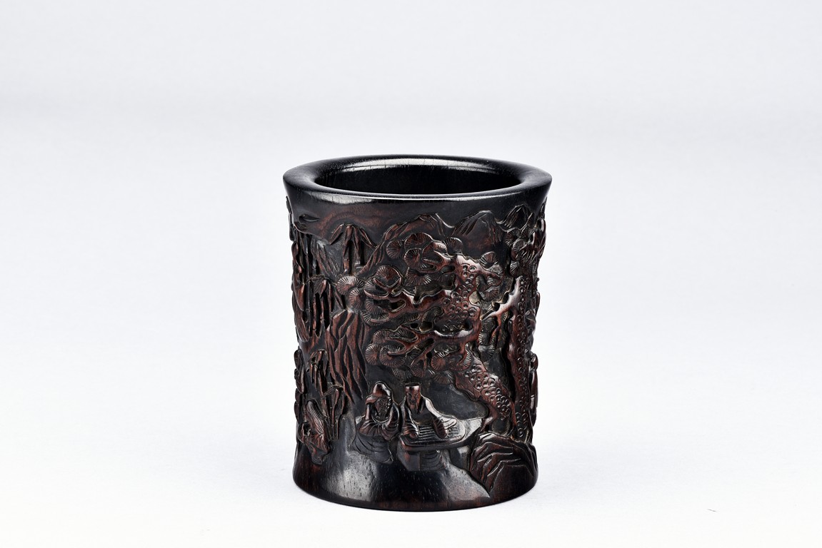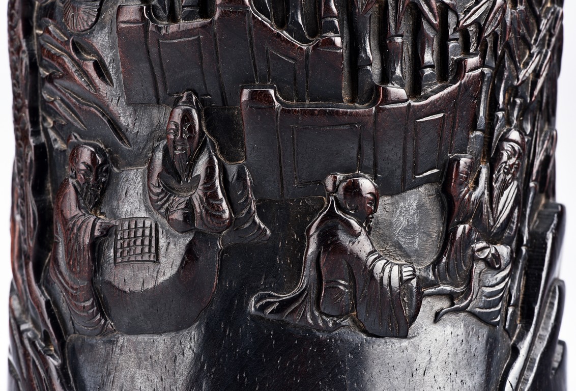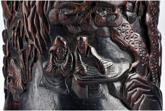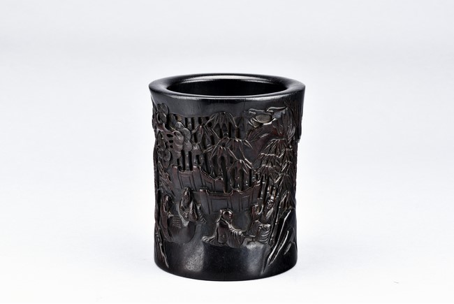 Of cylindrical form, the exterior carved in relief with the story of 'seven sages of bamboo grove', each with different pose and activity, all with leisurely pursuit within an outdoor landscape scene. Qing Dynasty period.