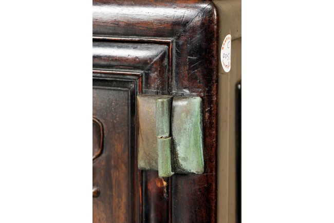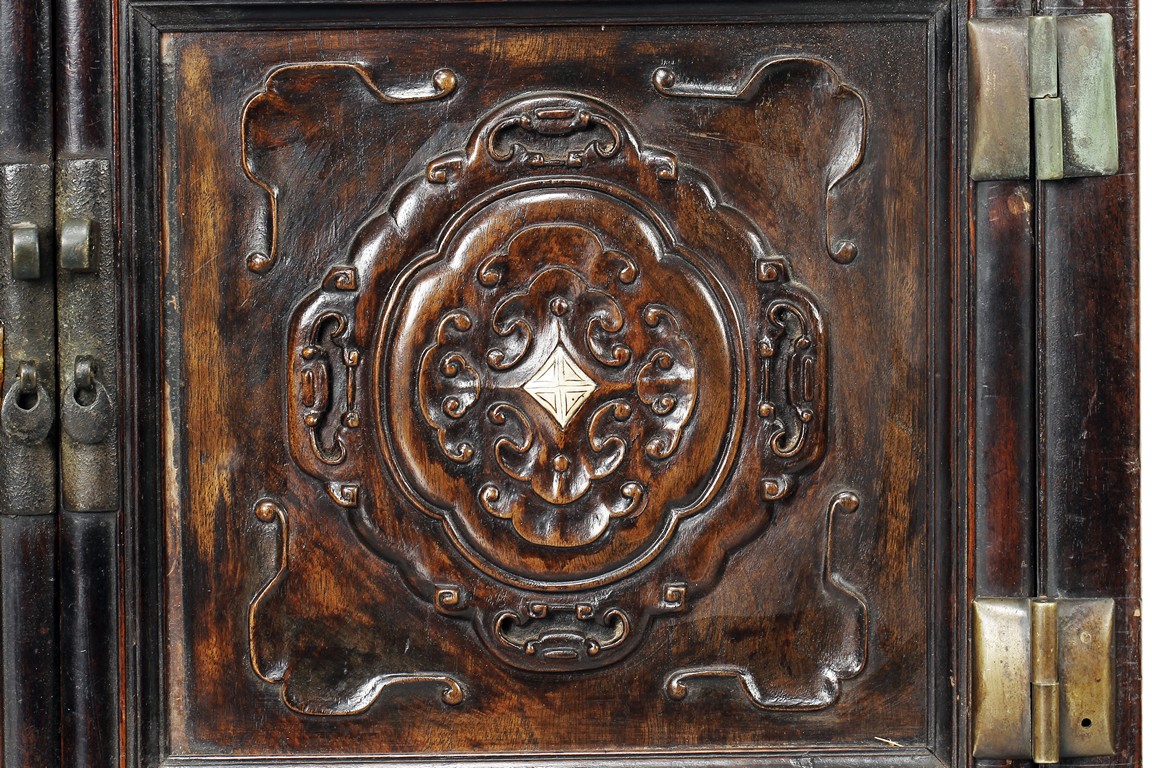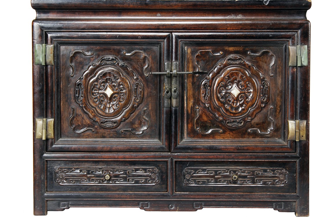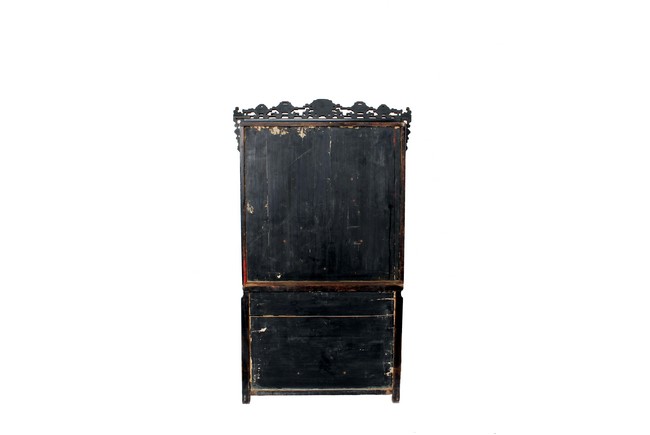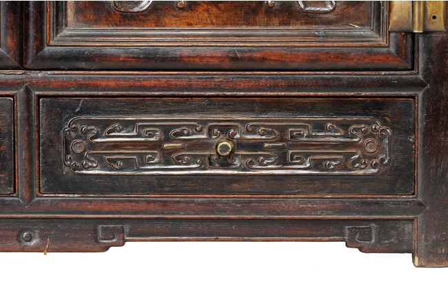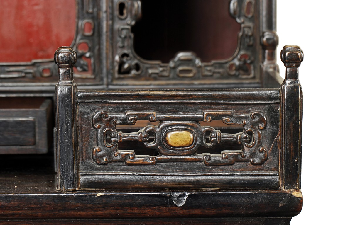 Of rectangular form, the wooden altar's center is to hold and display the Buddha figure, seven smaller openings surrounds the larger center opening, each with pierce carved skirt, three small drawers right below, with rail and space reserved for offerings, additional cabinet space and drawers below, carved with flower and other stylized patterns, with bronze hinges and lock. Wood with natural color and grain, some age related wear and damage. Qing Dynasty period.