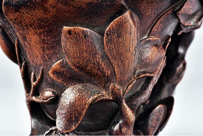 Carved and pierced as a gnarle trunk with foliate branches winding around the cup body.