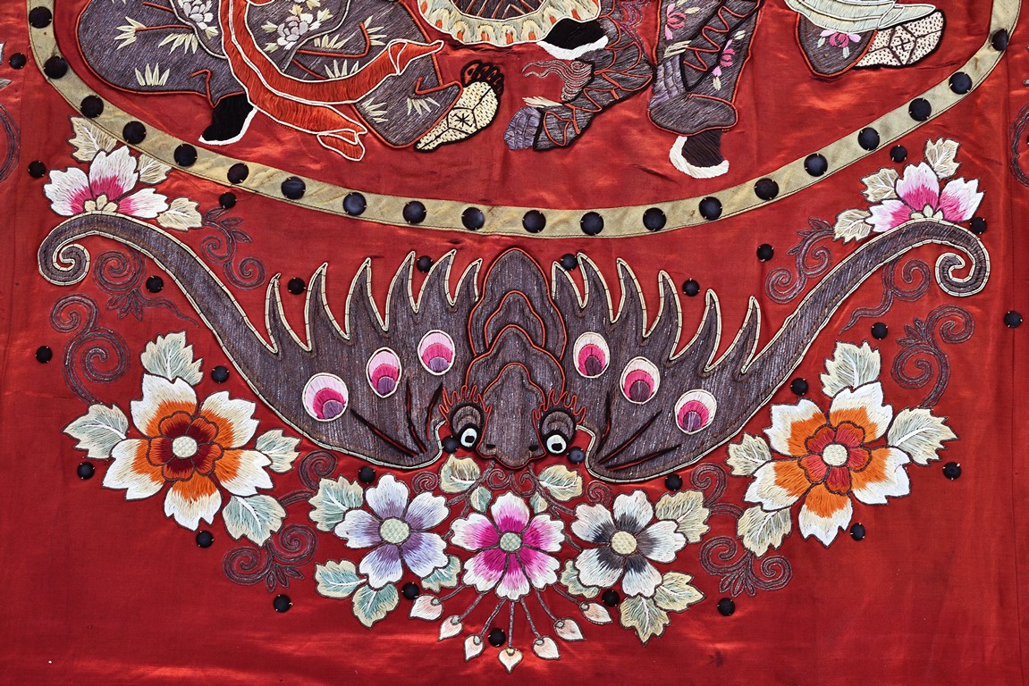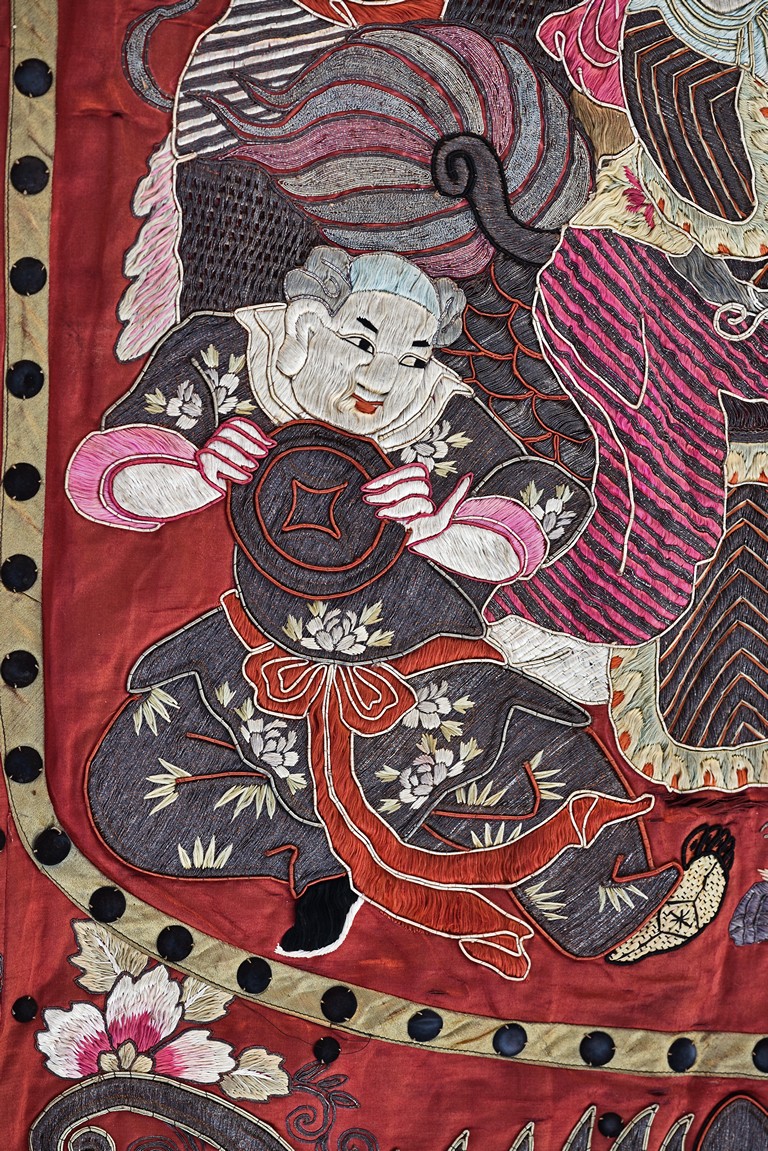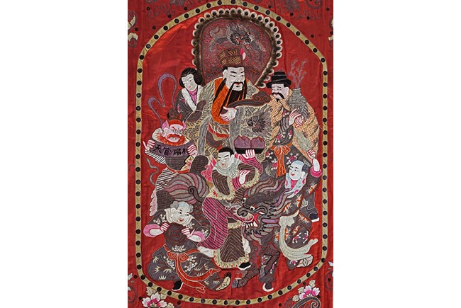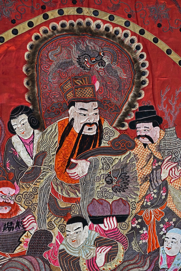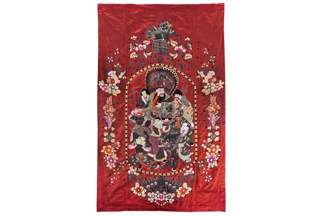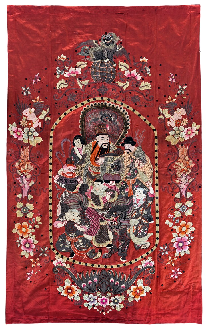 The embroidery depicts an immortal in official's dress, holding a ruyi scepter, wearing elaborate robe with dragon motif, surrounded by attendants in different postures and holding different objects, enclosed by dotted thread, further surrounding by auspicious symbols of bat, buddhist lion, and fishes amid scrolling floral pattern. Qing Dynasty period.