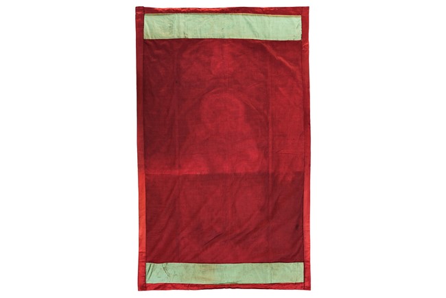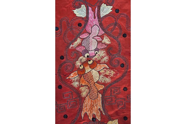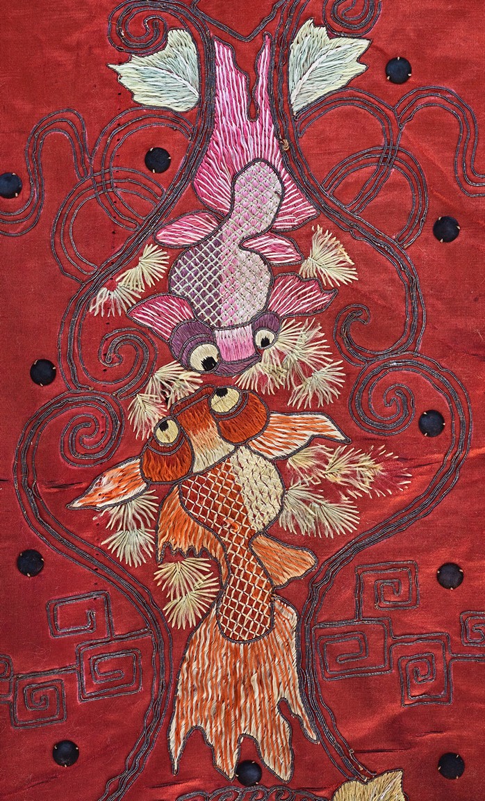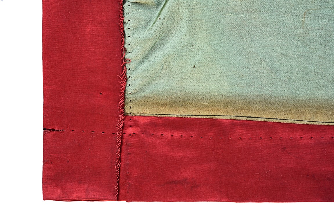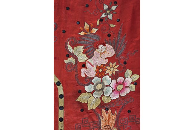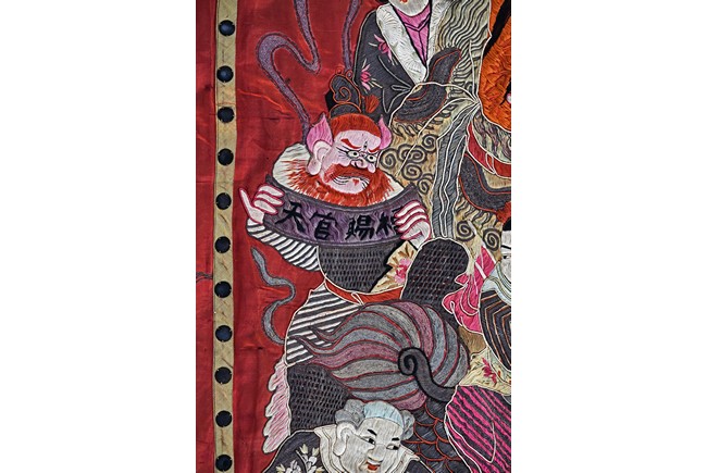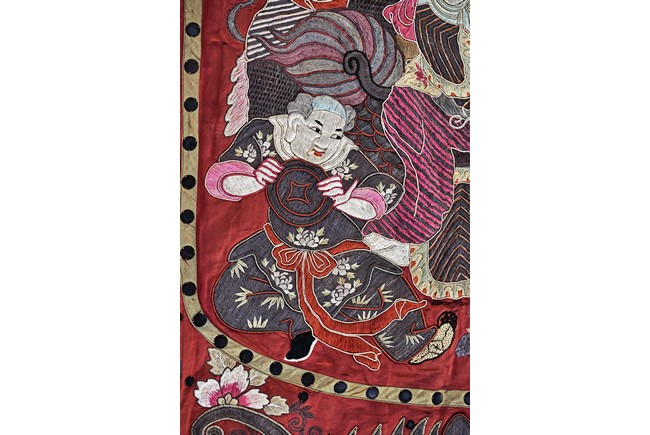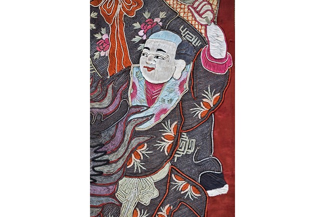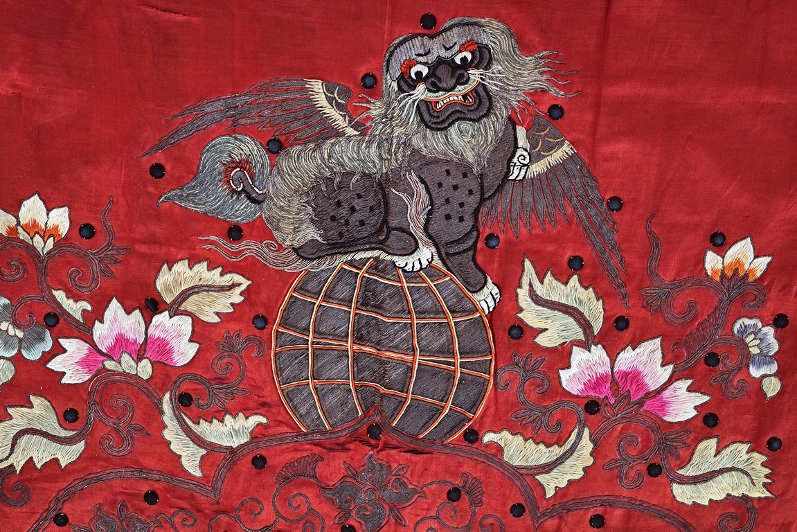 The embroidery depicts an immortal in official's dress, holding a ruyi scepter, wearing elaborate robe with dragon motif, surrounded by attendants in different postures and holding different objects, enclosed by dotted thread, further surrounding by auspicious symbols of bat, buddhist lion, and fishes amid scrolling floral pattern. Qing Dynasty period.