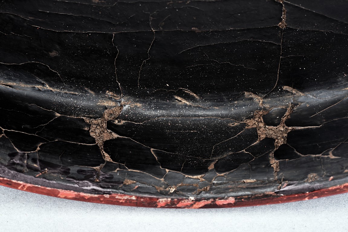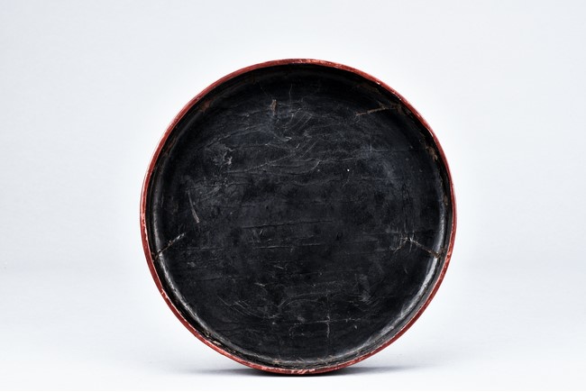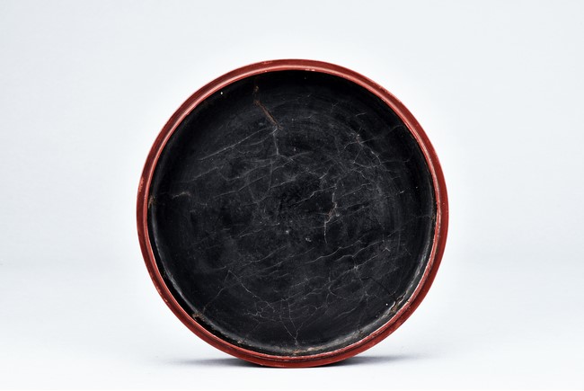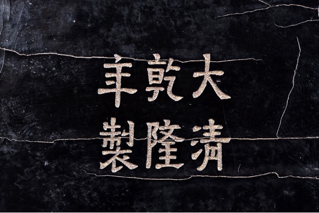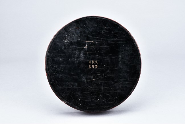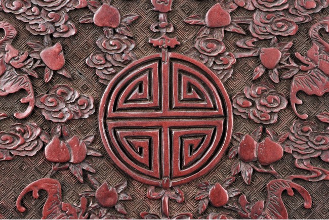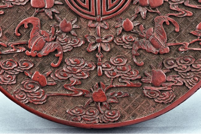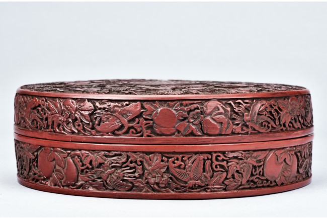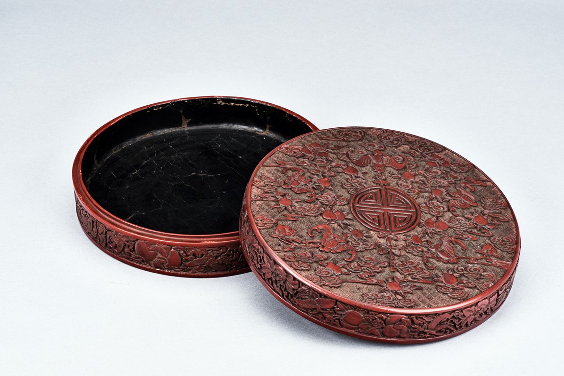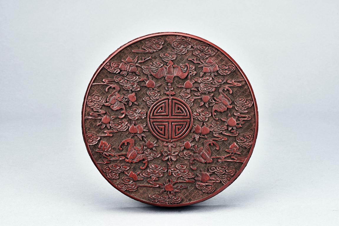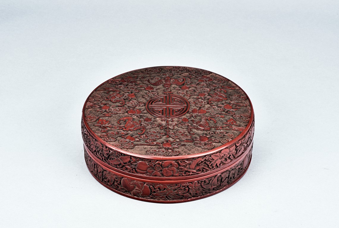 The cover carved in relief with a stylized shou character flanked by five bats amid auspicious motifs of clouds and peaches, all reserved on a geometric diaper ground, the sides with continuous design of butterflies and leafy peaches. The bottom incised and gilded with six character 'Qianlong' mark.