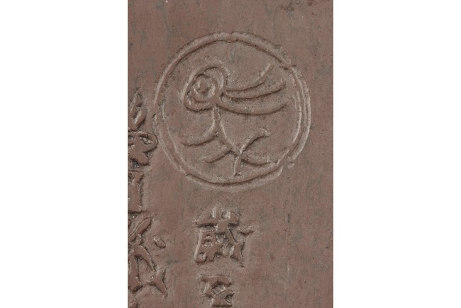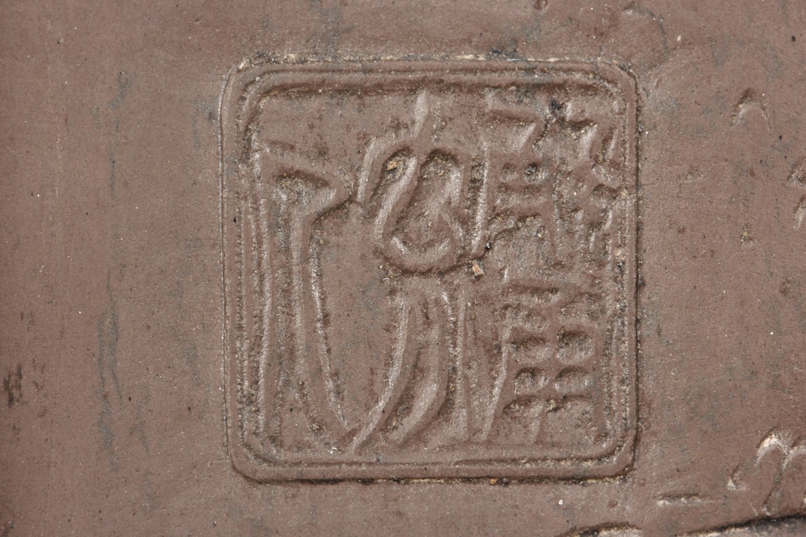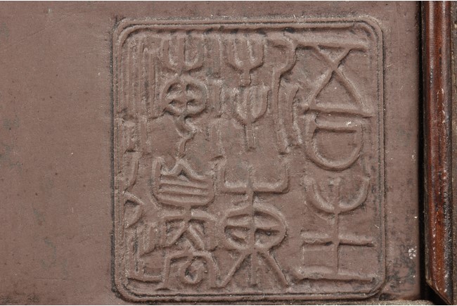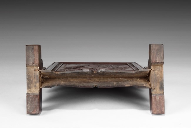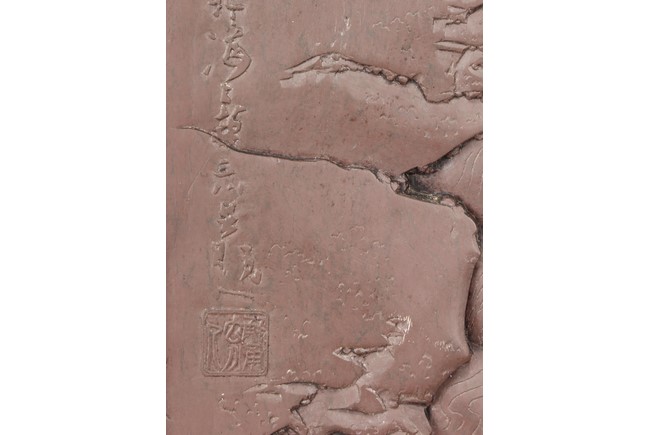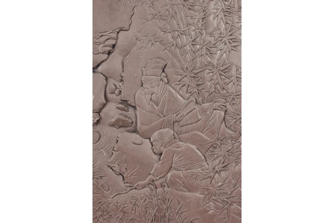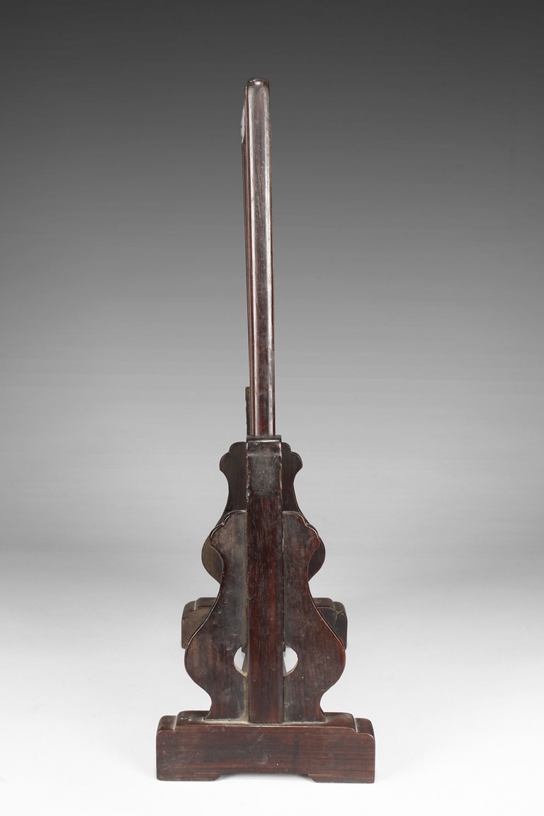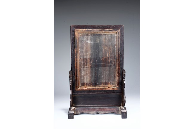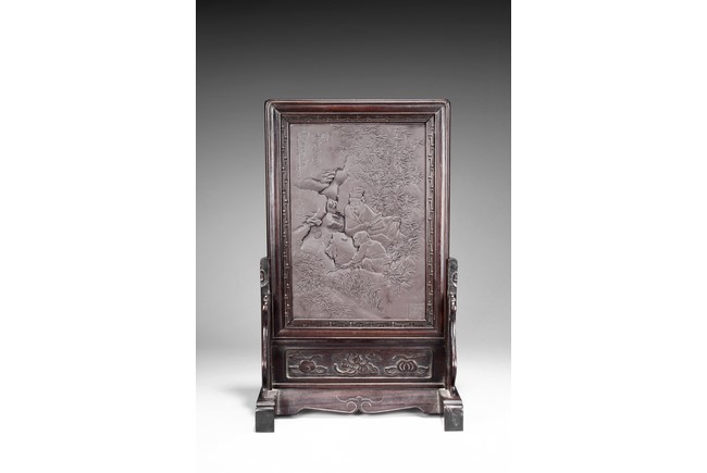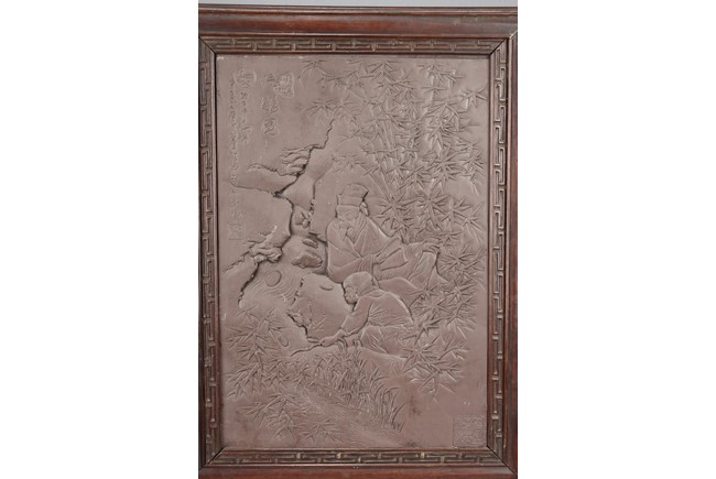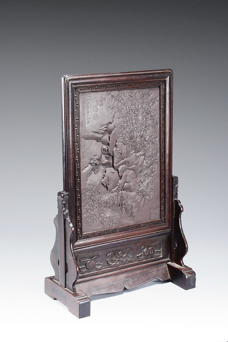 Of rectangular form, the Duan stone plaque depicts an elder and child in a riverside setting, resting near bamboo trees close to downstream , with poetry calligraphy and artist signature on top left, all enclosed in carved wooden frame, inset in original wooden stand, the front low relief carved with lotus flower and plants, the reverse in plain design. Qing Dynasty period.
