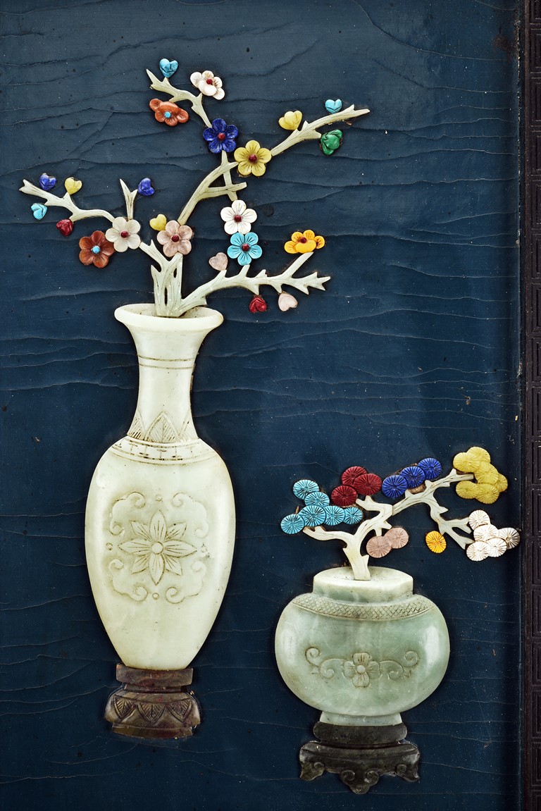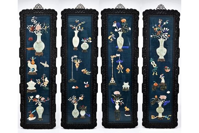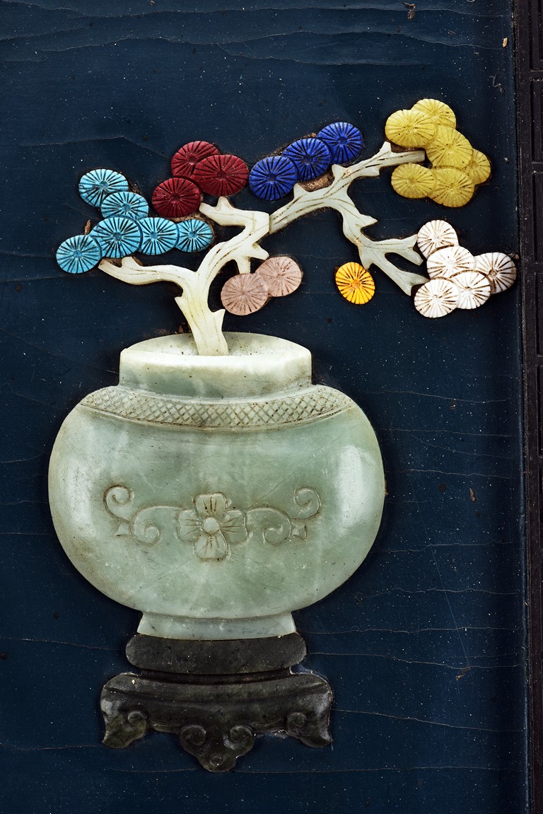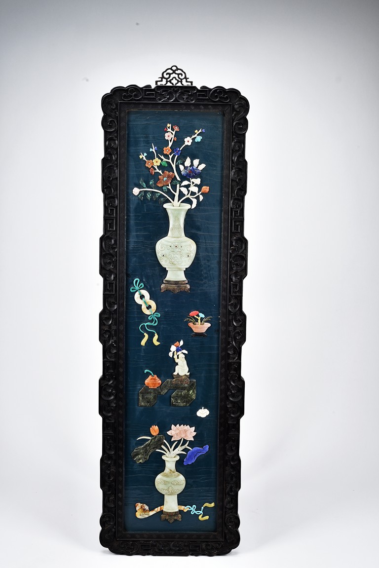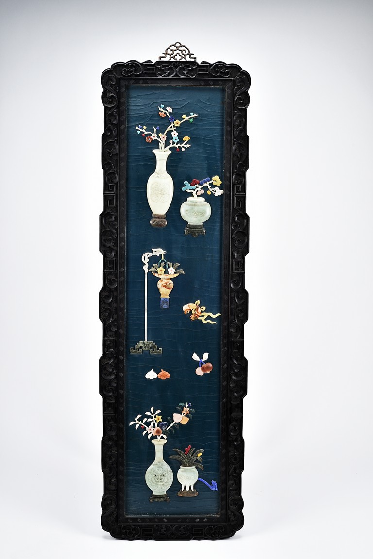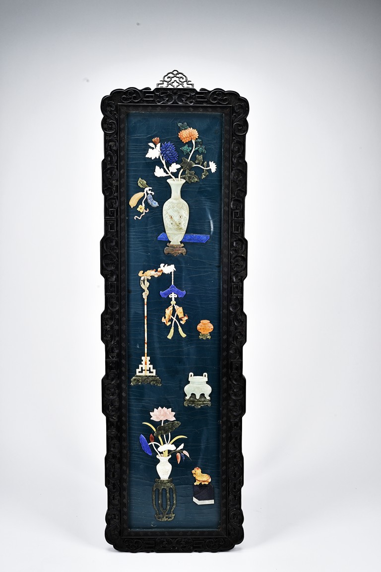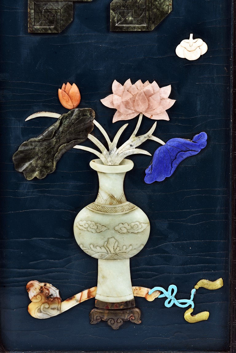 Each panel inlaid with a variety of precious and semi-precious objects and vessesls, including white jade vase, celadon jade vase containing lapis lazuli flower and yellow jade leave, all supported on spinach jade stands, reserved on blue lacquer ground, the hardwood frame with key-fret and scrolling motif.