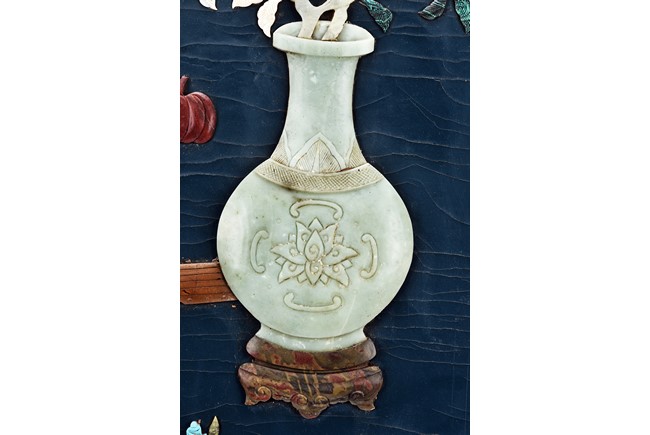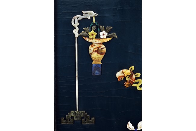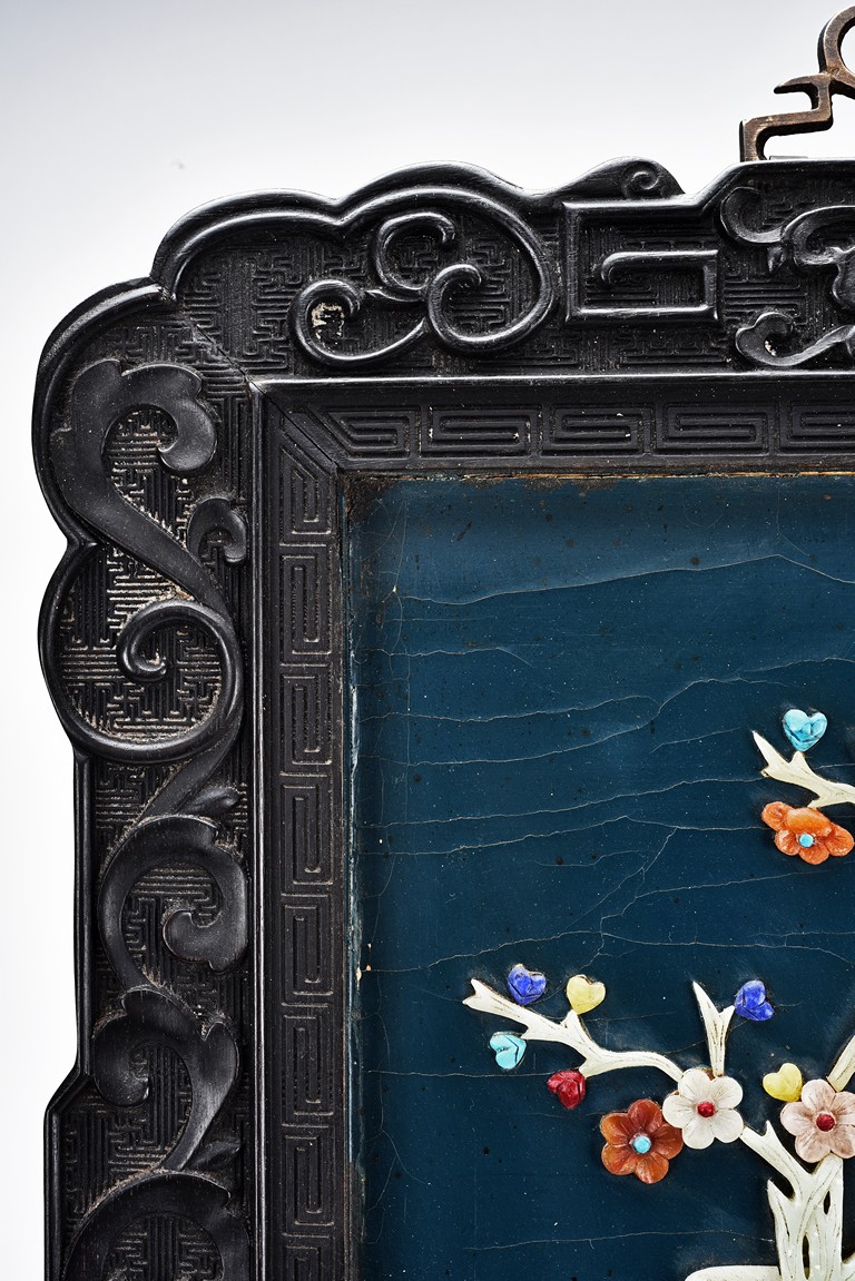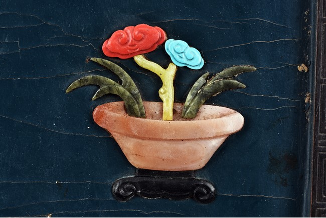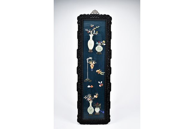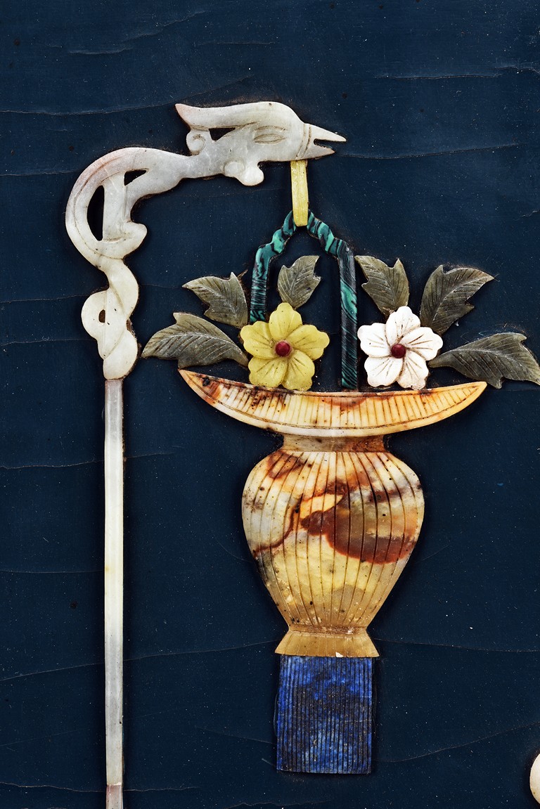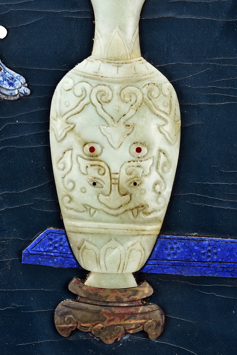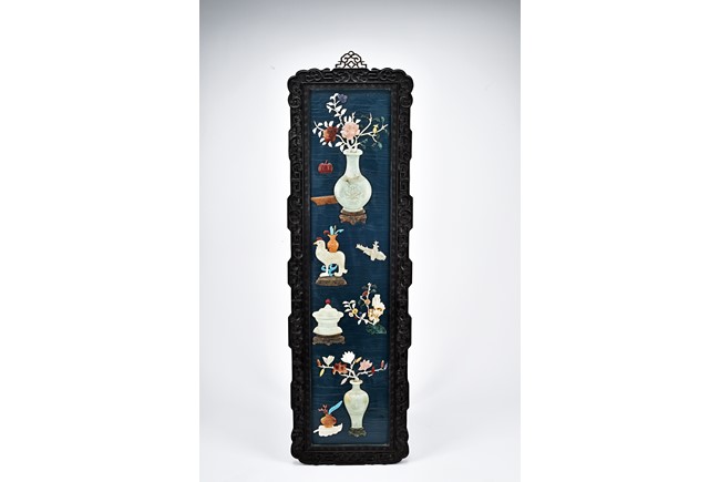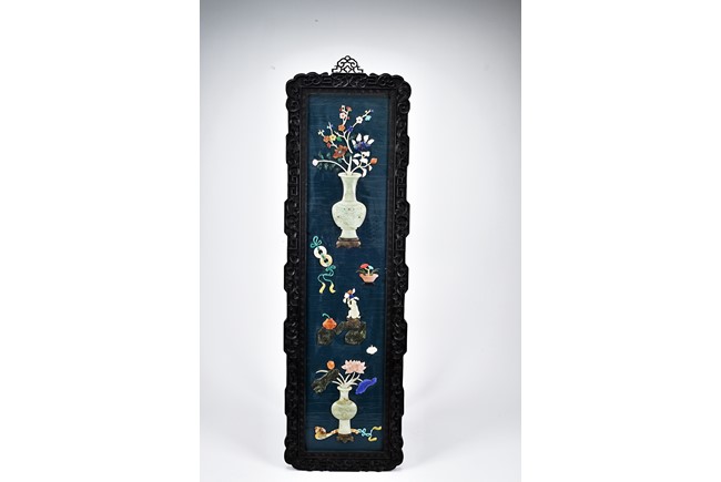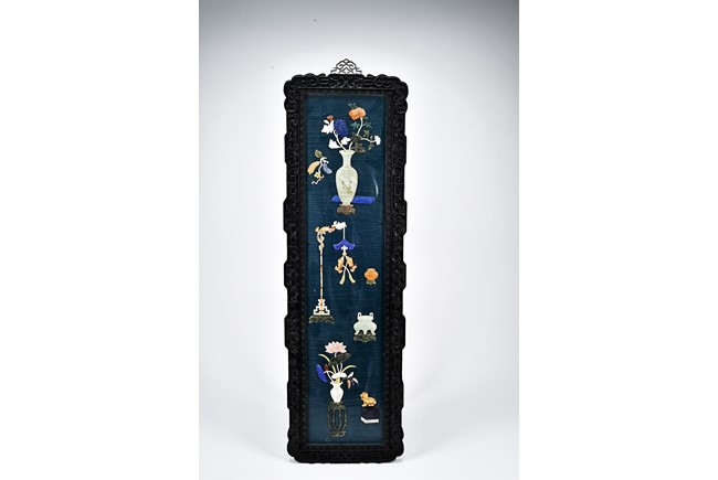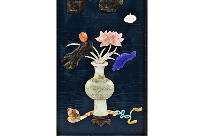 Each panel inlaid with a variety of precious and semi-precious objects and vessesls, including white jade vase, celadon jade vase containing lapis lazuli flower and yellow jade leave, all supported on spinach jade stands, reserved on blue lacquer ground, the hardwood frame with key-fret and scrolling motif.