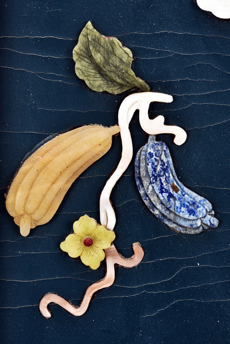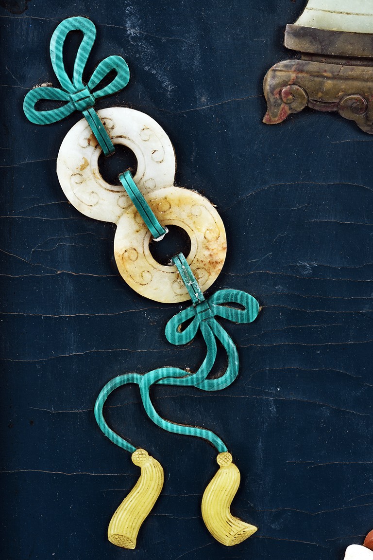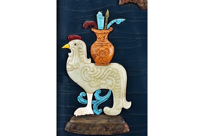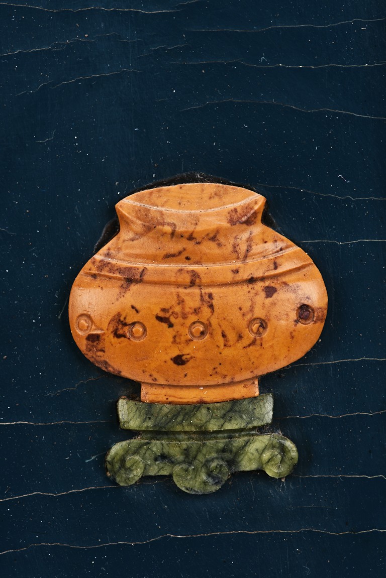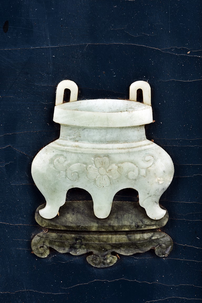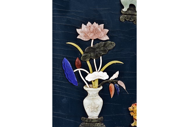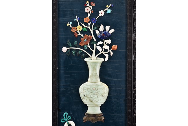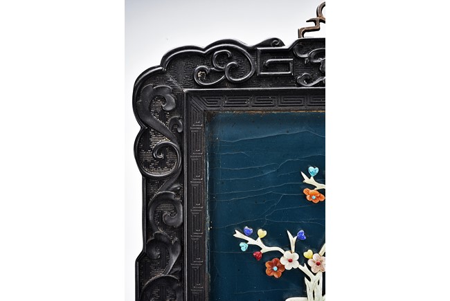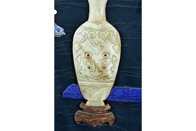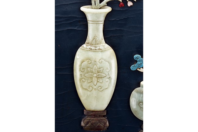 Each panel inlaid with a variety of precious and semi-precious objects and vessesls, including white jade vase, celadon jade vase containing lapis lazuli flower and yellow jade leave, all supported on spinach jade stands, reserved on blue lacquer ground, the hardwood frame with key-fret and scrolling motif.