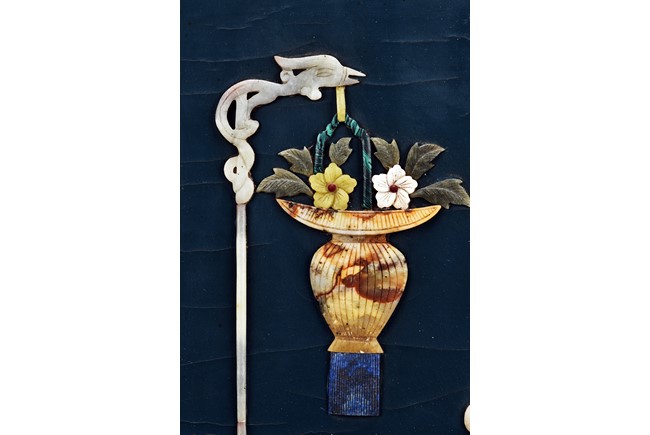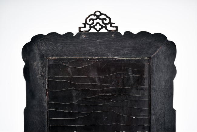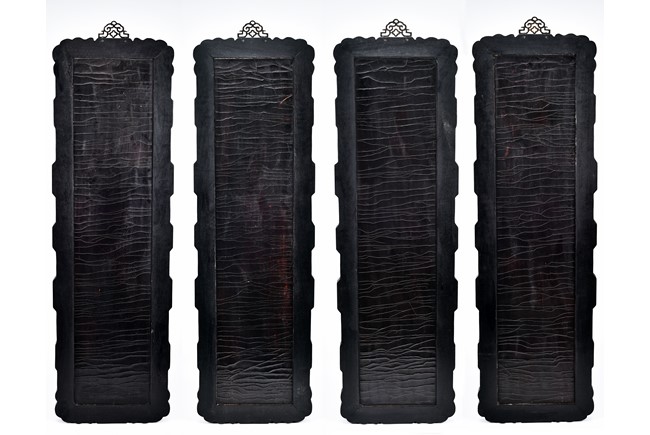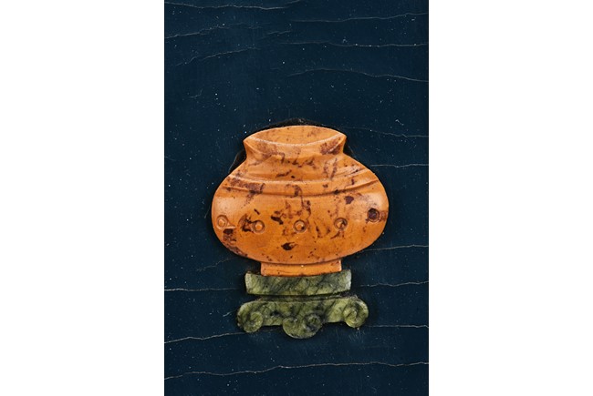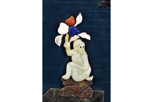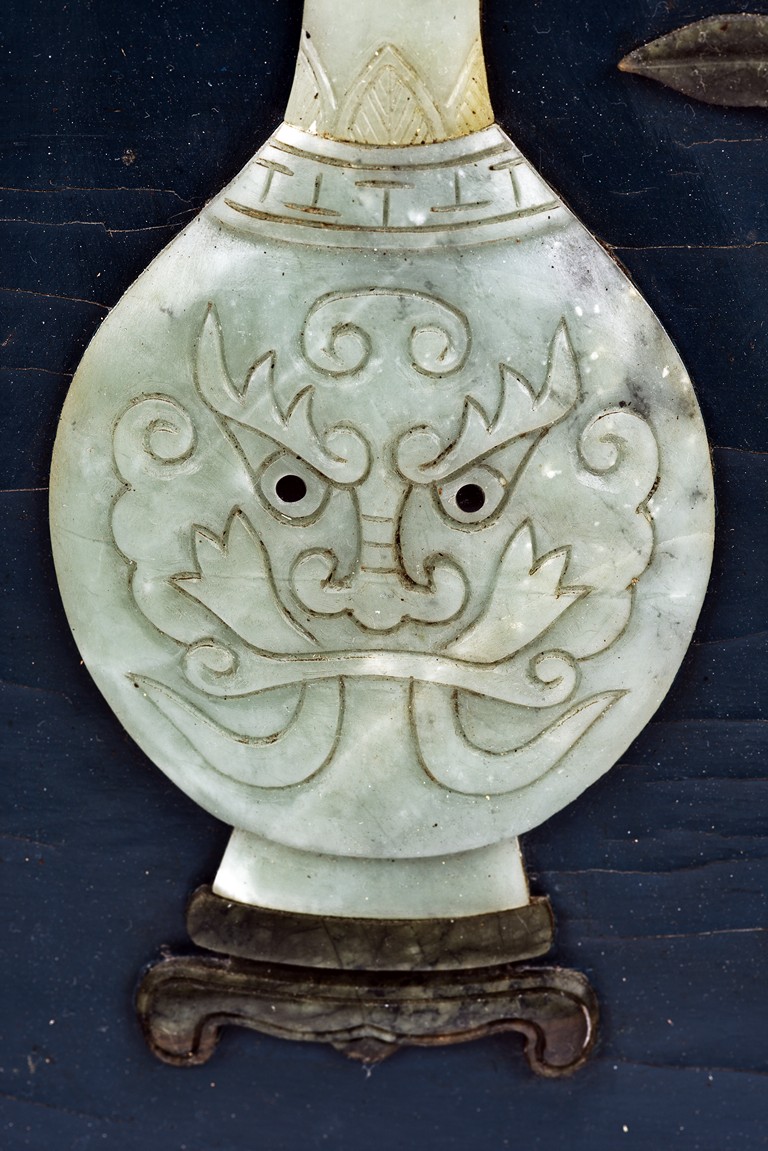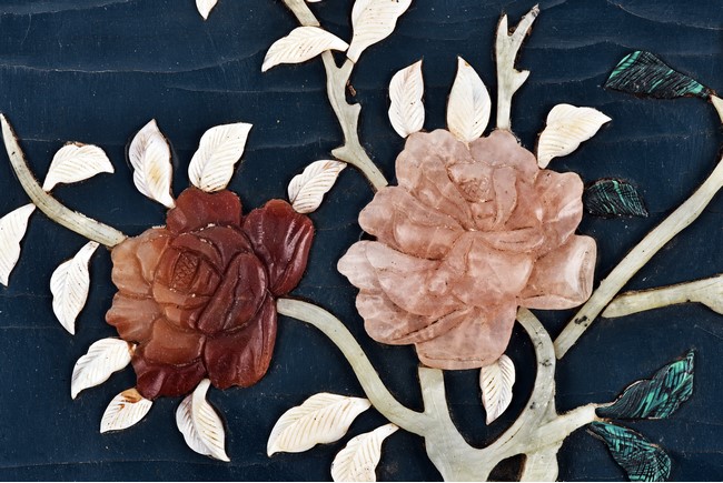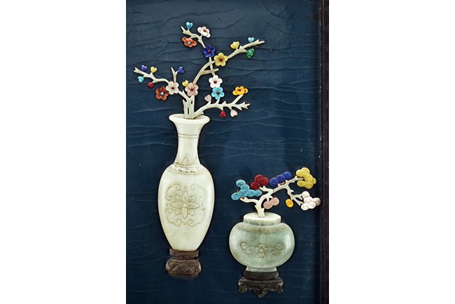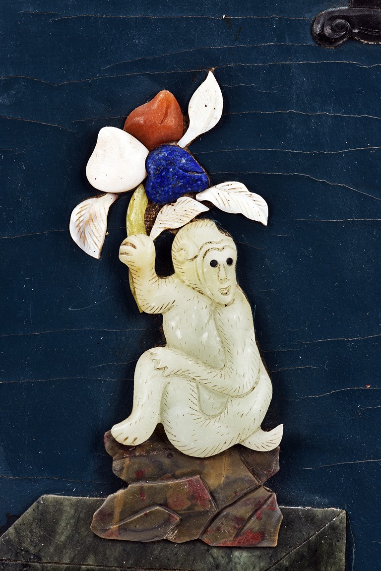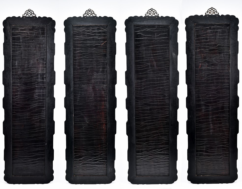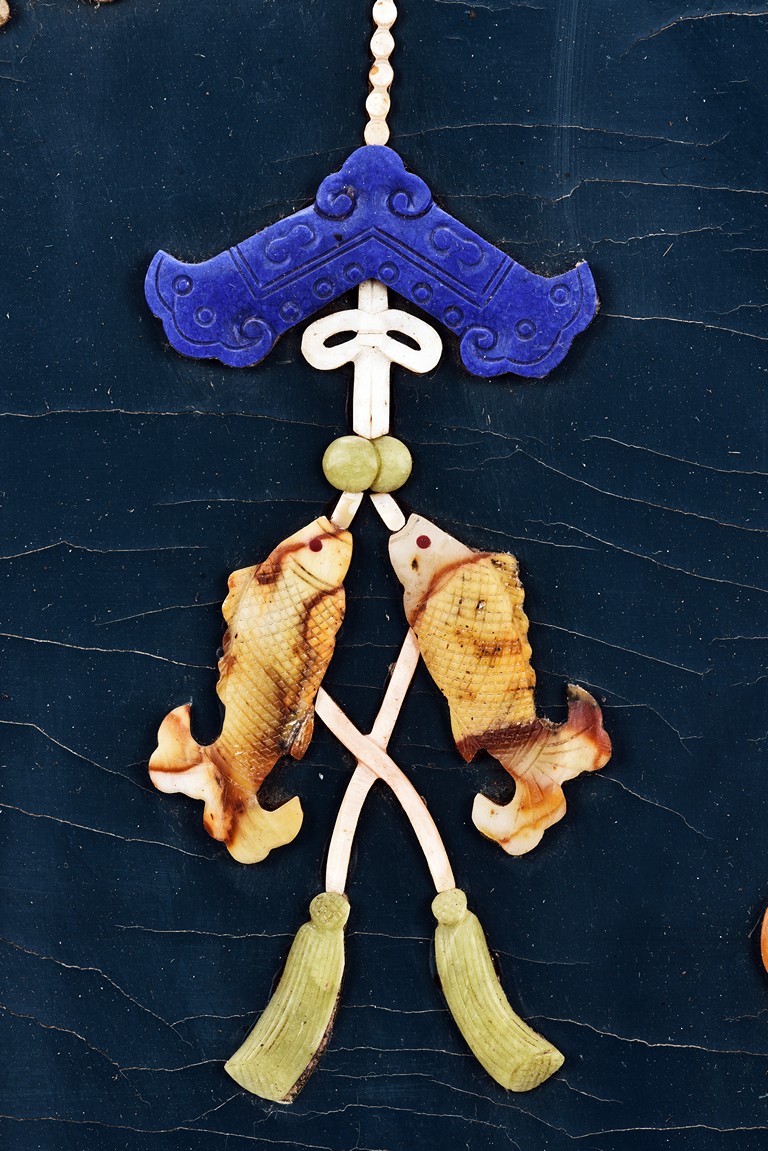 Each panel inlaid with a variety of precious and semi-precious objects and vessesls, including white jade vase, celadon jade vase containing lapis lazuli flower and yellow jade leave, all supported on spinach jade stands, reserved on blue lacquer ground, the hardwood frame with key-fret and scrolling motif.