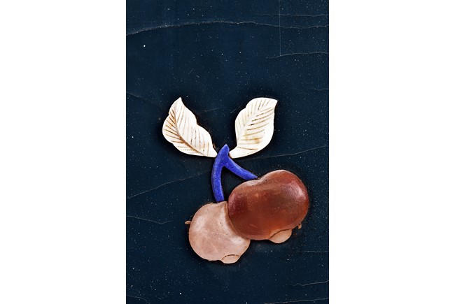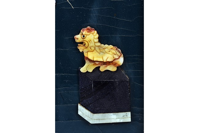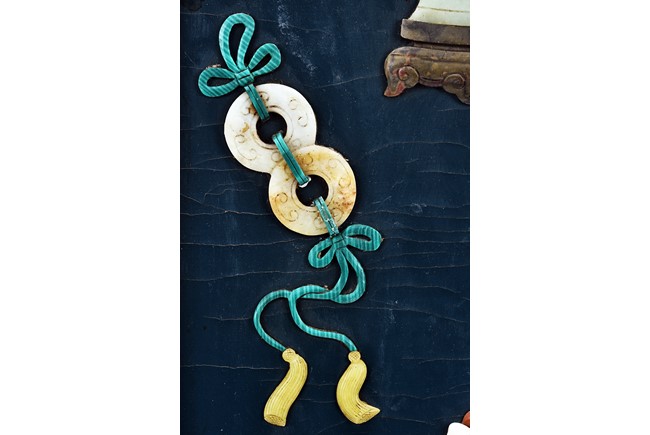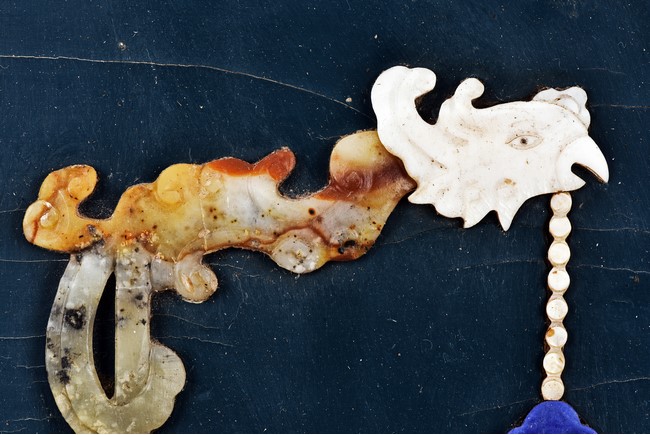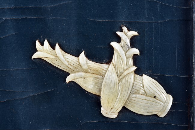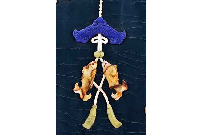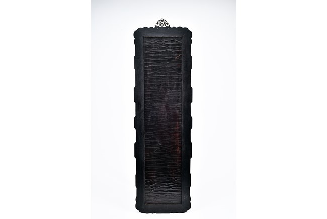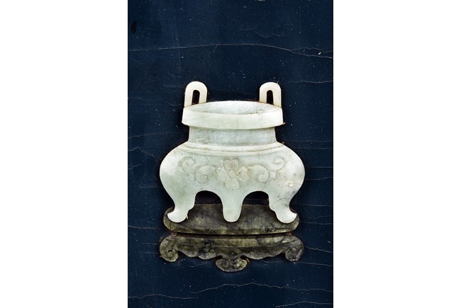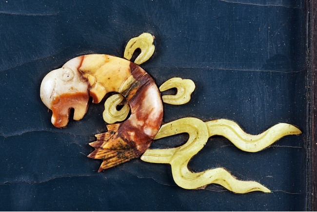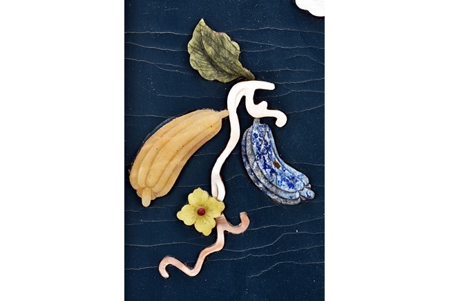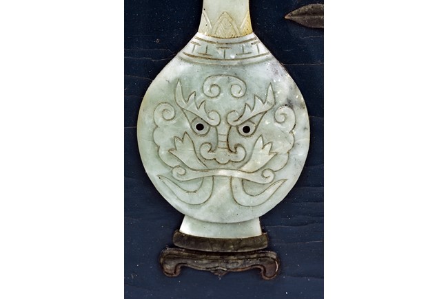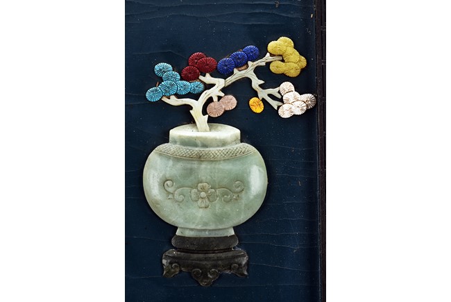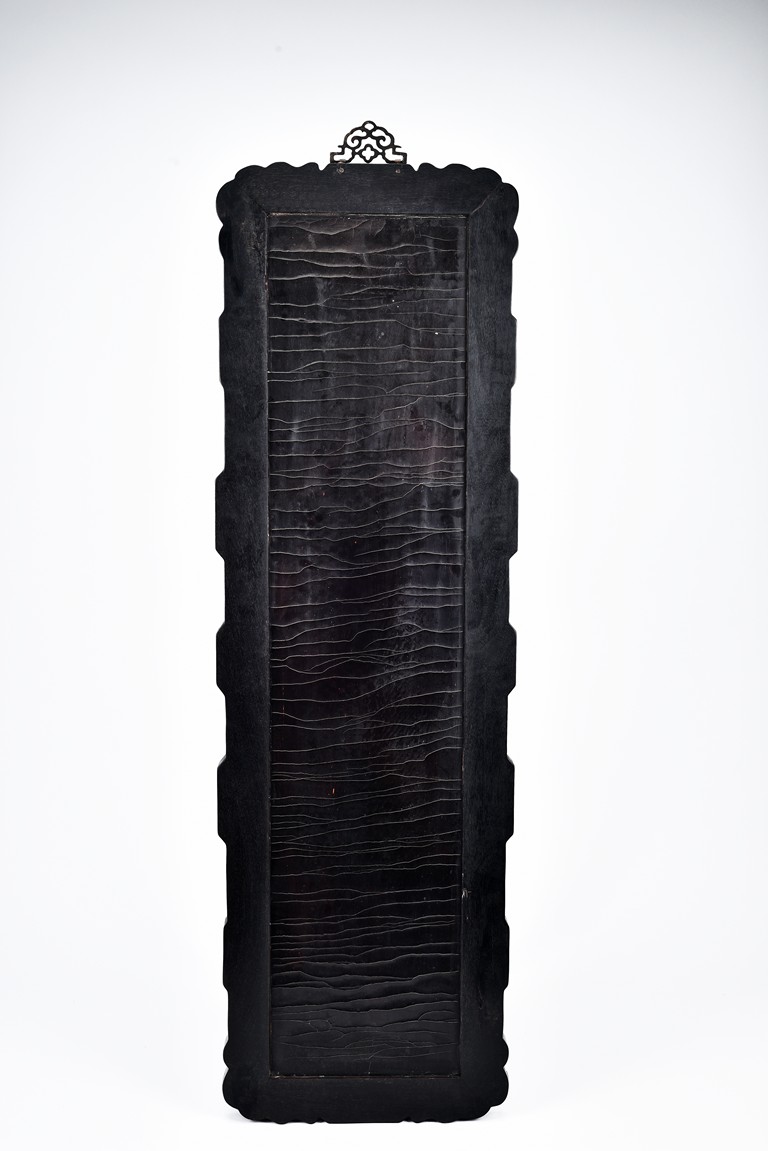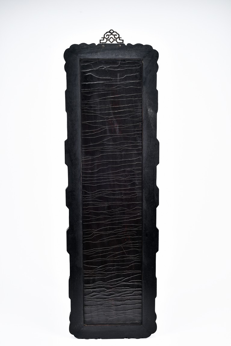 Each panel inlaid with a variety of precious and semi-precious objects and vessesls, including white jade vase, celadon jade vase containing lapis lazuli flower and yellow jade leave, all supported on spinach jade stands, reserved on blue lacquer ground, the hardwood frame with key-fret and scrolling motif.