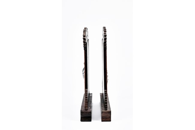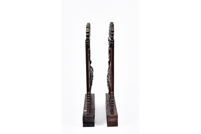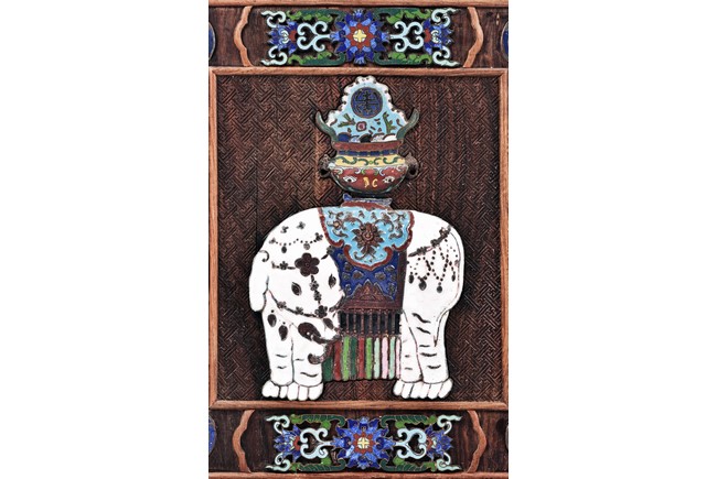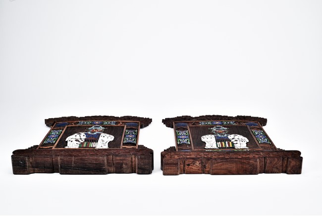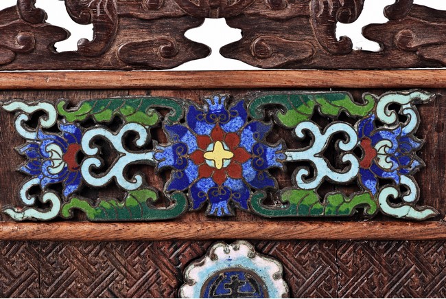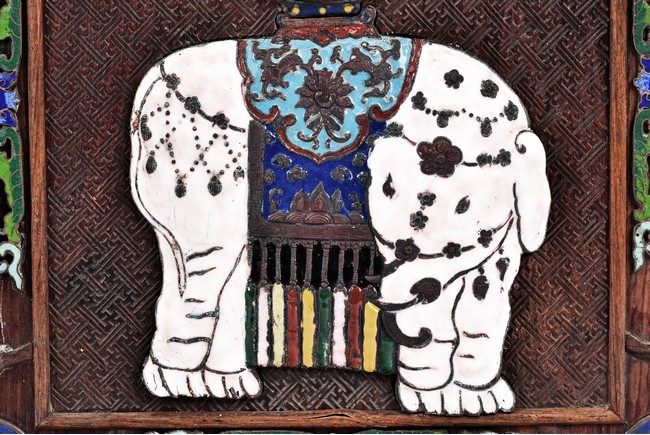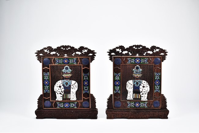 Set on a hongmu stand, each table screen is inlaid with a cloisonne enamel elephant with tilted head, the back surmounted with a treasure vase, all reserved on a diaper ground, the sides decorated with auspicious motif, the top panel pierced with stylized shou character and bats amid auspicious clouds. Qing Dynasty period.