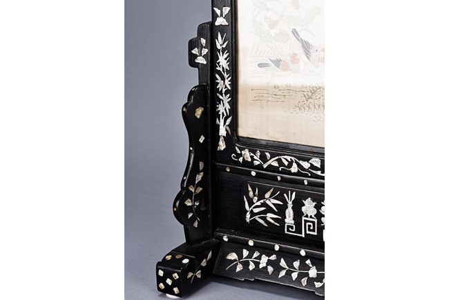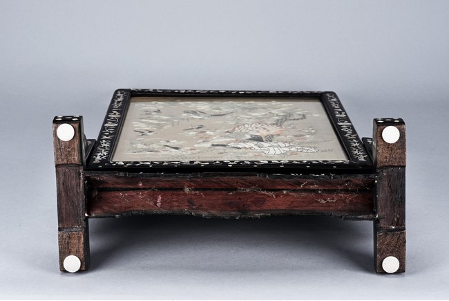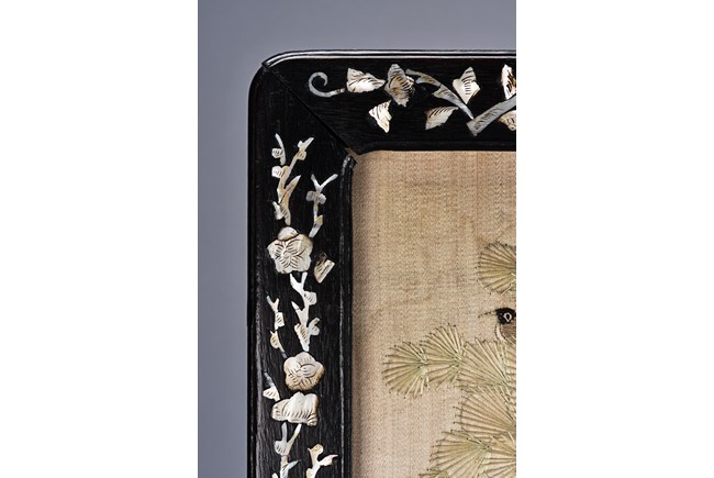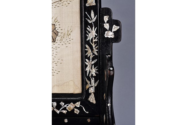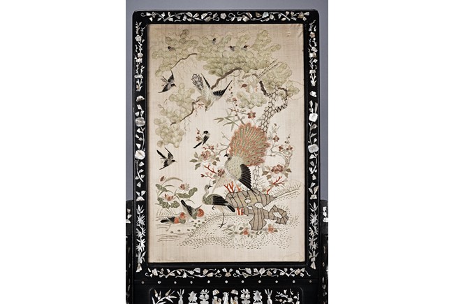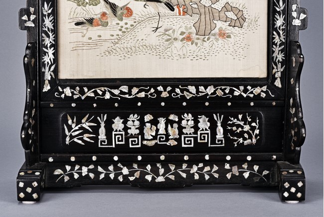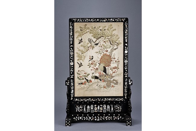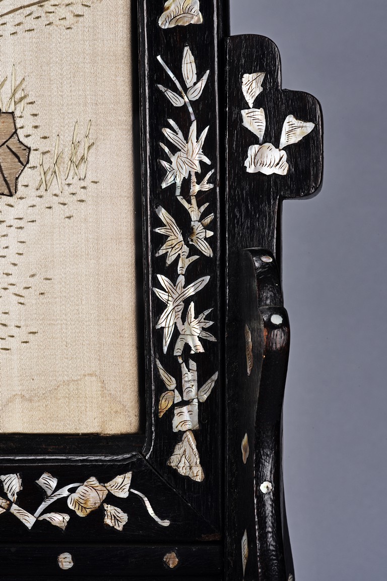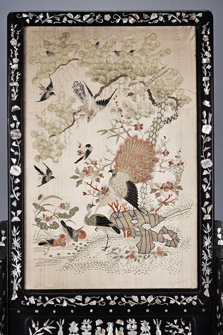 The silk panel is well stitched with various birds, including peacock, eagle, rooster, duck, magpie, all in a pine tree and pond setting, with silk in colors of red, black,green, etc, all aganist the ivory colored silk background. The panel is set on a hardwood frame, embellished with mother-of-pearl decorations depicting scrolling foliage around the panel and auspicious figures on the support stand and around the frame. Qing Dynasty period.