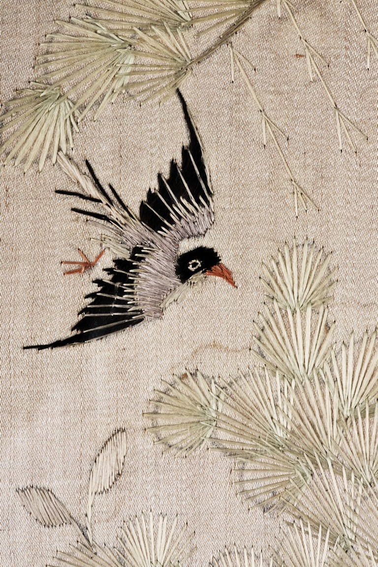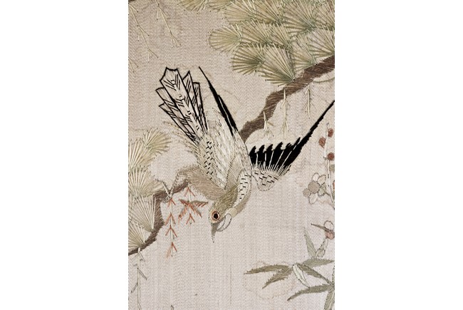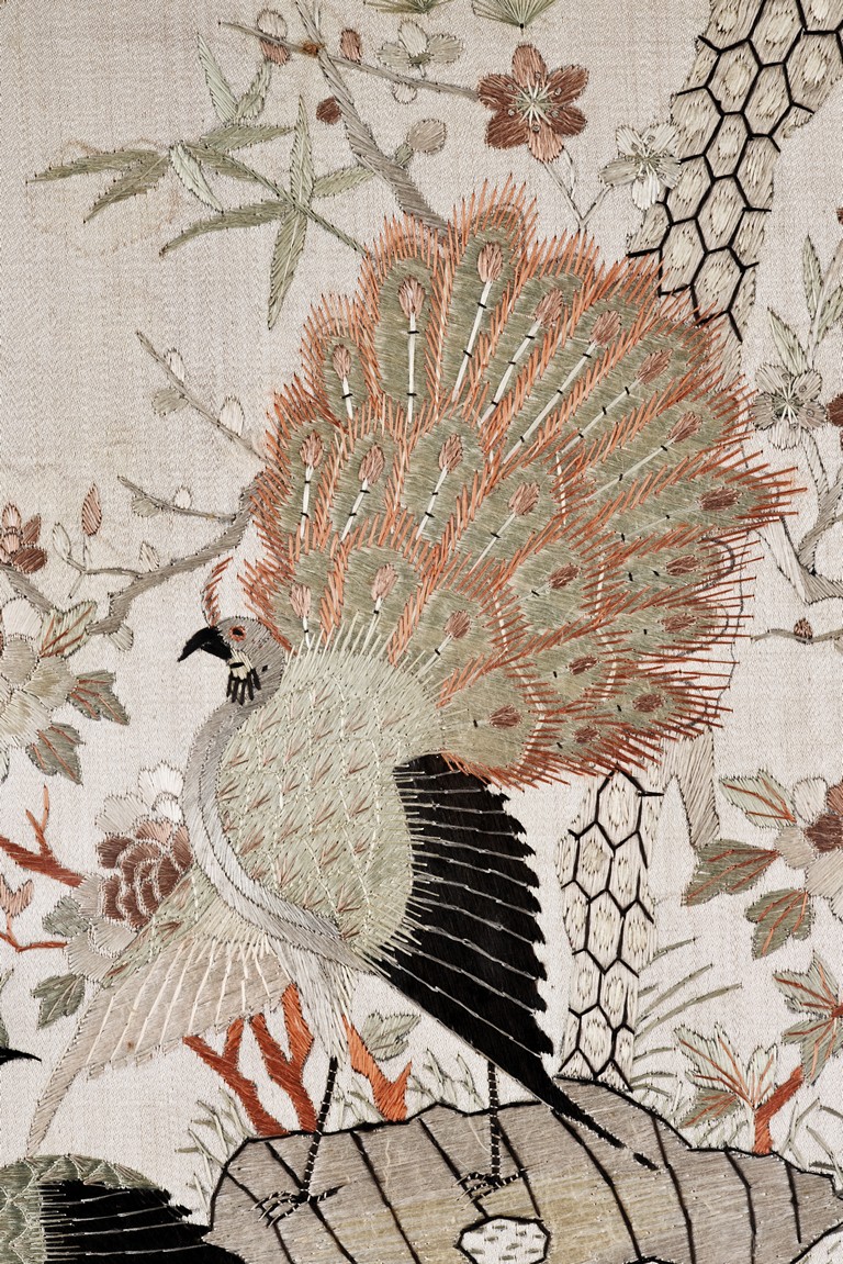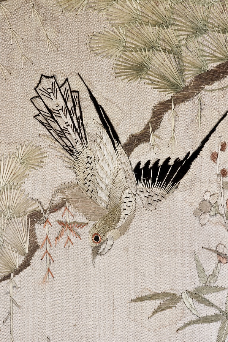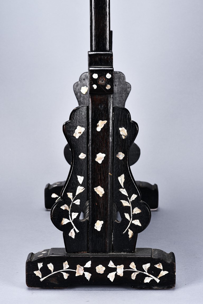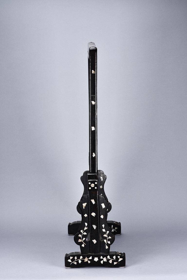 The silk panel is well stitched with various birds, including peacock, eagle, rooster, duck, magpie, all in a pine tree and pond setting, with silk in colors of red, black,green, etc, all aganist the ivory colored silk background. The panel is set on a hardwood frame, embellished with mother-of-pearl decorations depicting scrolling foliage around the panel and auspicious figures on the support stand and around the frame. Qing Dynasty period.