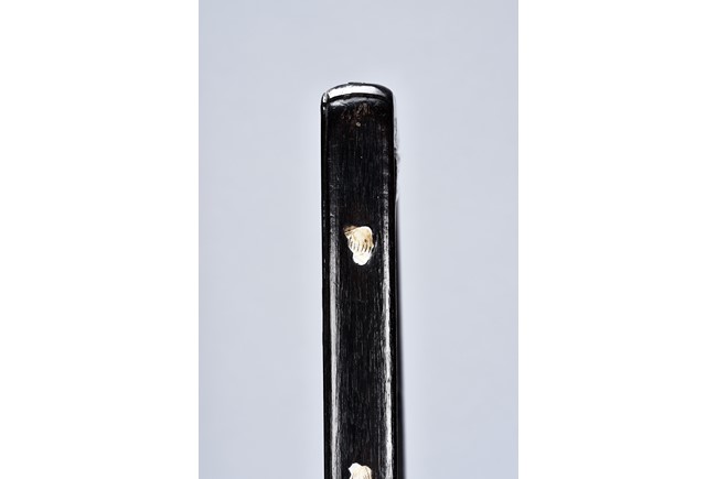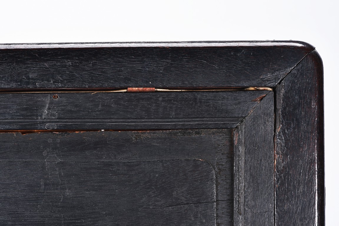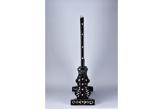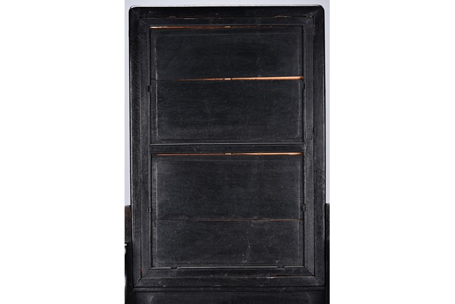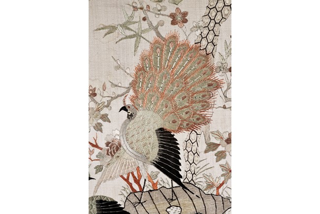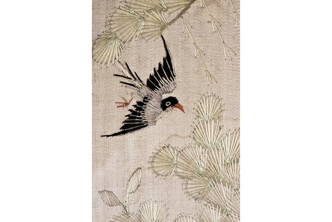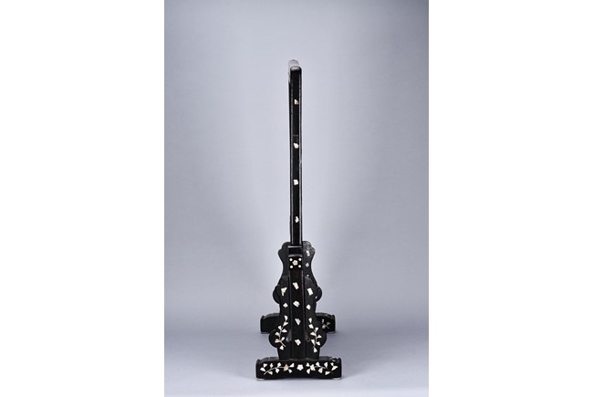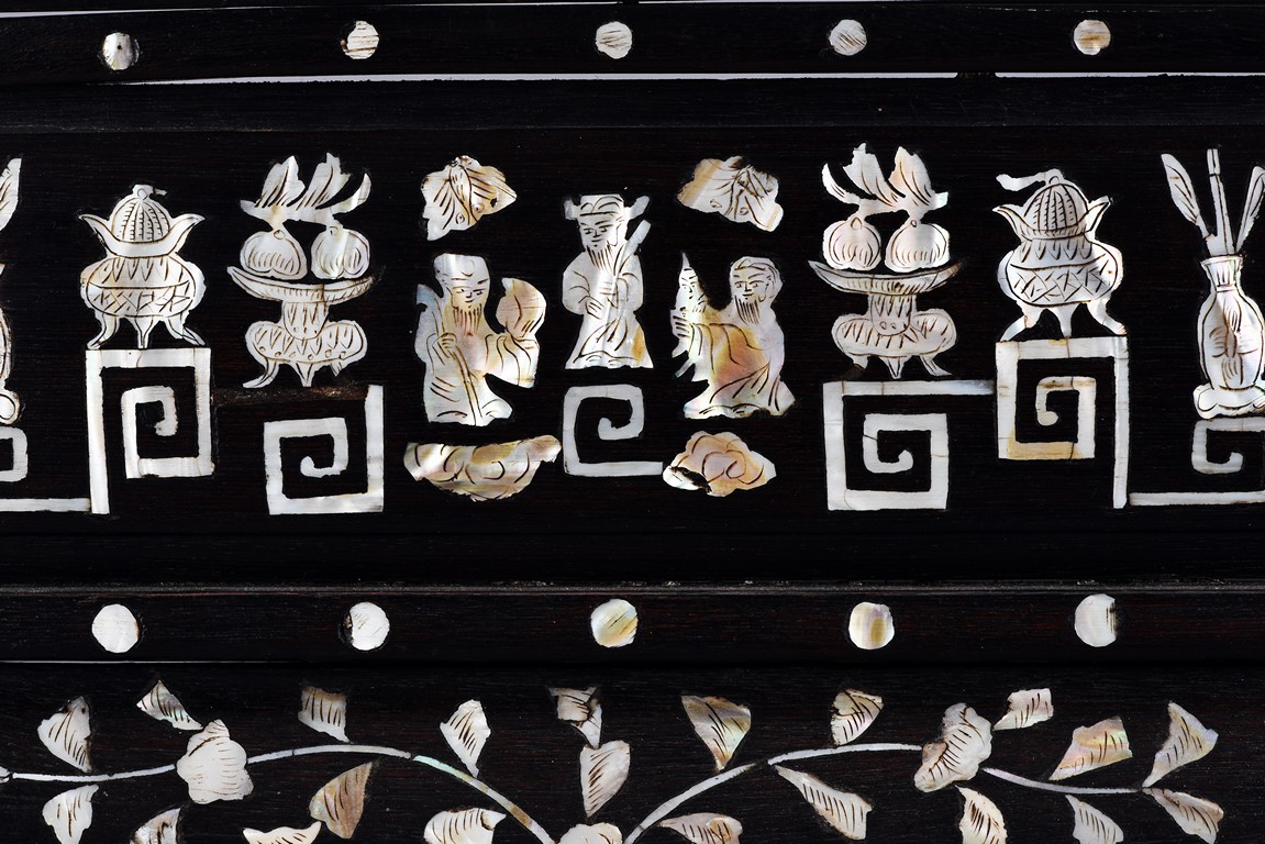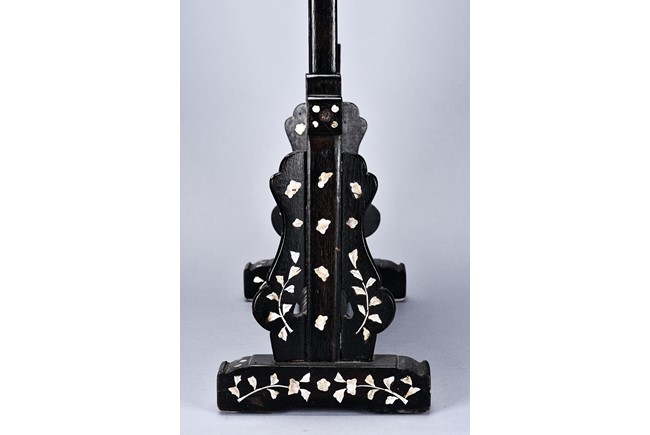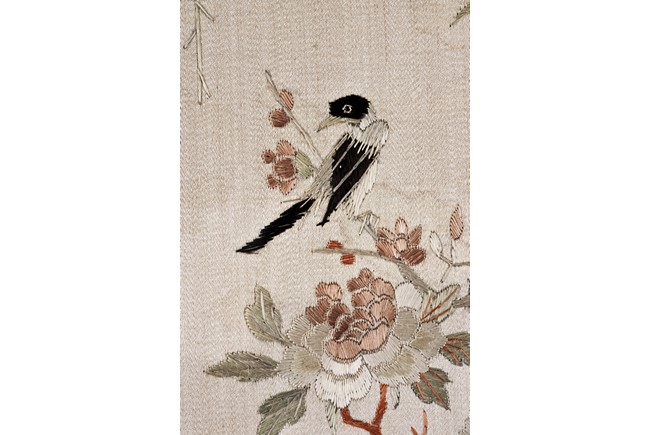 The silk panel is well stitched with various birds, including peacock, eagle, rooster, duck, magpie, all in a pine tree and pond setting, with silk in colors of red, black,green, etc, all aganist the ivory colored silk background. The panel is set on a hardwood frame, embellished with mother-of-pearl decorations depicting scrolling foliage around the panel and auspicious figures on the support stand and around the frame. Qing Dynasty period.