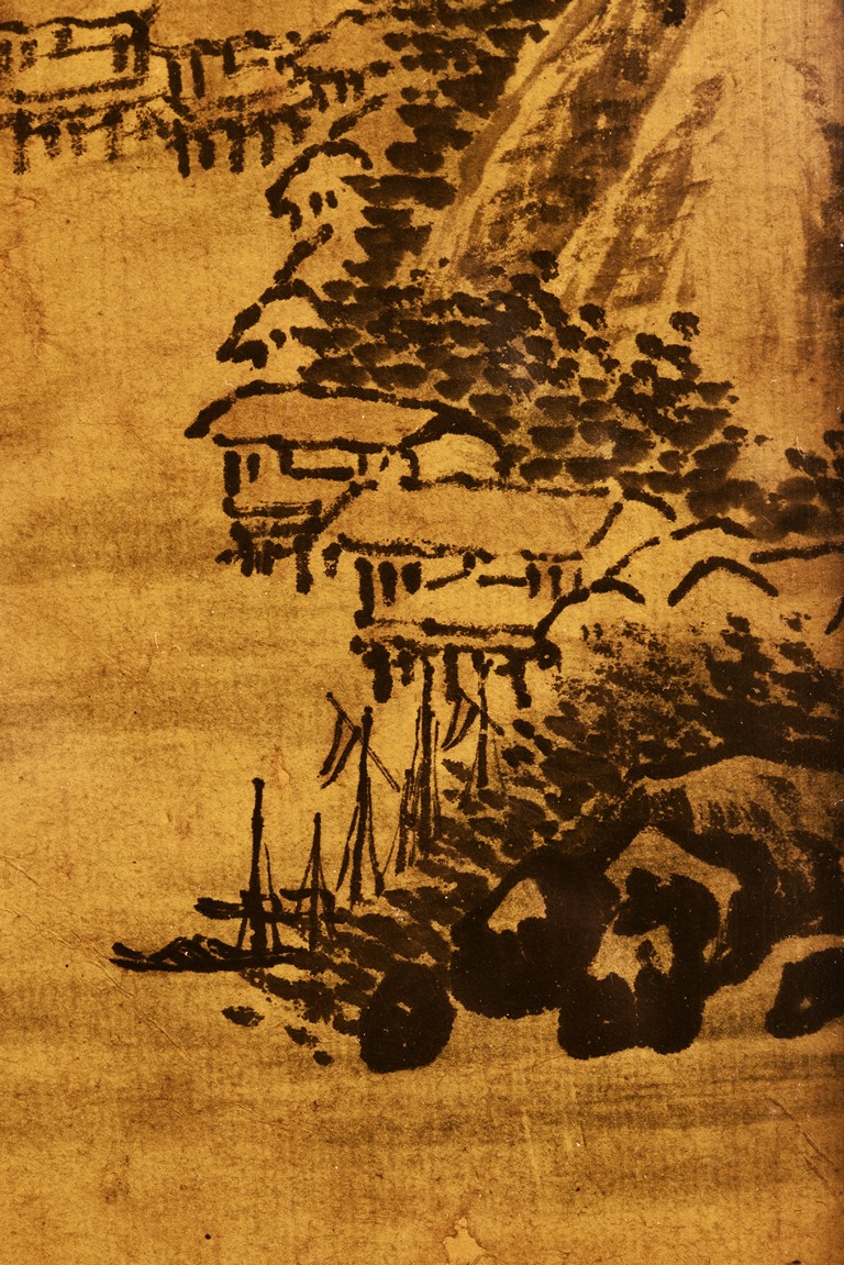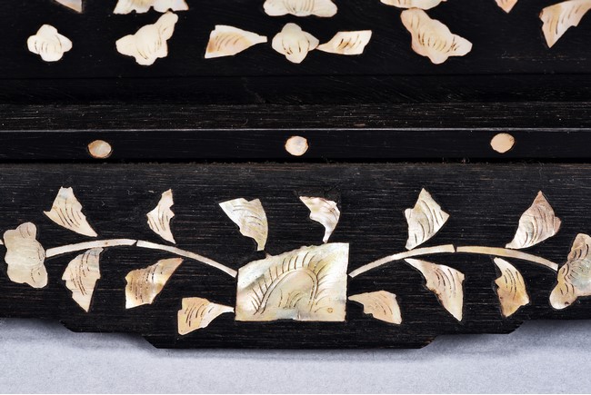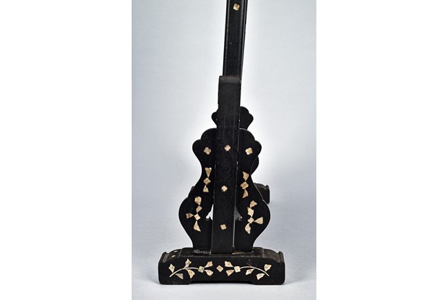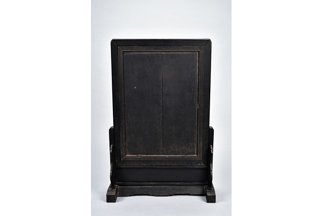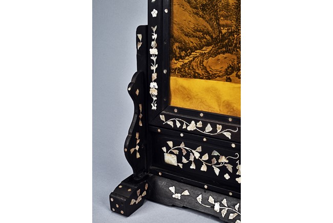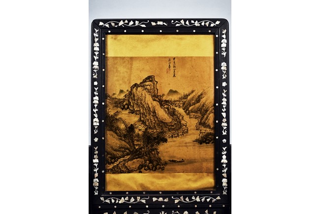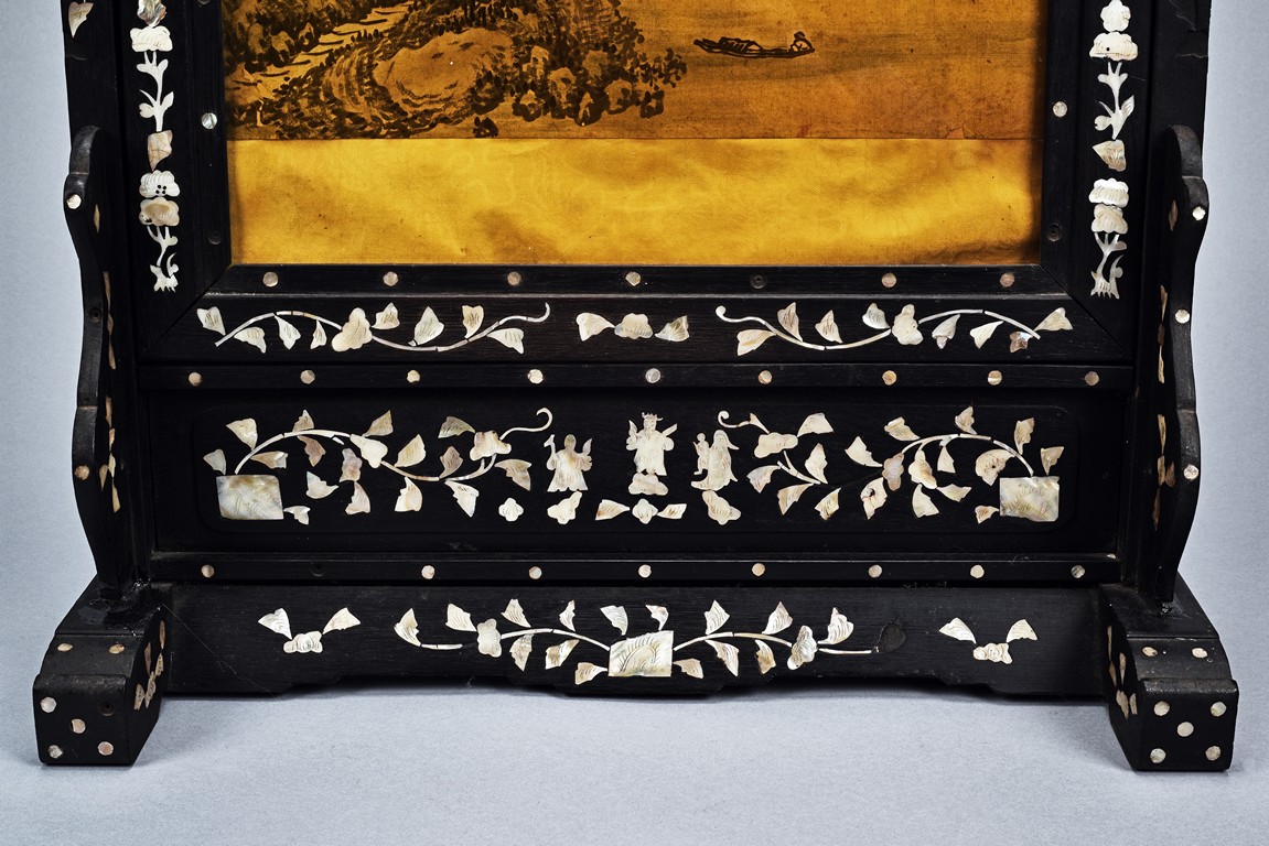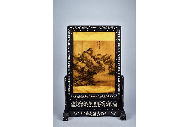 The table screen containing a color and ink on paper painting, with inscription and seal, attributed to Wang Hui, the table screen embellished with mother-of-pearl decoration. Qing Dynasty period.