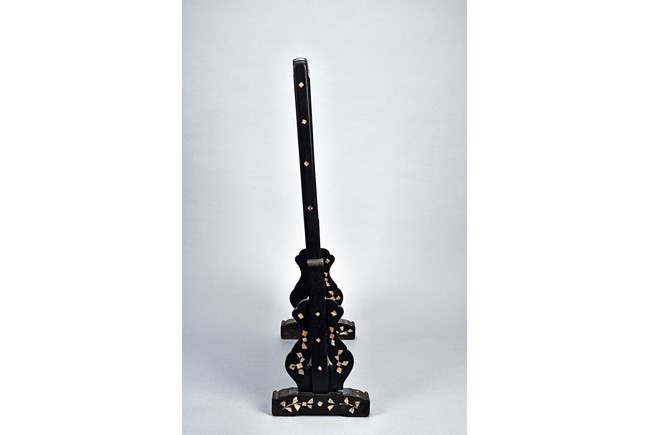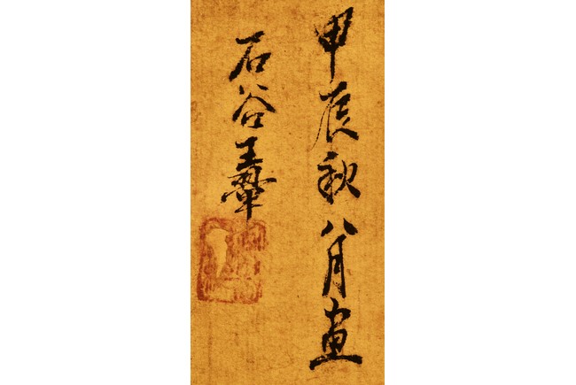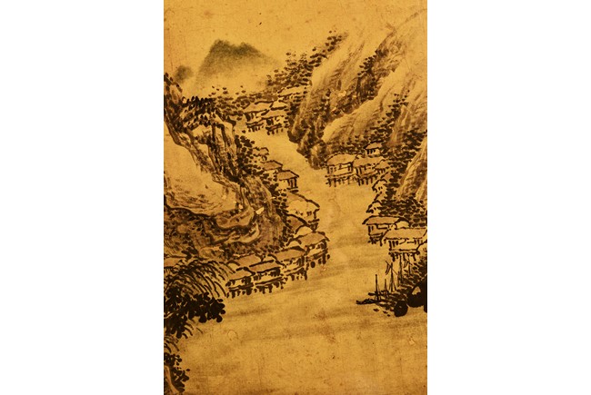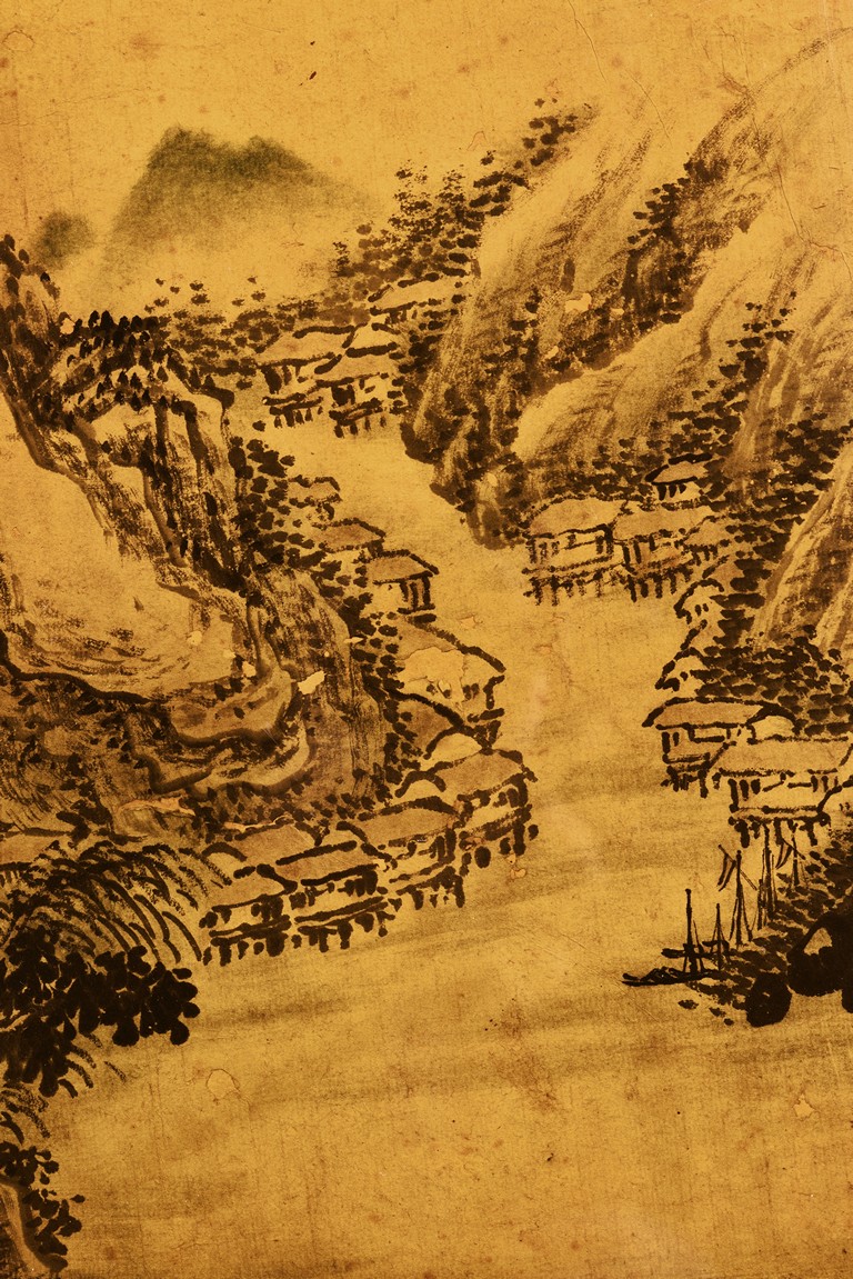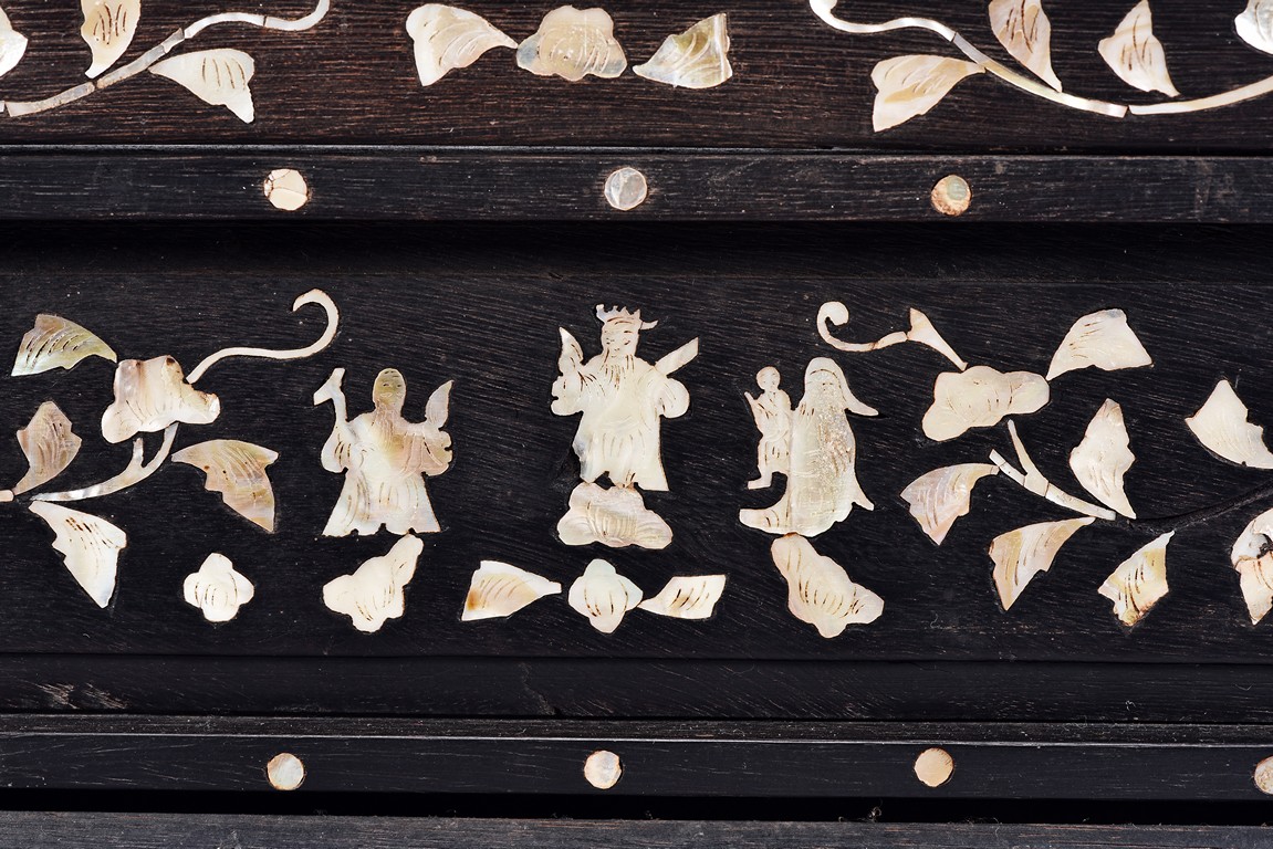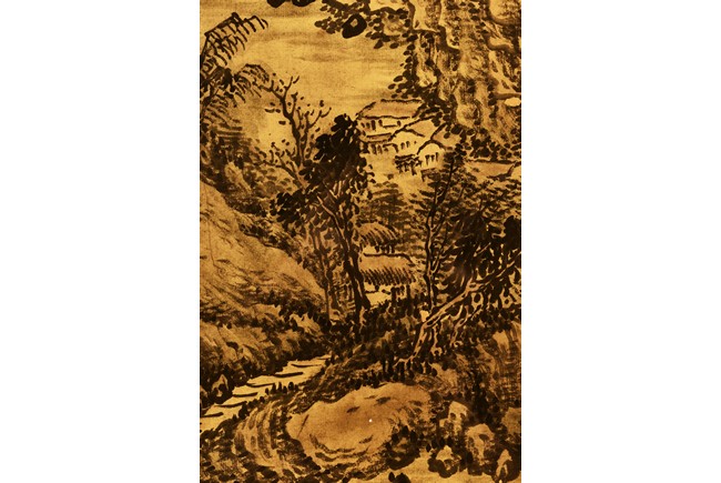 The table screen containing a color and ink on paper painting, with inscription and seal, attributed to Wang Hui, the table screen embellished with mother-of-pearl decoration. Qing Dynasty period.