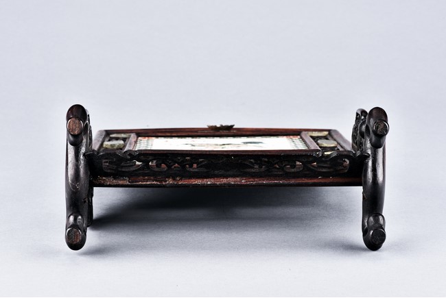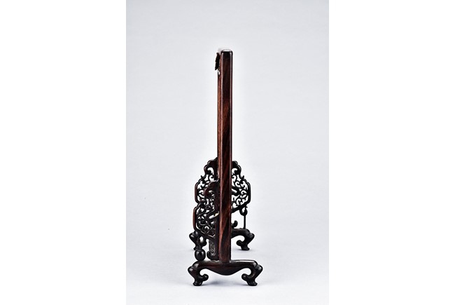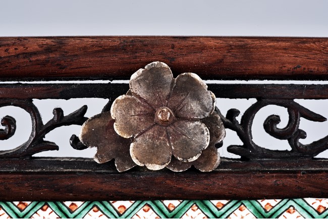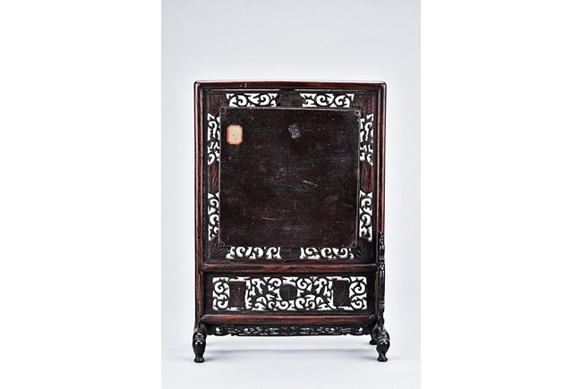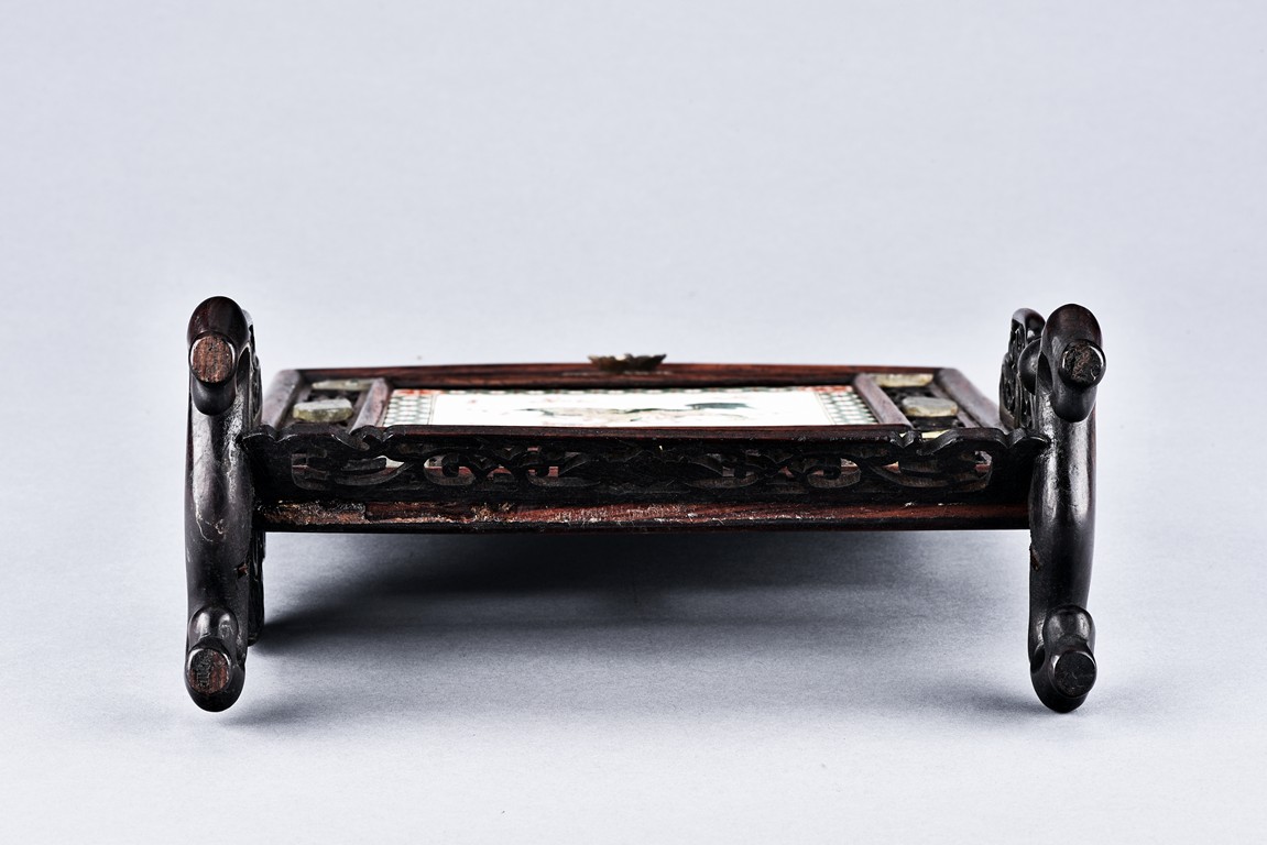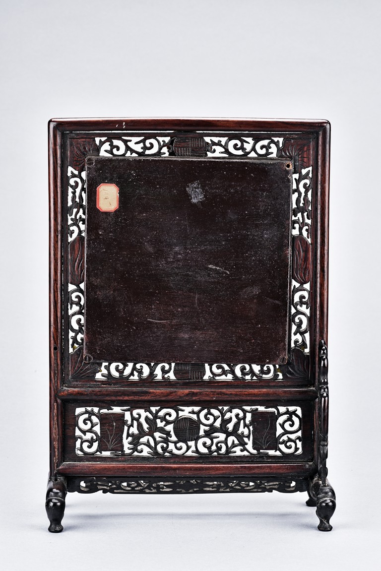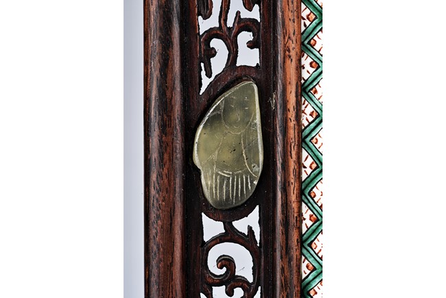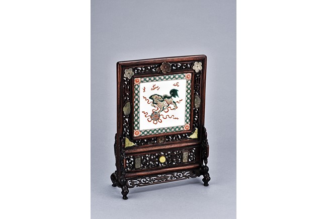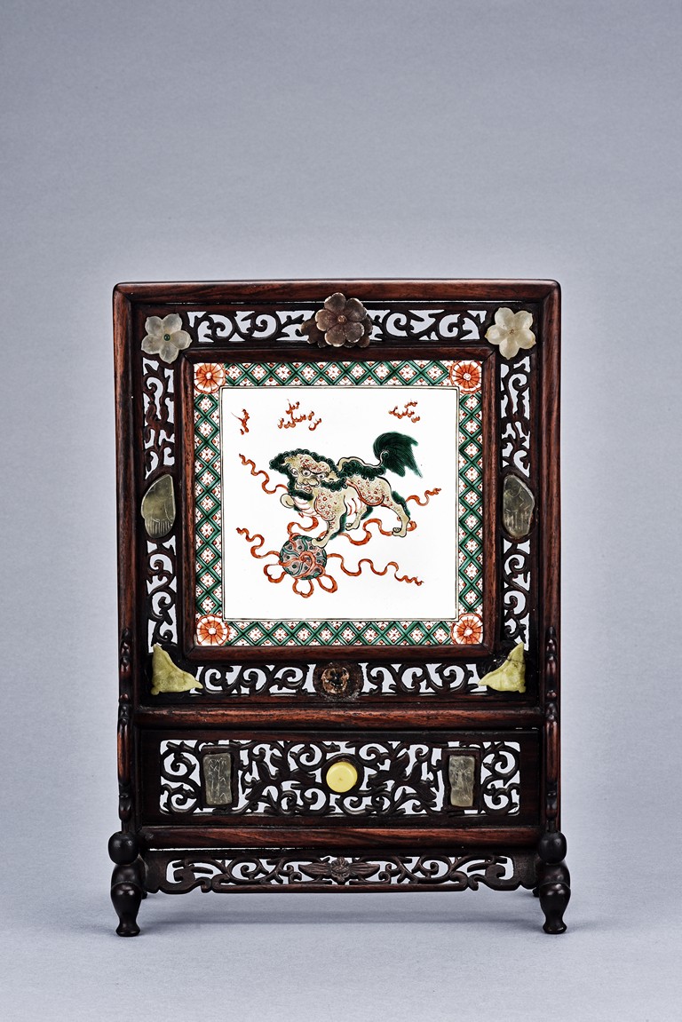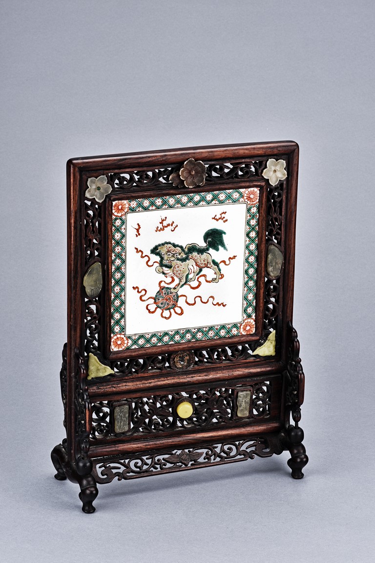 Of rectangular form, the wucai decorated porcelain panel is inset on the table screen, with depiction of a buddhist lion playing ball, with openwork scrolling floral pattern and various jades embellished outside the plaque. Qing Dynasty period.