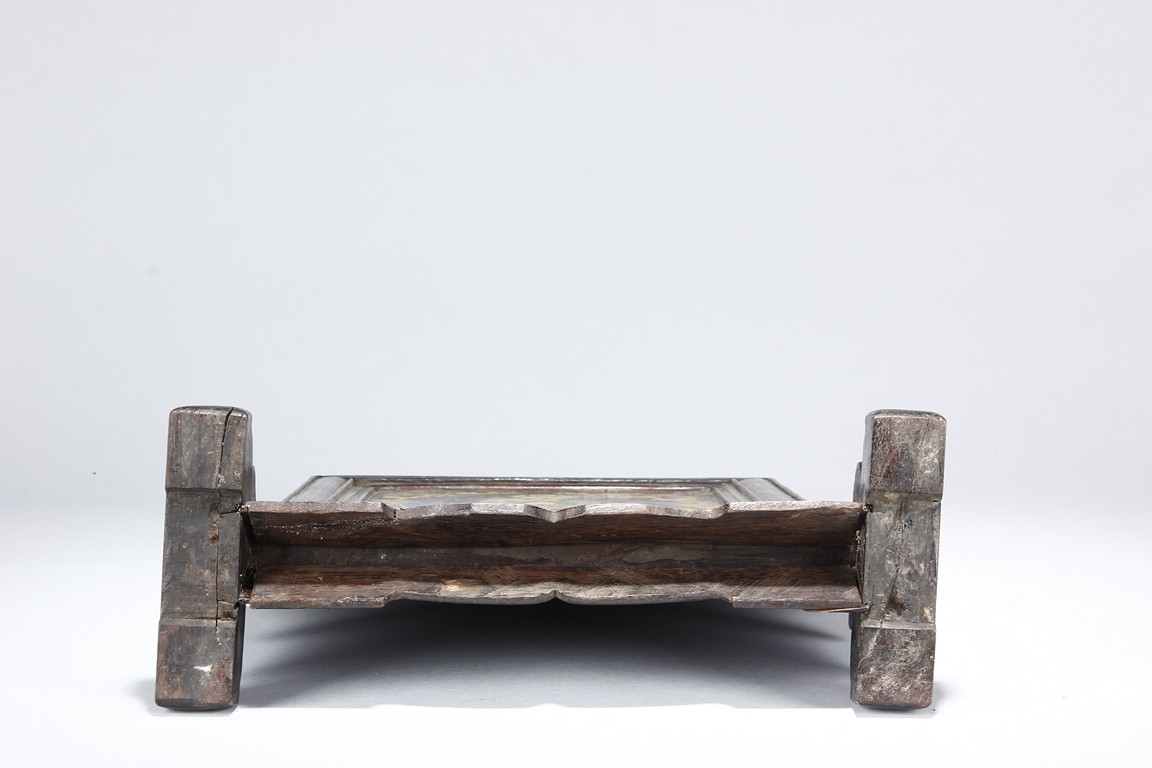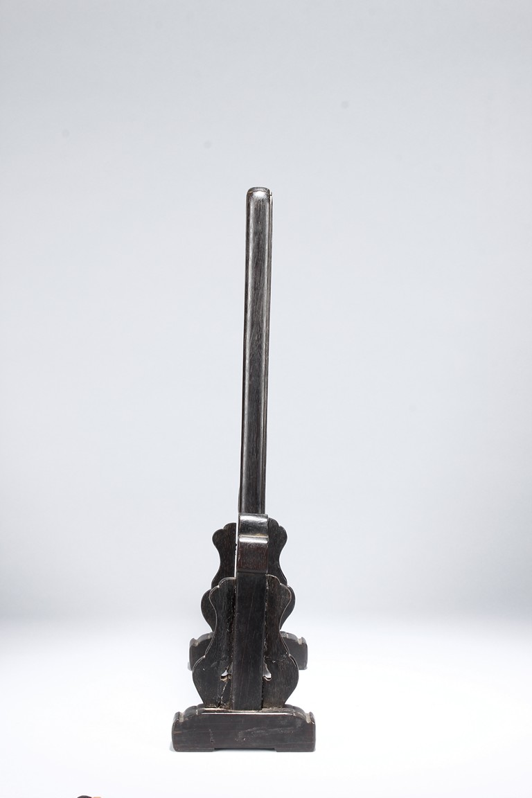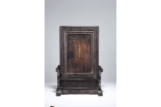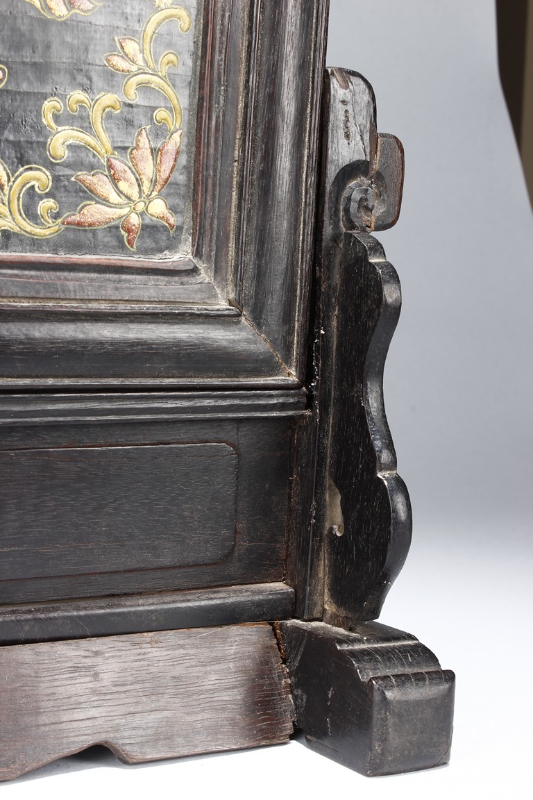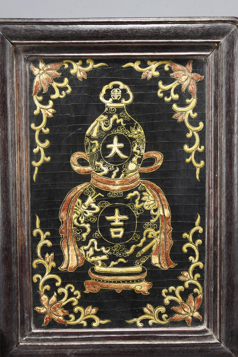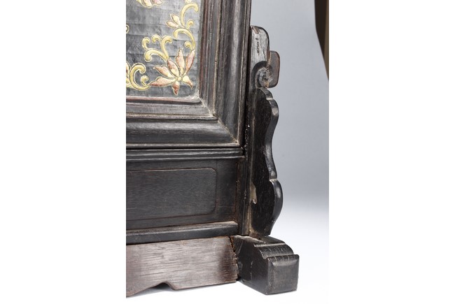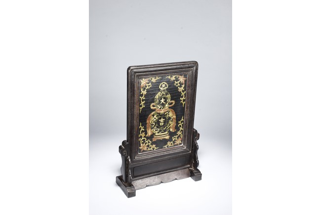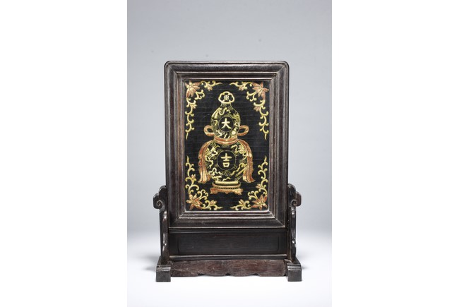 Of upright rectangular form, inlaid on a black lacquer background, the double-gourd encloses two auspicious characters 'Da' and 'Ji' within roundels and clouds and knots motifs outside the roundels. It is further flanked by scrolling foliage and flower decorations on each corner. The screen is supported by a wood frame and stand.
