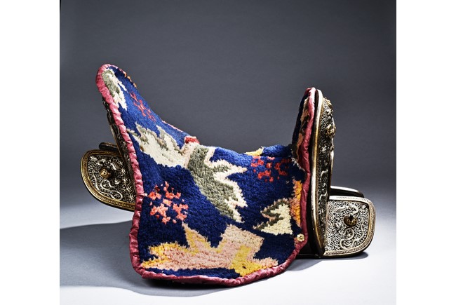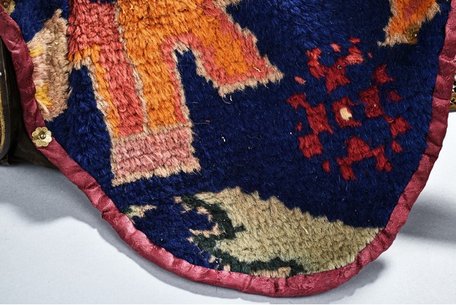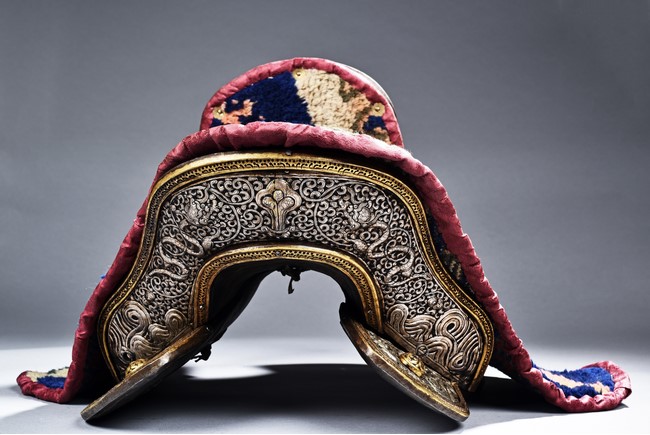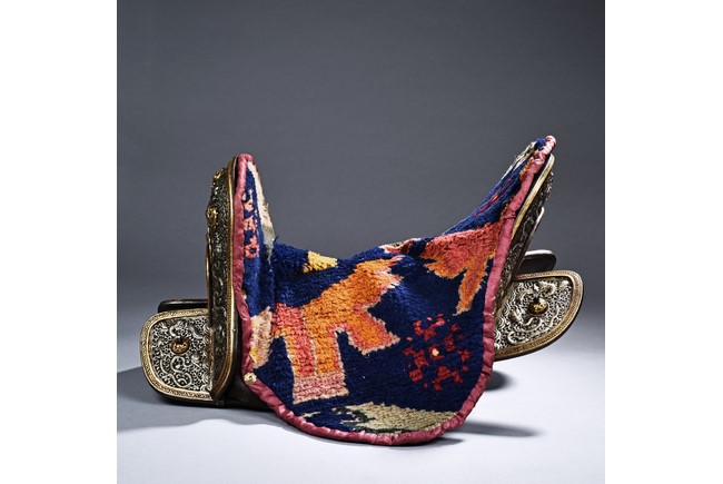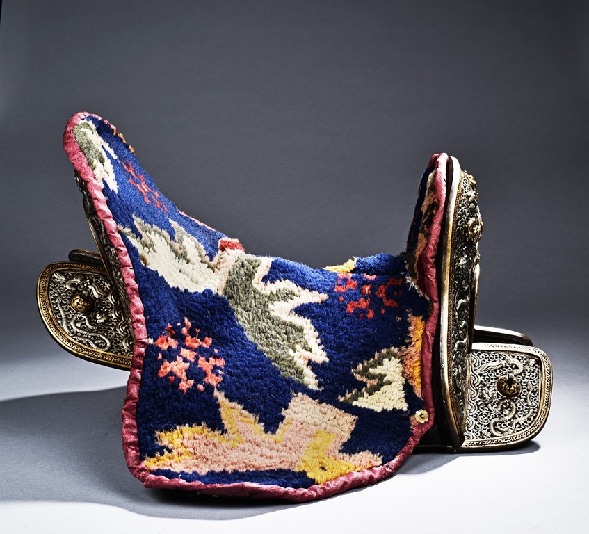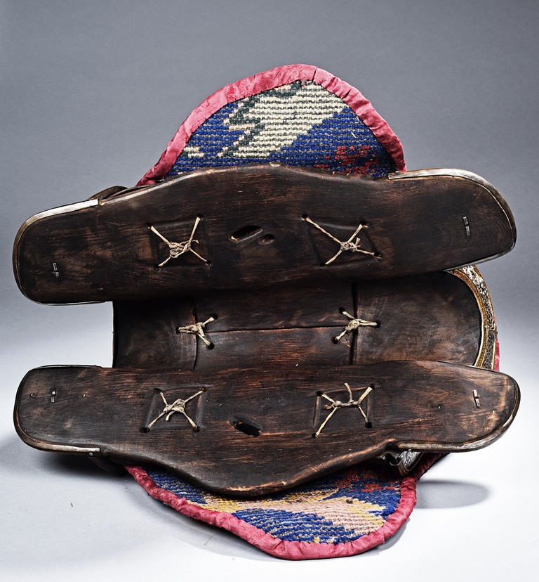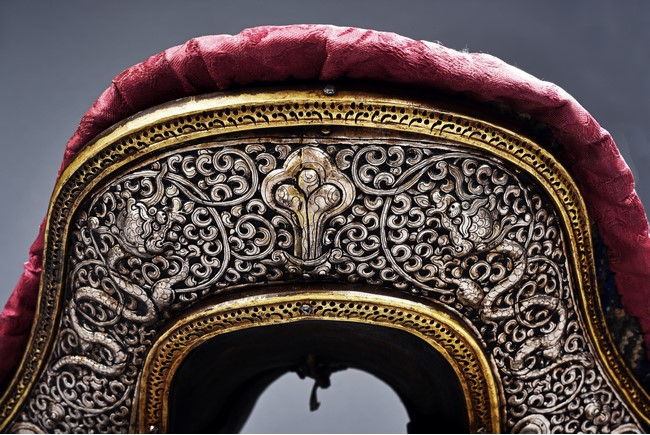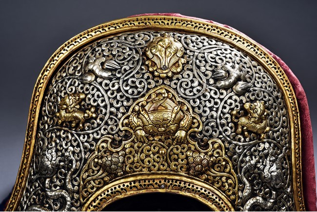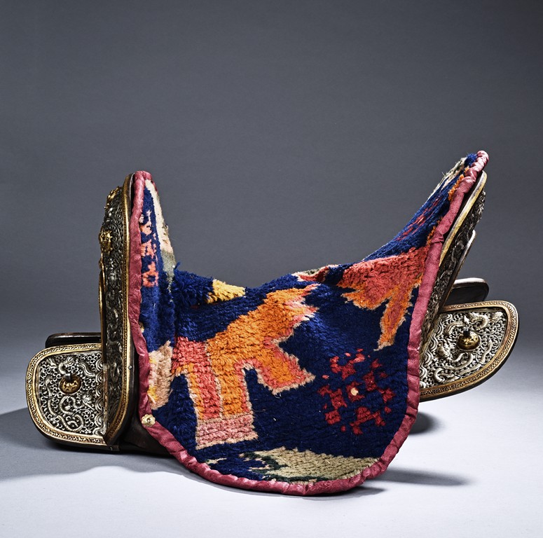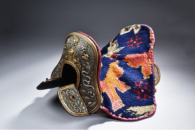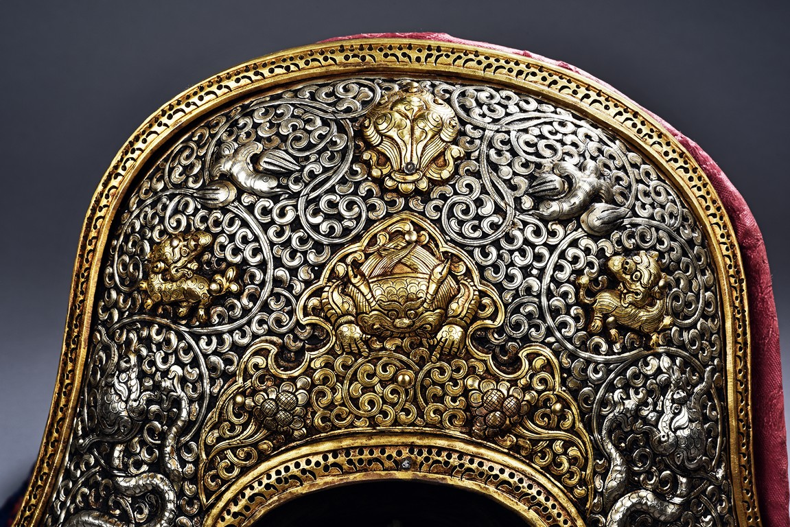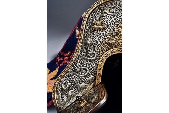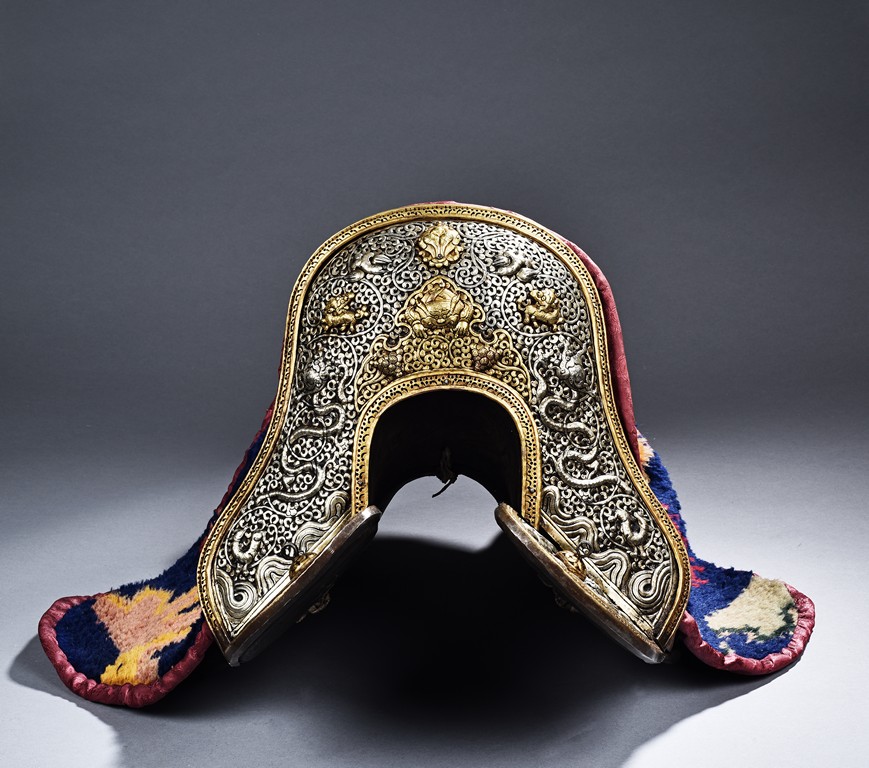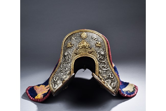 The horse saddle is covered on top with cloth, the front depicts mythical birds, beasts, and dragons surrounding beast mask amidst vine and ocean wave patterns in gilt silver, the back depicts two flying dragons confronting each other amidst similar patterns. Straps and two buckles. Qing Dynasty period.