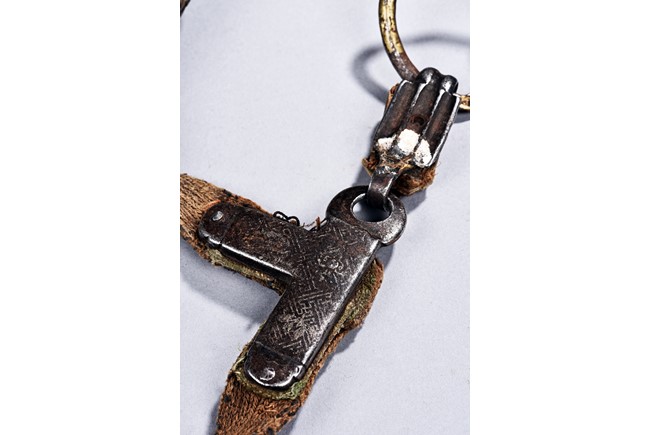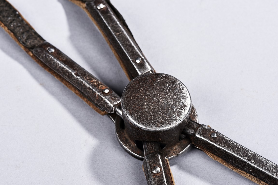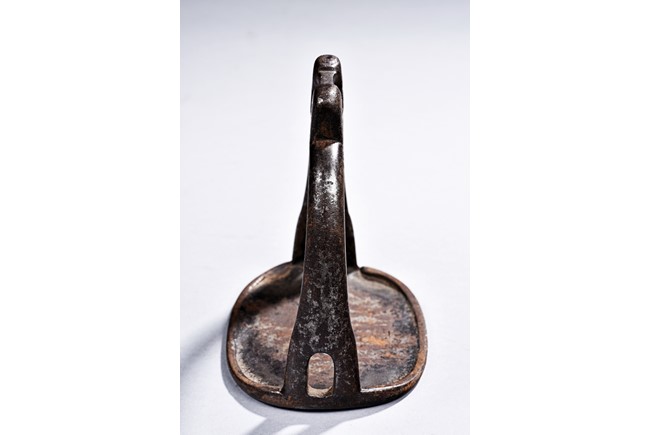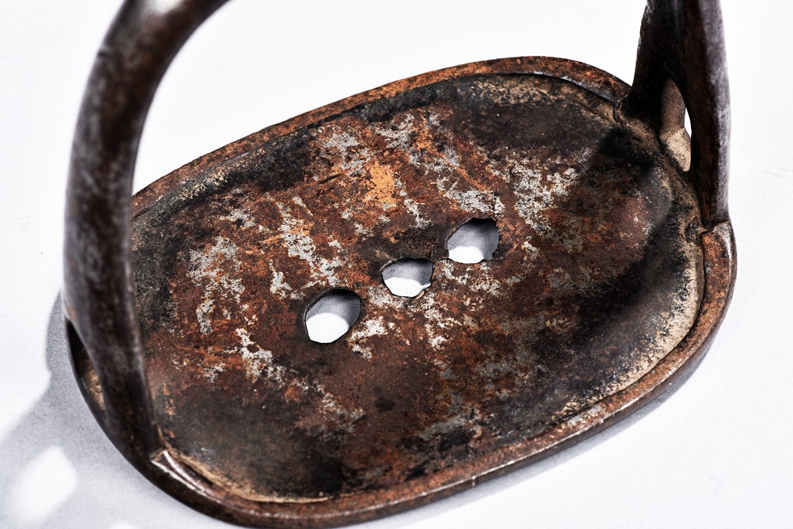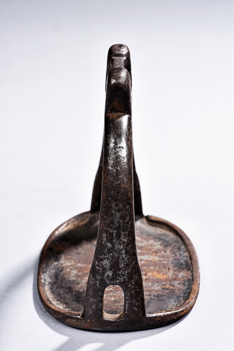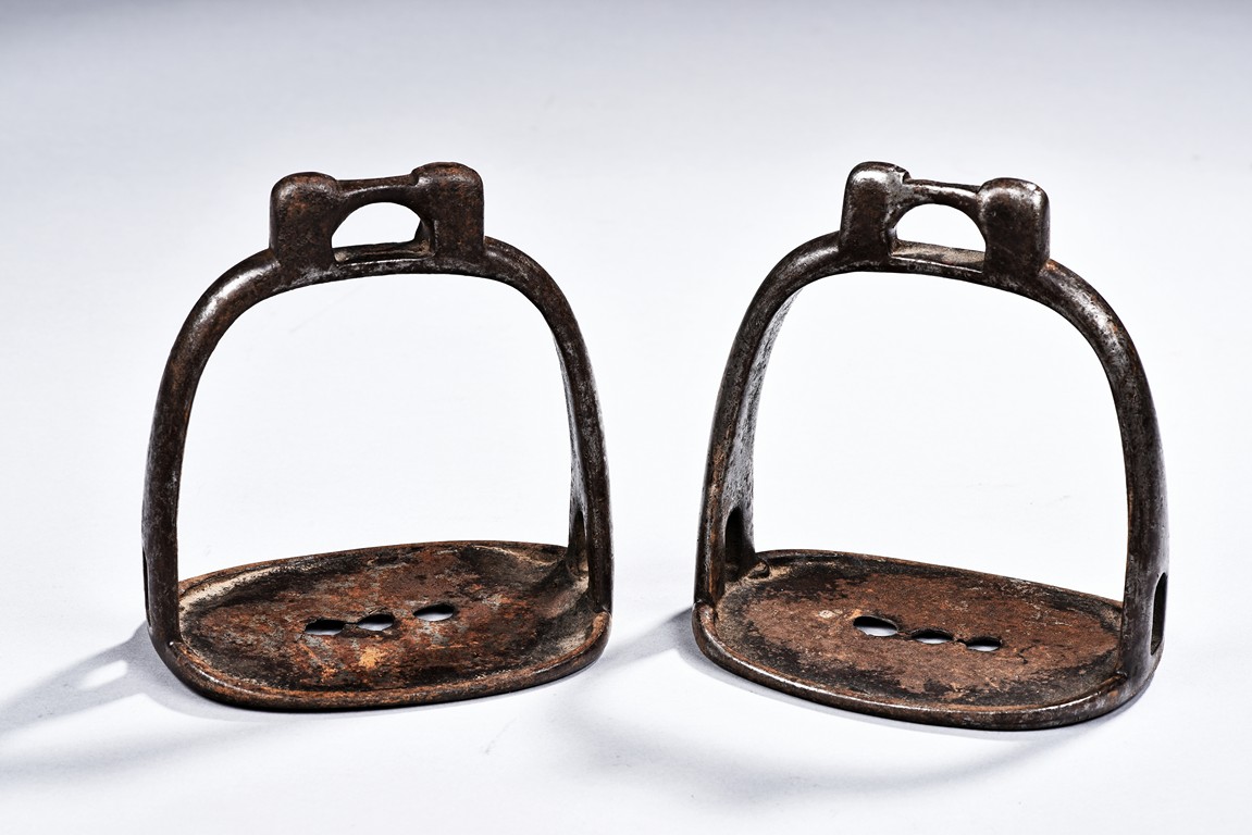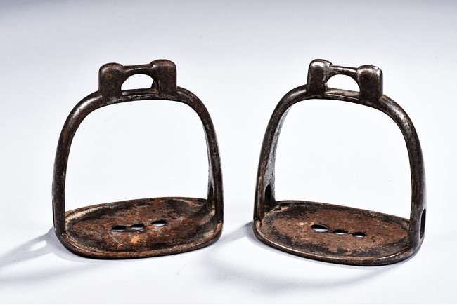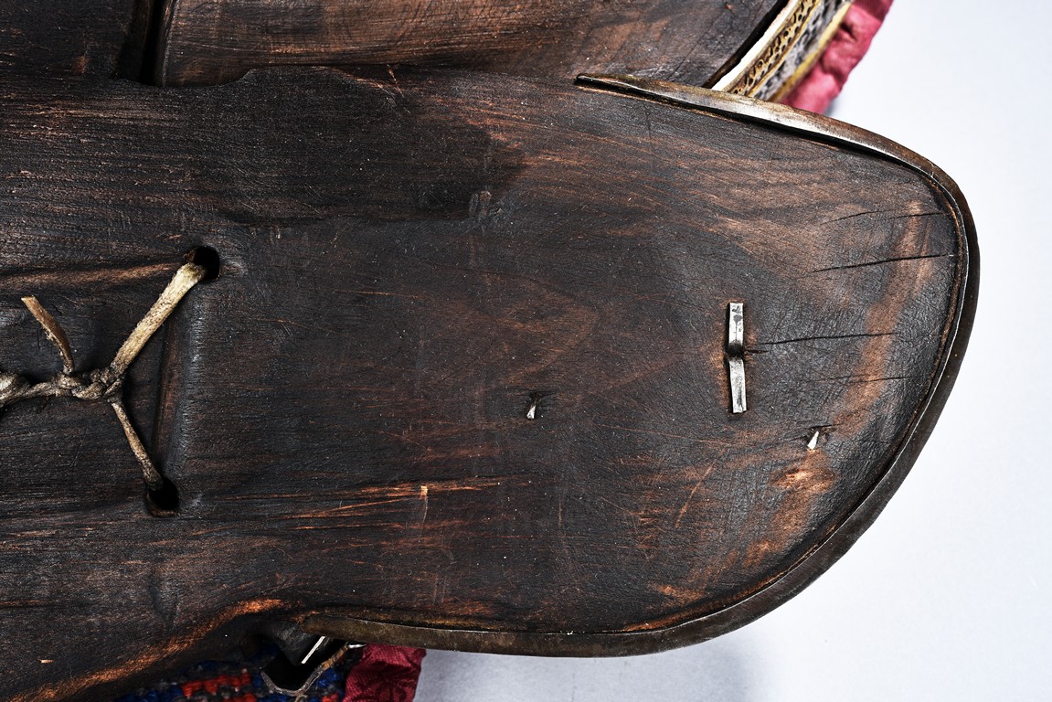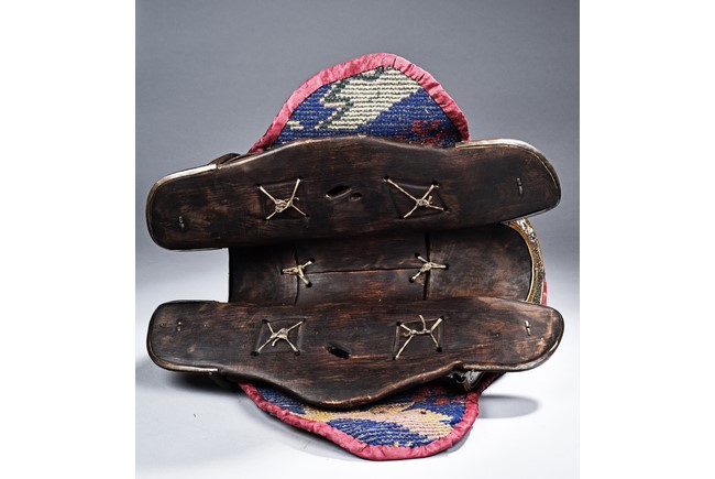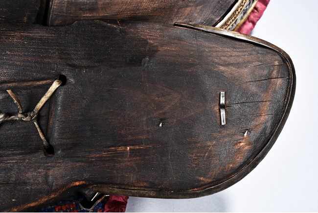 The horse saddle is covered on top with cloth, the front depicts mythical birds, beasts, and dragons surrounding beast mask amidst vine and ocean wave patterns in gilt silver, the back depicts two flying dragons confronting each other amidst similar patterns. Straps and two buckles. Qing Dynasty period.