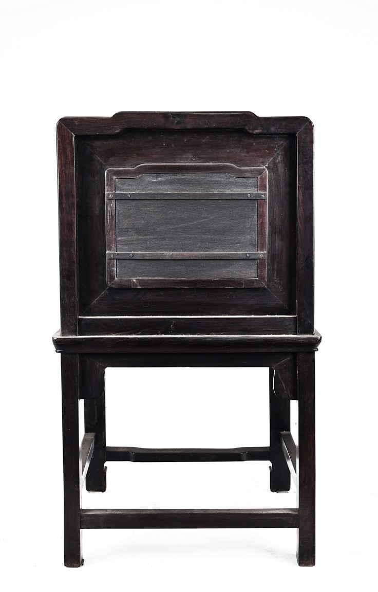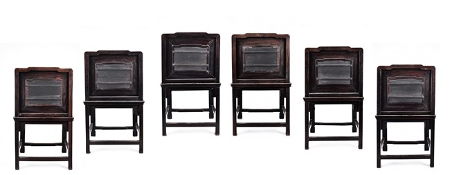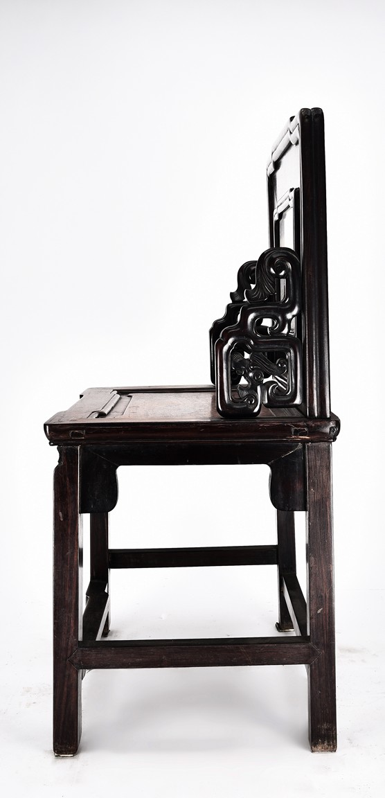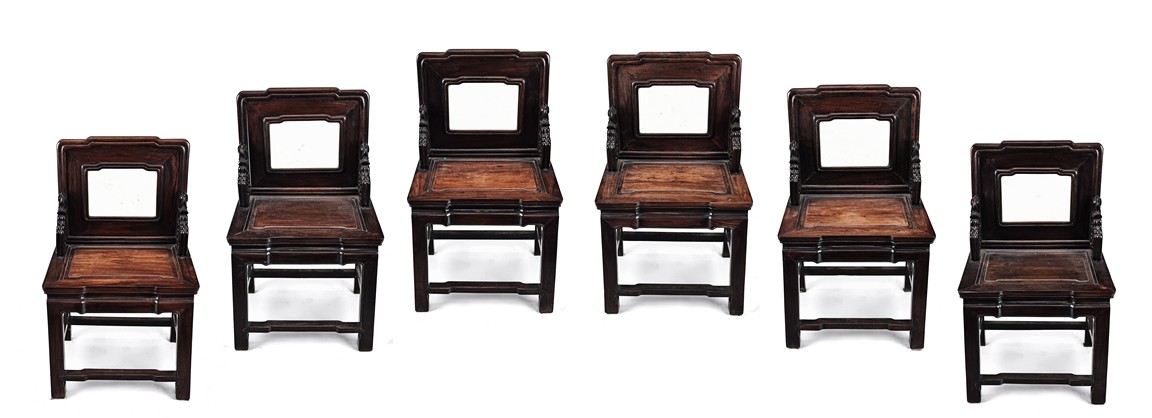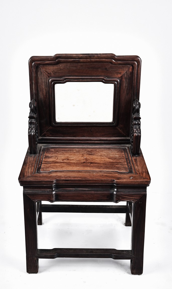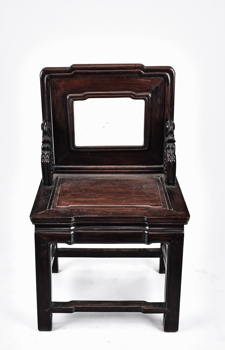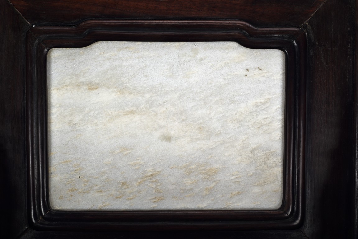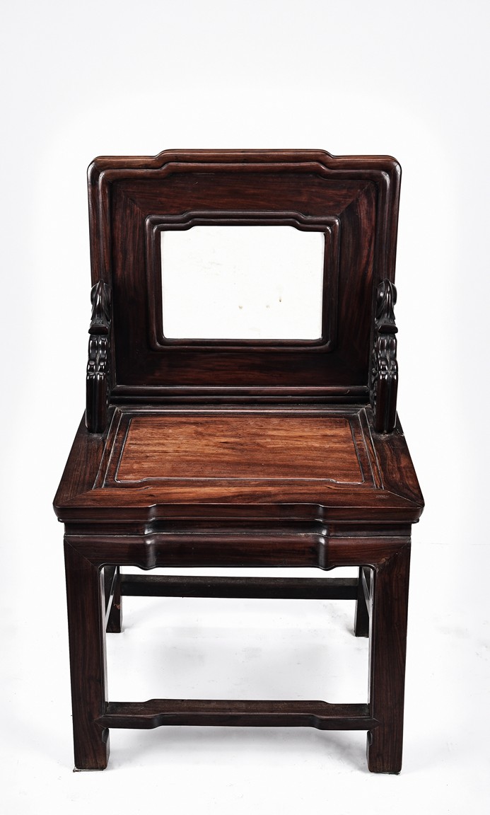 Each chair with scroll form chilong arm, the back inset with rectangular marble panel, with recessed waist, the legs joined by stretchers. Qing Dynasty period.