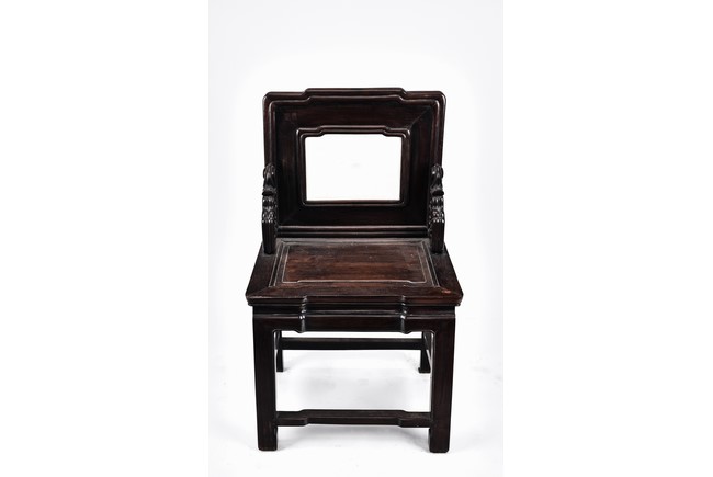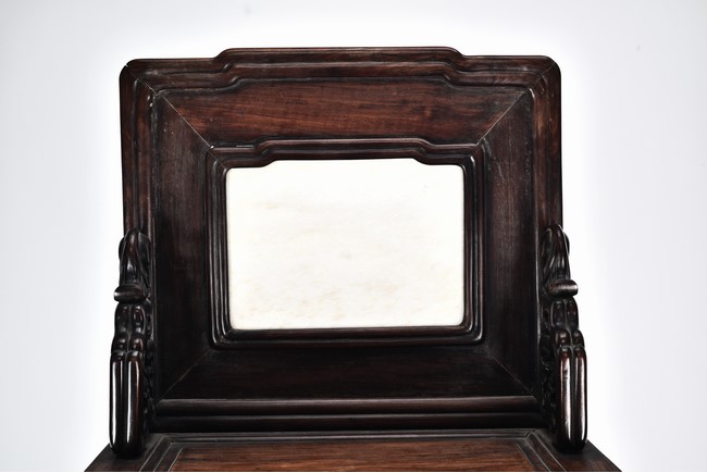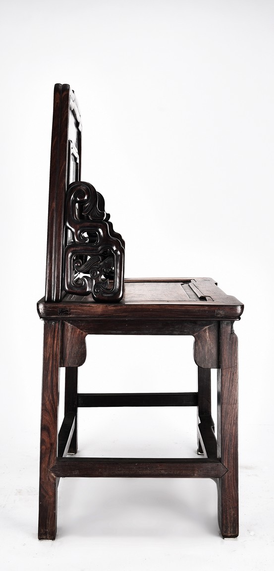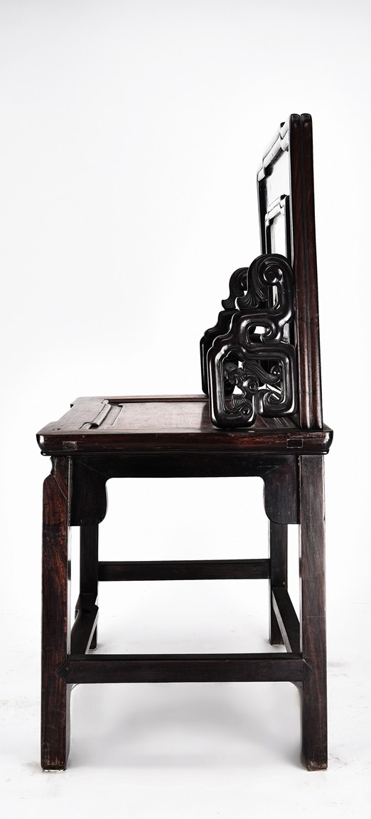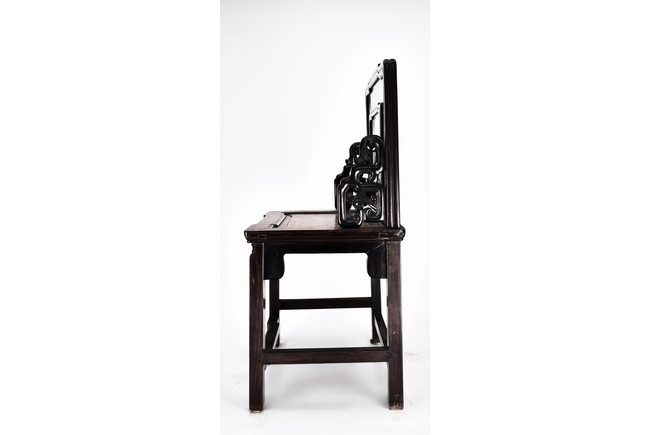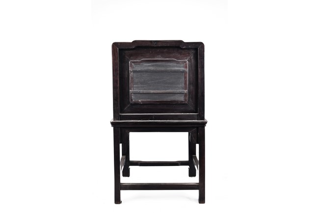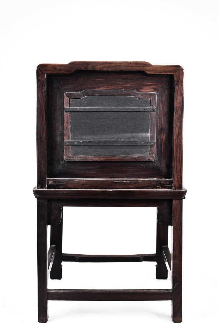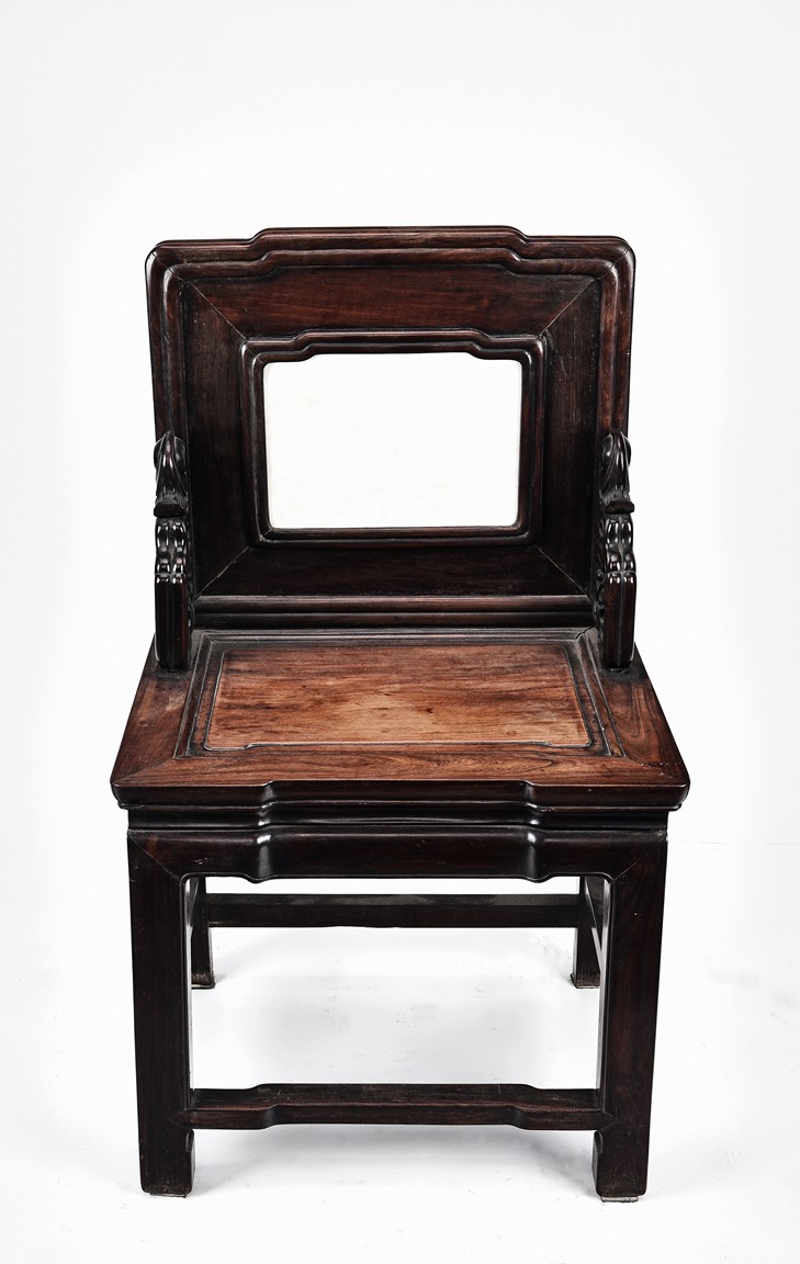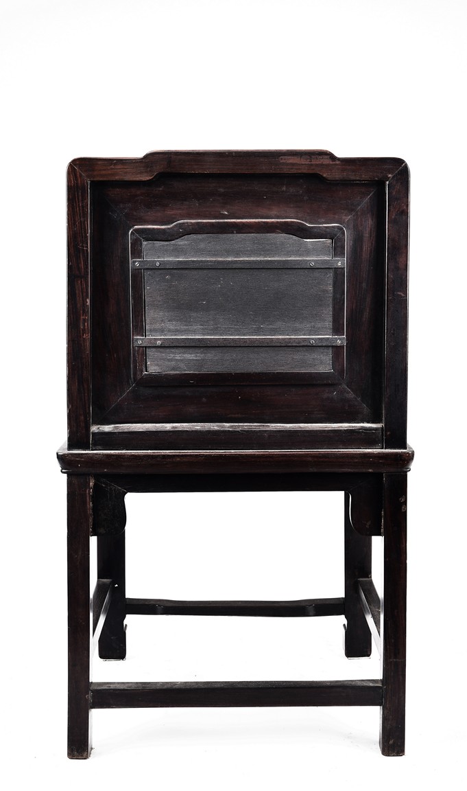 Each chair with scroll form chilong arm, the back inset with rectangular marble panel, with recessed waist, the legs joined by stretchers. Qing Dynasty period.