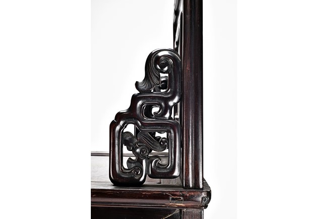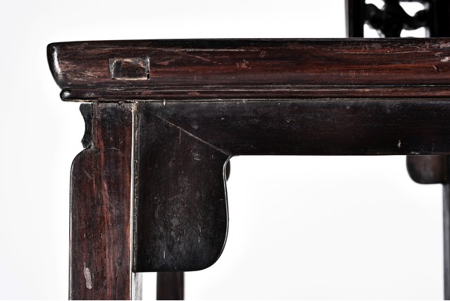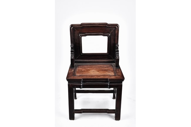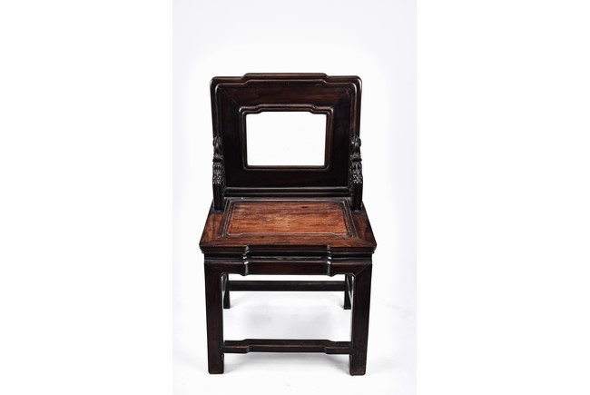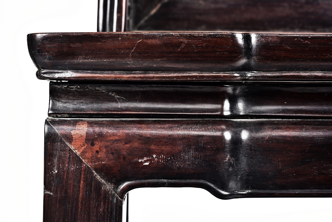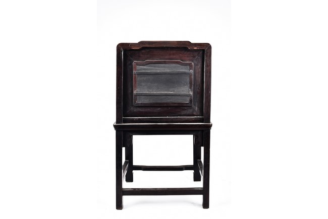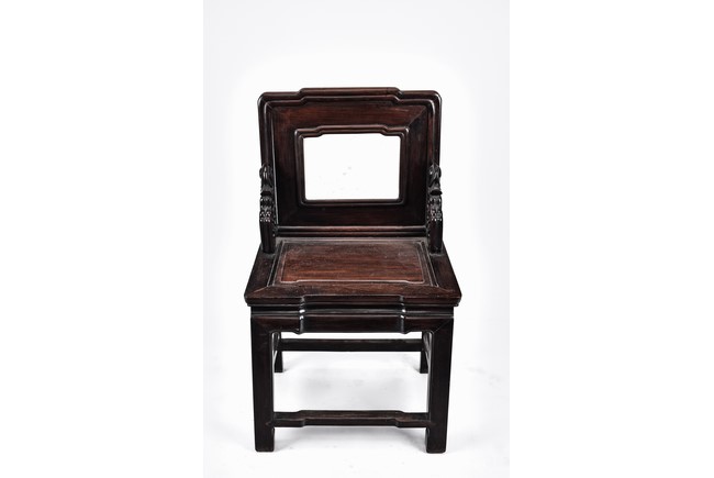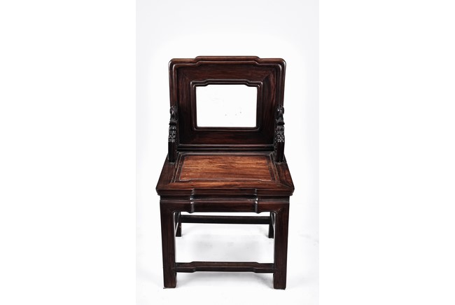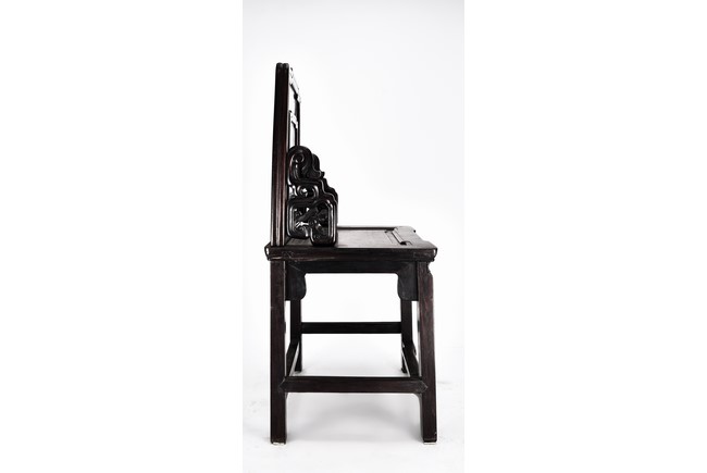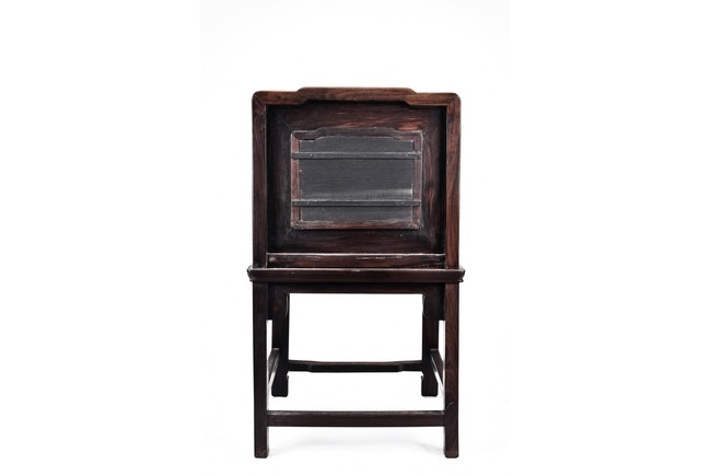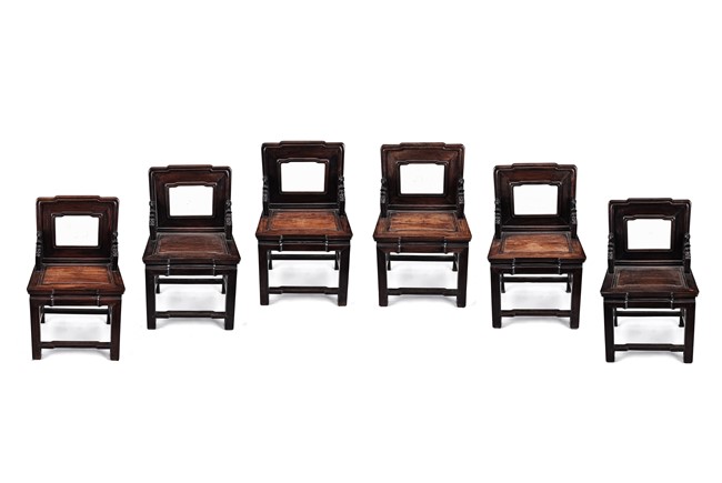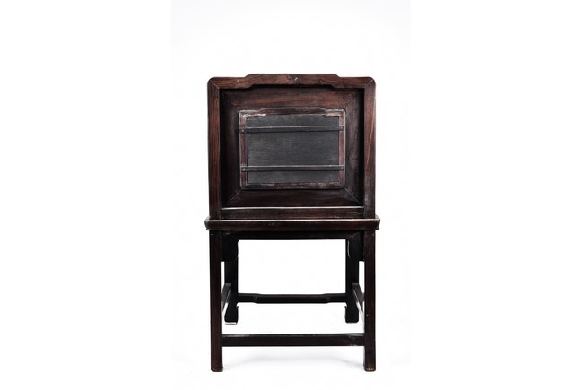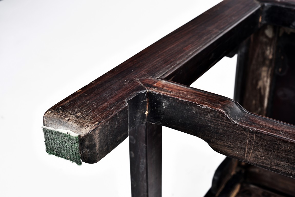 Each chair with scroll form chilong arm, the back inset with rectangular marble panel, with recessed waist, the legs joined by stretchers. Qing Dynasty period.