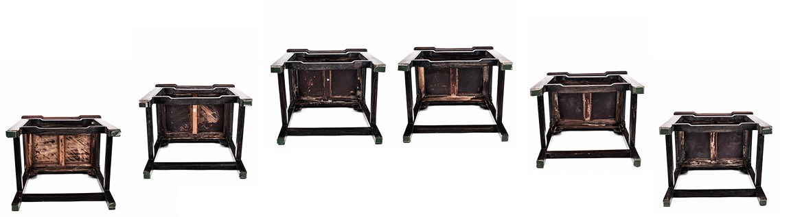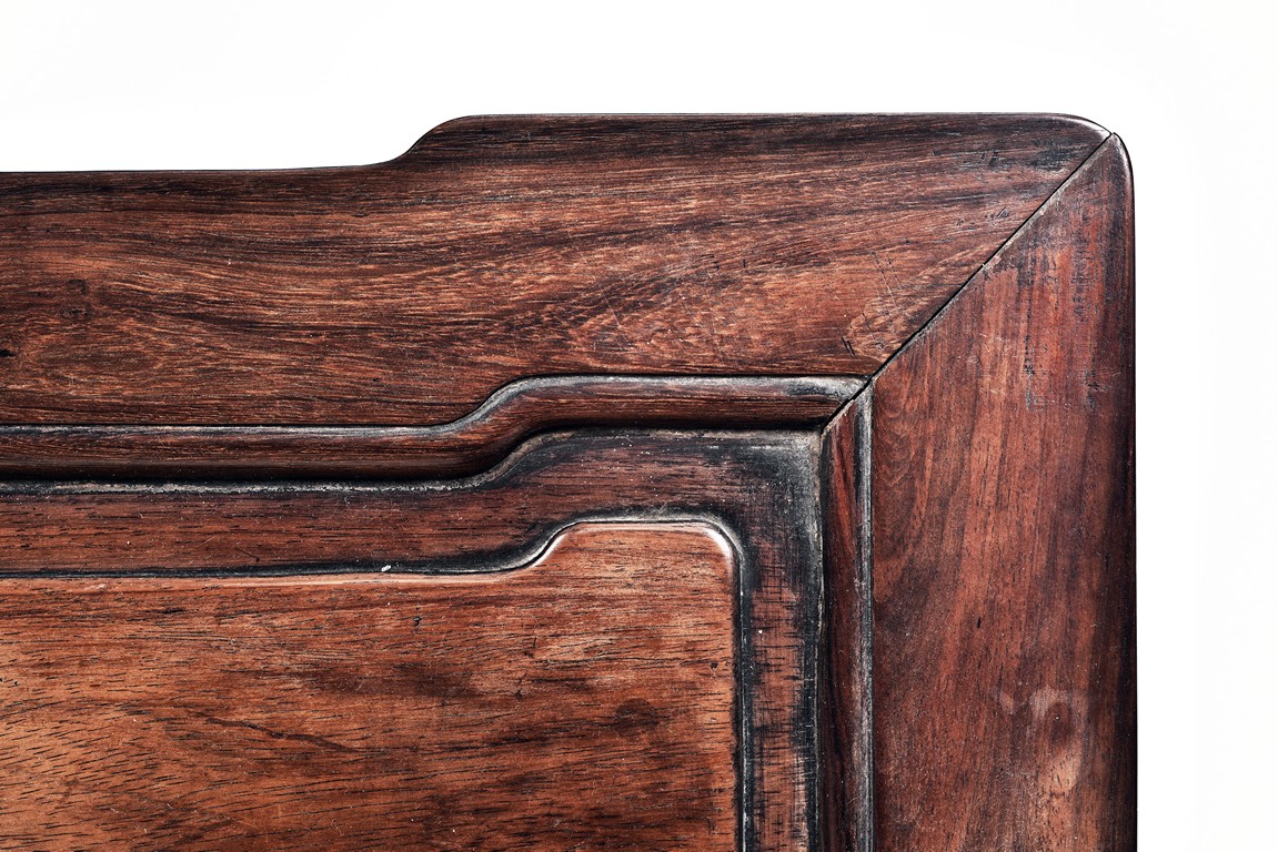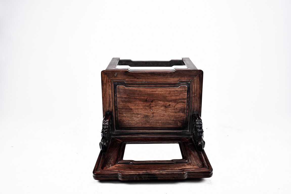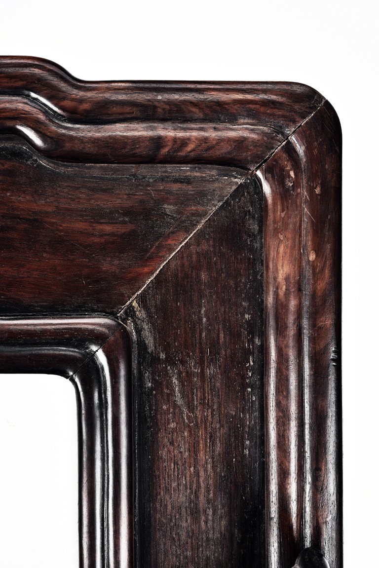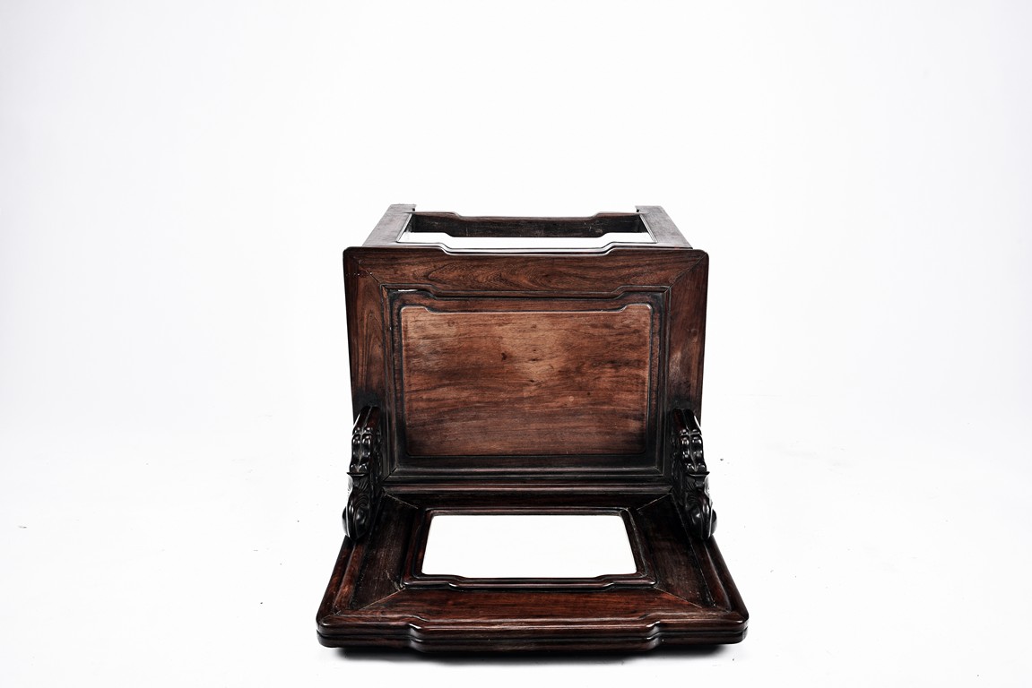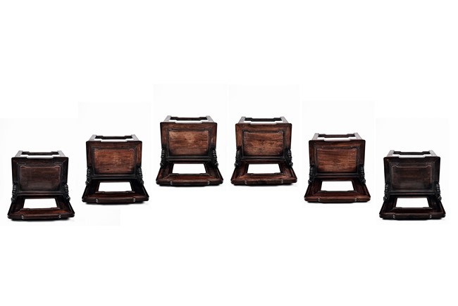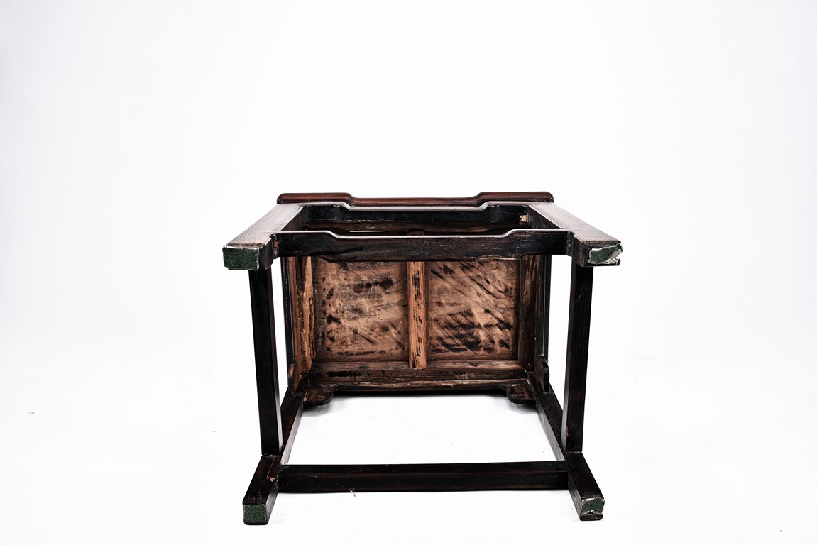 Each chair with scroll form chilong arm, the back inset with rectangular marble panel, with recessed waist, the legs joined by stretchers. Qing Dynasty period.