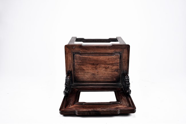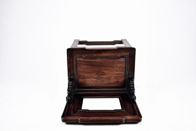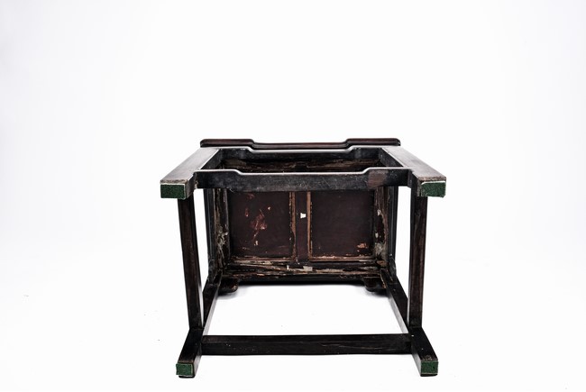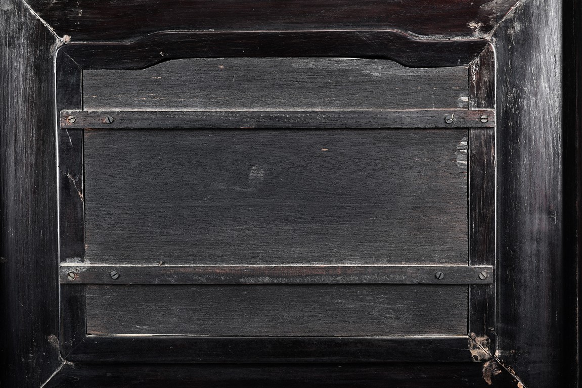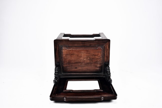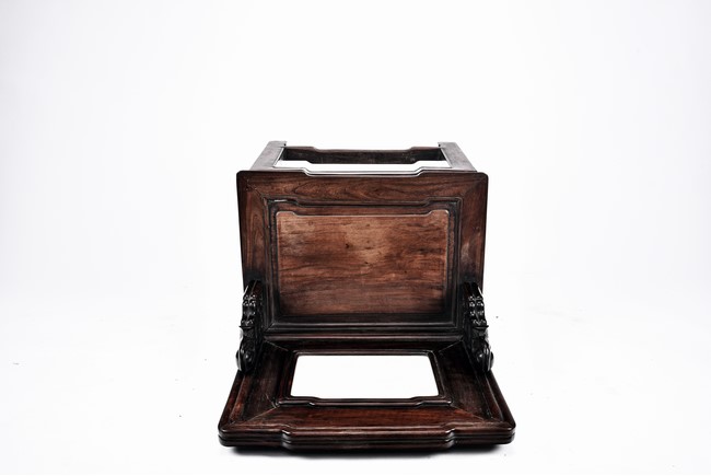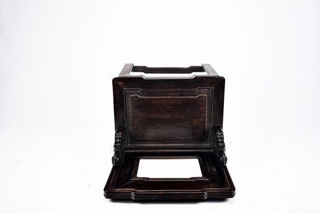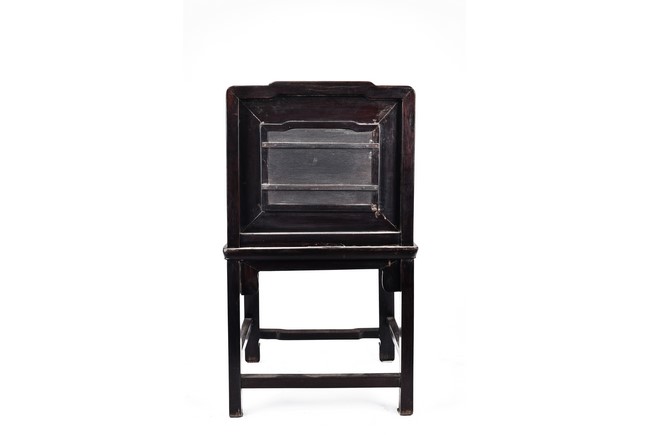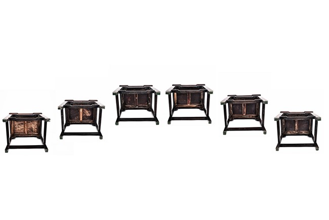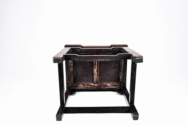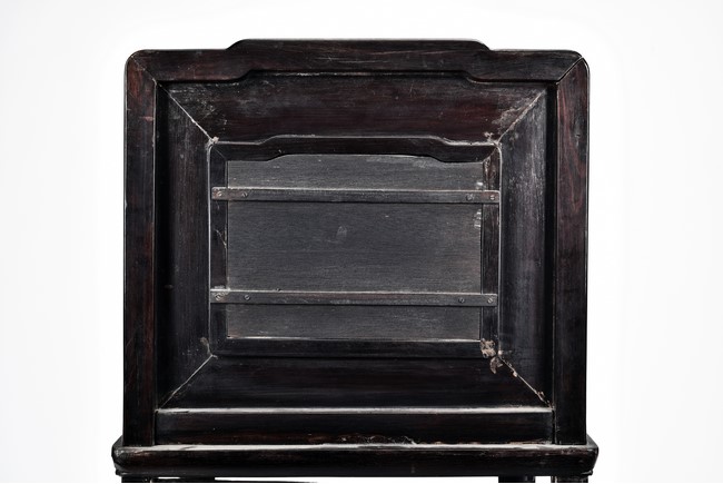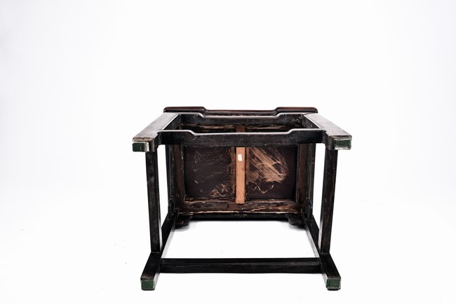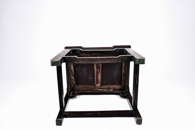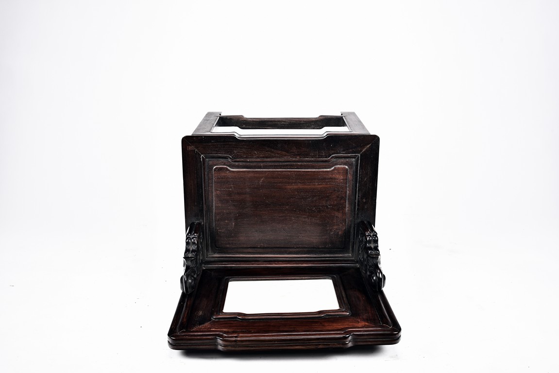 Each chair with scroll form chilong arm, the back inset with rectangular marble panel, with recessed waist, the legs joined by stretchers. Qing Dynasty period.