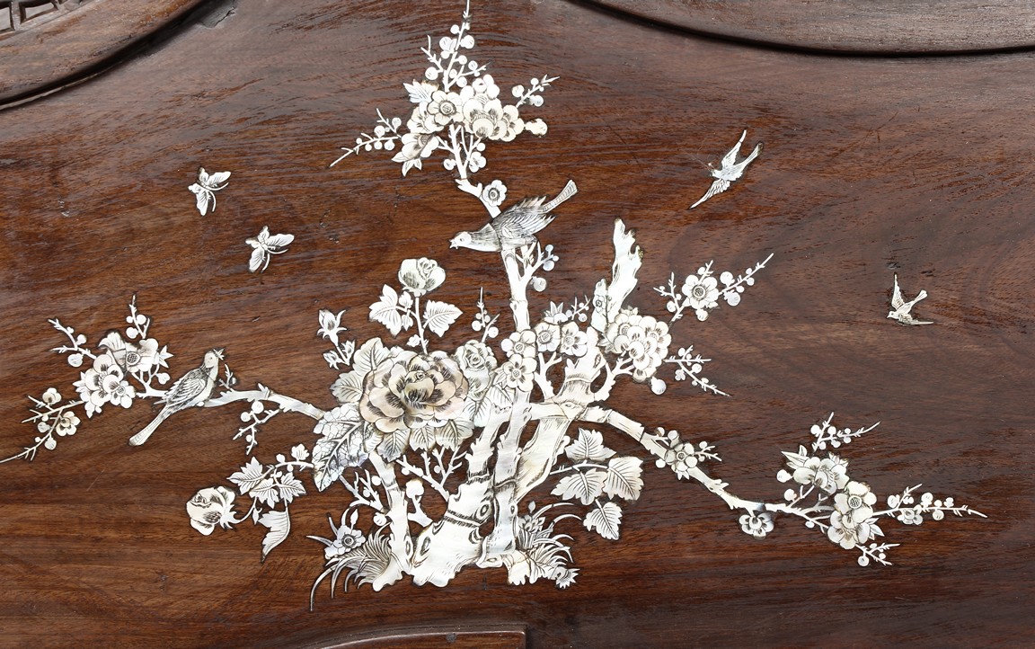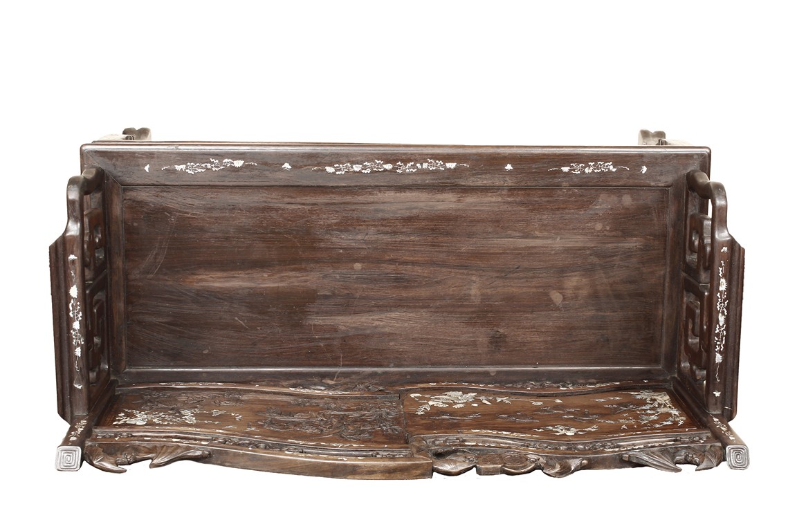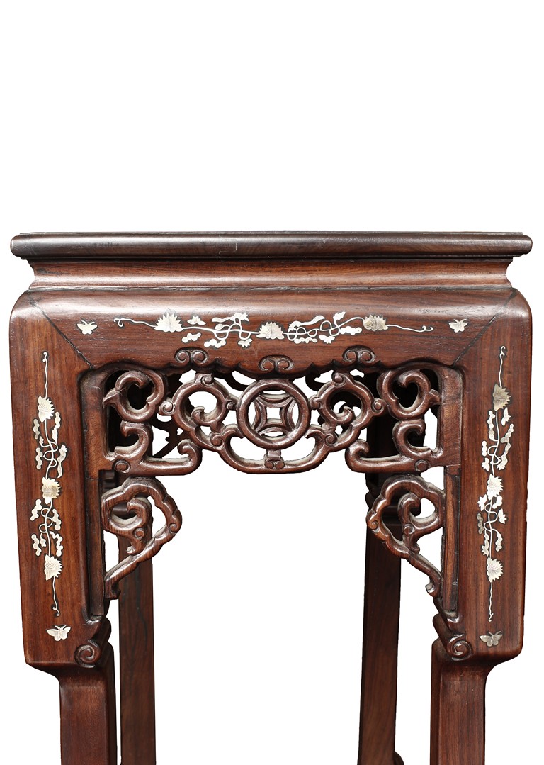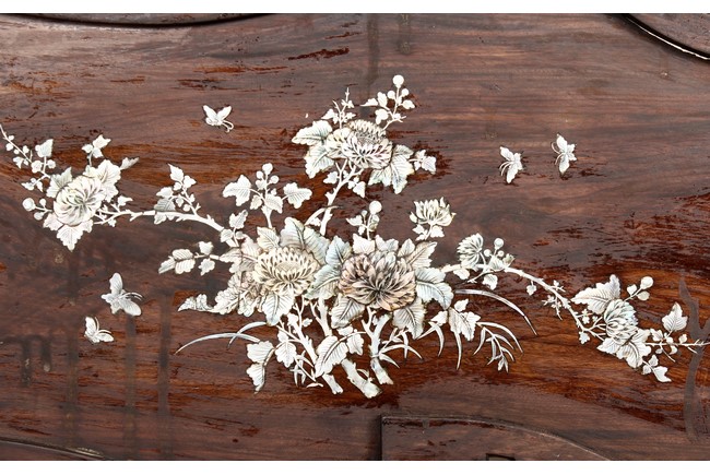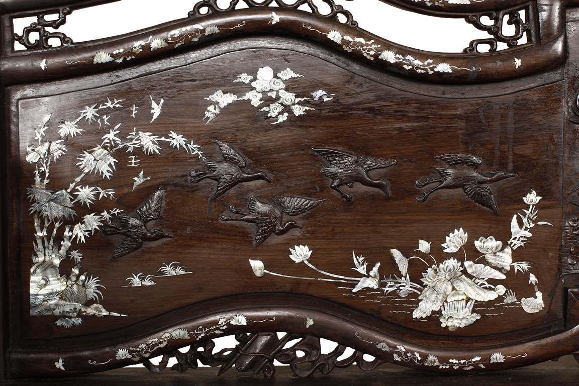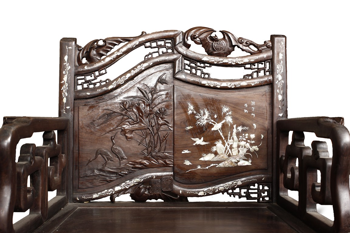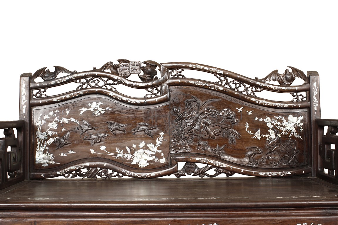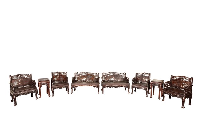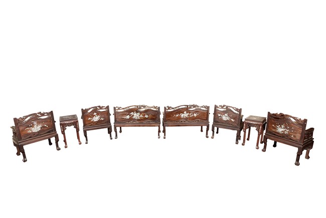 The furniture set includes four long seats, two chairs, two stands, and one table. The single piece wood table surface inset with mother-of-pearls, depicting butterflies and swallows flying near a large tree next to blossoming flowers, within a rectangular pattern, the apron pierce carved in ruyi cloud, bats, and coin shapes, another supporting board below, attached to four feet, with additional carved aprons at the corners, all stands on tapered in beast legs. The stand exhibits similar design and motif as the table, but without the supporting wooden board. The long seats and chairs have slightly differing design, the front with stylistically carved and embellished back rest depicting either cranes flying past lotus flowers and bamboo trees, between five pierce carved bats and floral patterns, the apron carved with bats and ruyi clouds, attached to beast legs. Includes Certificates of Antiquity issued from Kin Fat Antiques Curios & Woodenware Co., dated 1987. Qing Dynasty Period.