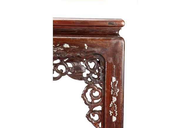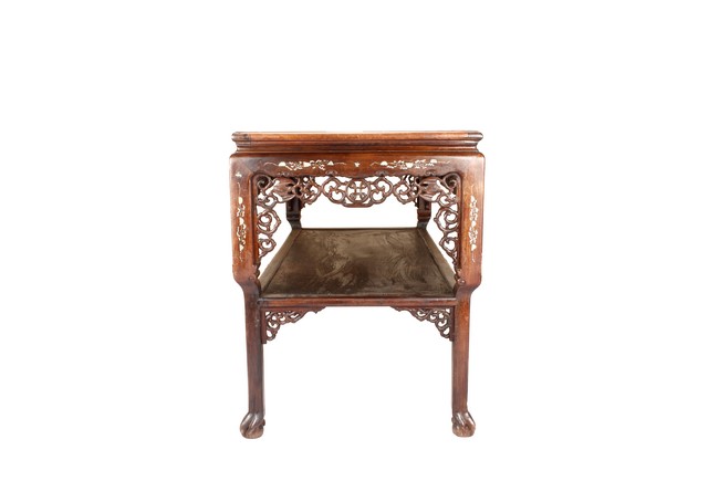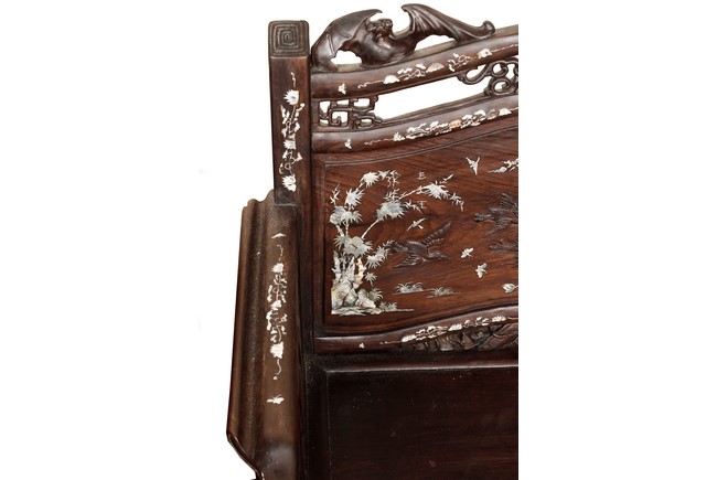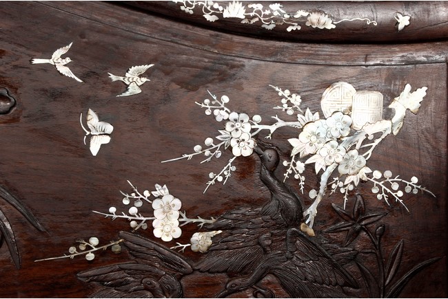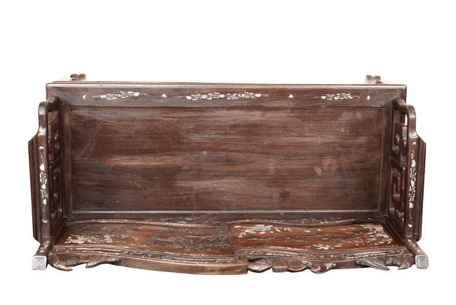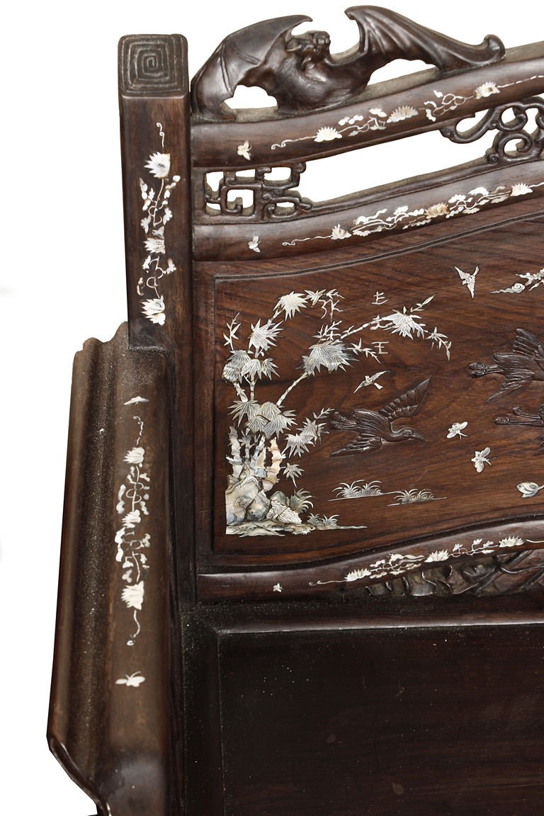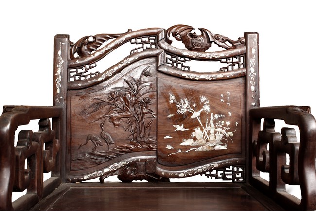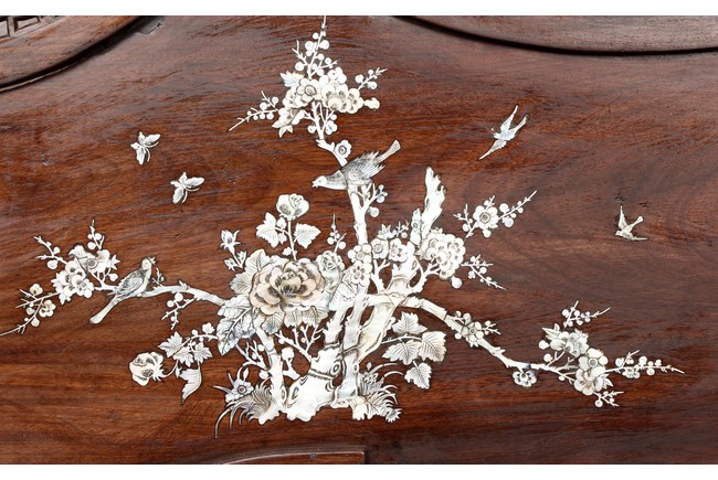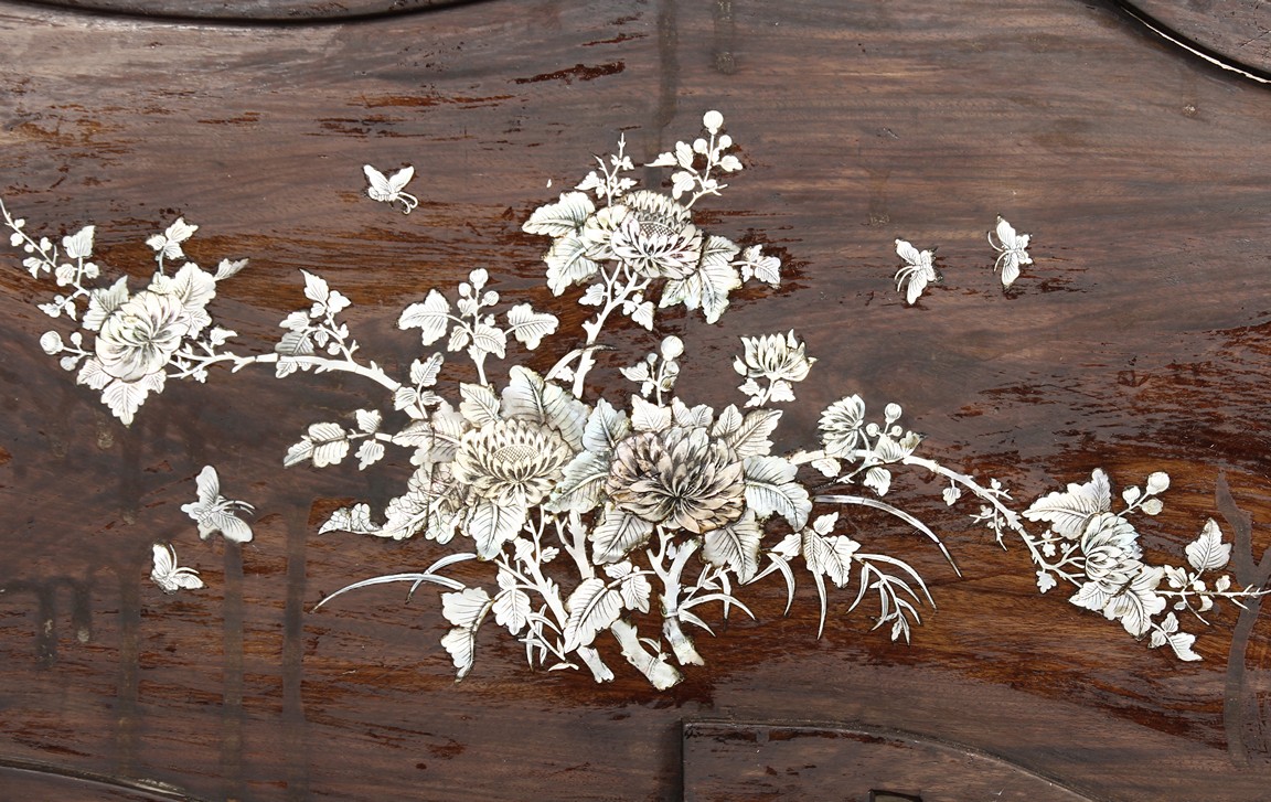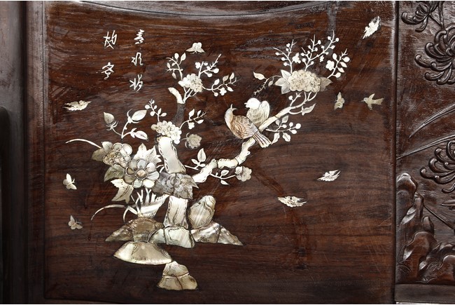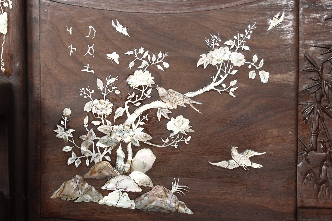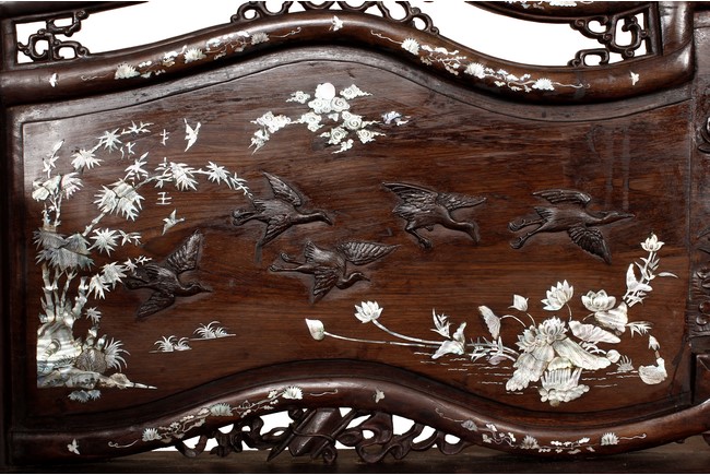 The furniture set includes four long seats, two chairs, two stands, and one table. The single piece wood table surface inset with mother-of-pearls, depicting butterflies and swallows flying near a large tree next to blossoming flowers, within a rectangular pattern, the apron pierce carved in ruyi cloud, bats, and coin shapes, another supporting board below, attached to four feet, with additional carved aprons at the corners, all stands on tapered in beast legs. The stand exhibits similar design and motif as the table, but without the supporting wooden board. The long seats and chairs have slightly differing design, the front with stylistically carved and embellished back rest depicting either cranes flying past lotus flowers and bamboo trees, between five pierce carved bats and floral patterns, the apron carved with bats and ruyi clouds, attached to beast legs. Includes Certificates of Antiquity issued from Kin Fat Antiques Curios & Woodenware Co., dated 1987. Qing Dynasty Period.