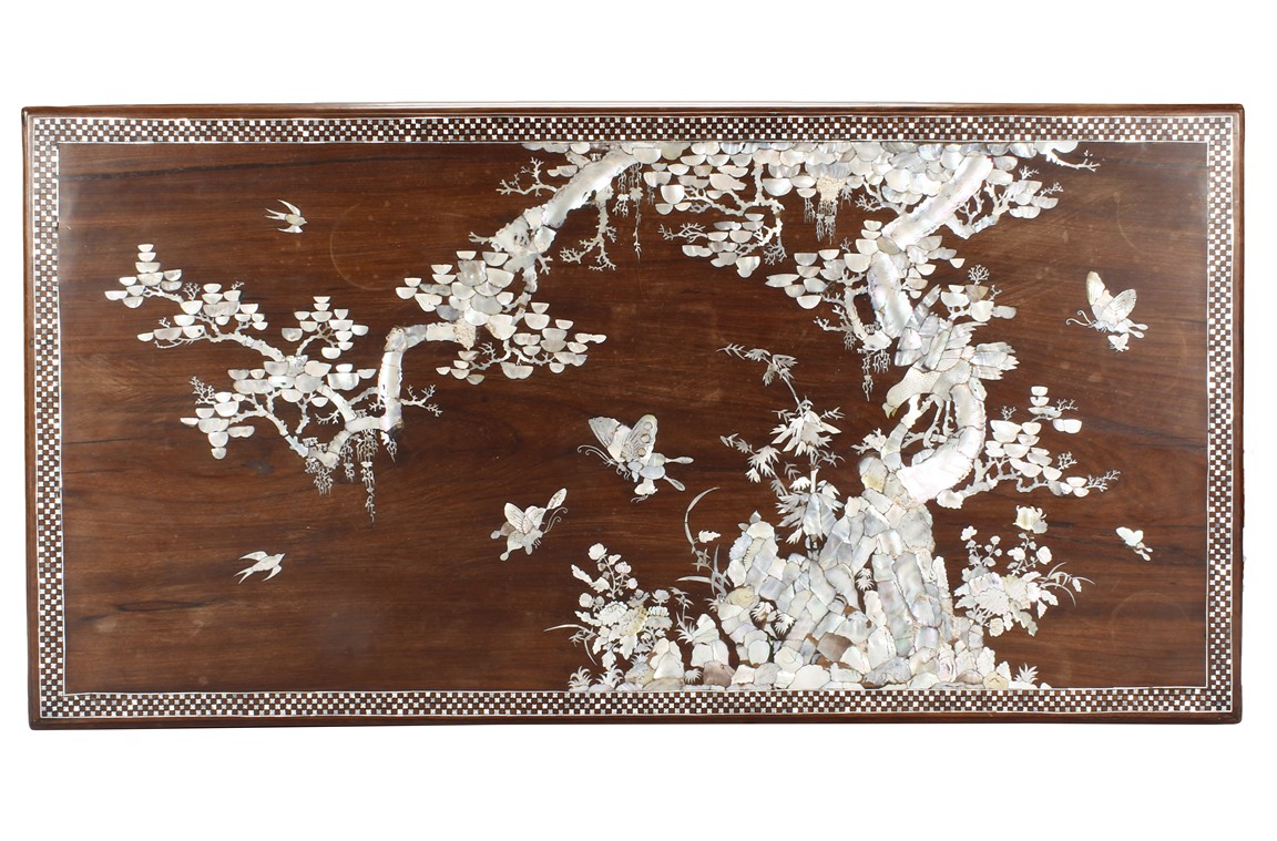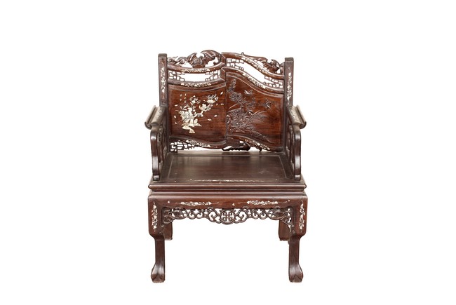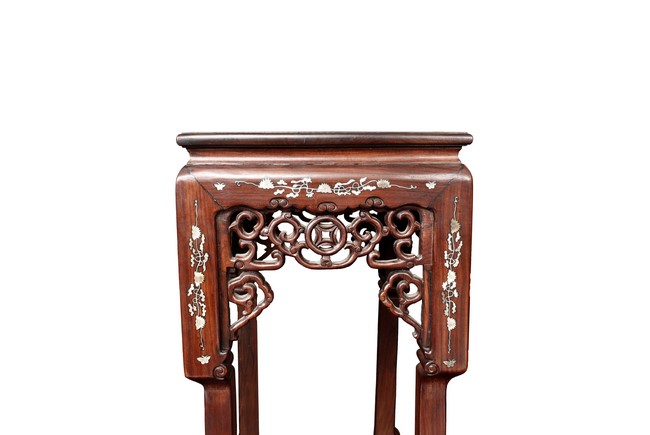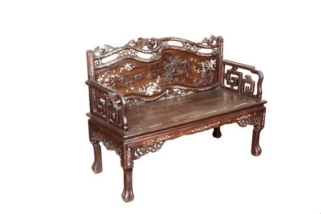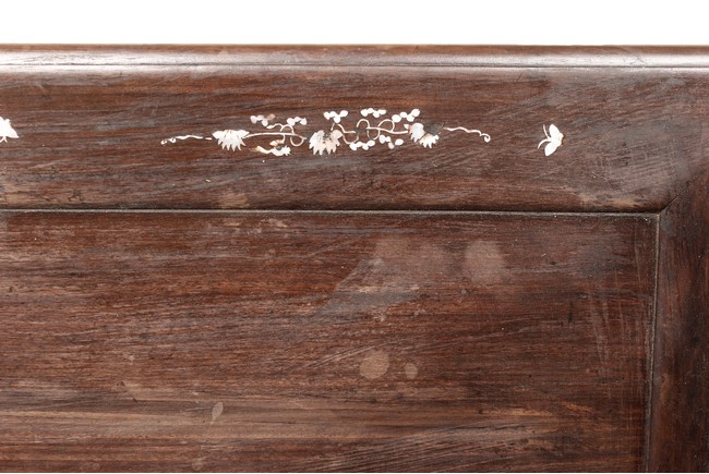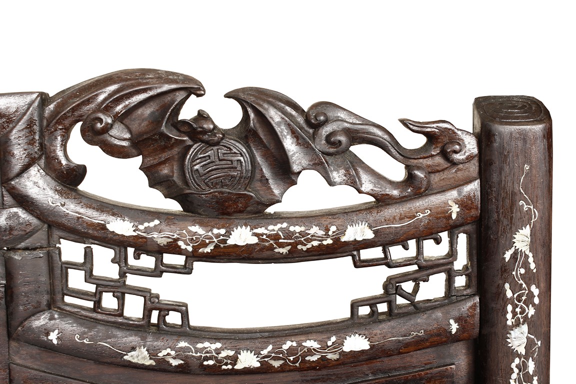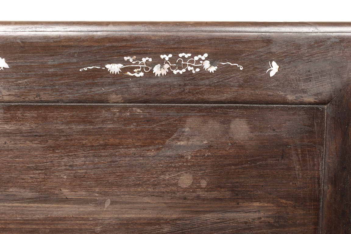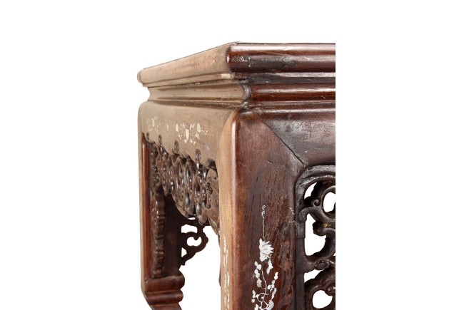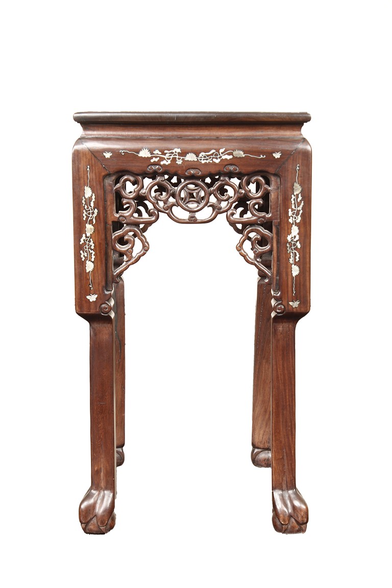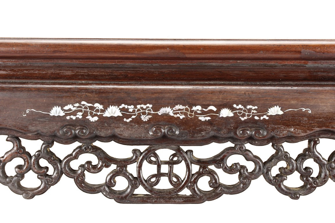 The furniture set includes four long seats, two chairs, two stands, and one table. The single piece wood table surface inset with mother-of-pearls, depicting butterflies and swallows flying near a large tree next to blossoming flowers, within a rectangular pattern, the apron pierce carved in ruyi cloud, bats, and coin shapes, another supporting board below, attached to four feet, with additional carved aprons at the corners, all stands on tapered in beast legs. The stand exhibits similar design and motif as the table, but without the supporting wooden board. The long seats and chairs have slightly differing design, the front with stylistically carved and embellished back rest depicting either cranes flying past lotus flowers and bamboo trees, between five pierce carved bats and floral patterns, the apron carved with bats and ruyi clouds, attached to beast legs. Includes Certificates of Antiquity issued from Kin Fat Antiques Curios & Woodenware Co., dated 1987. Qing Dynasty Period.