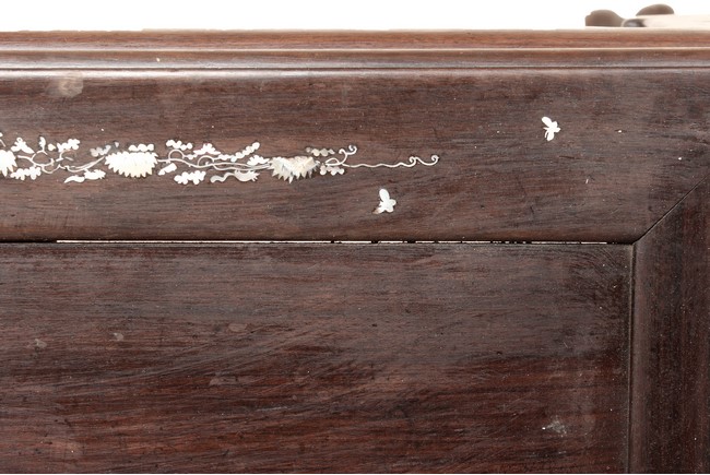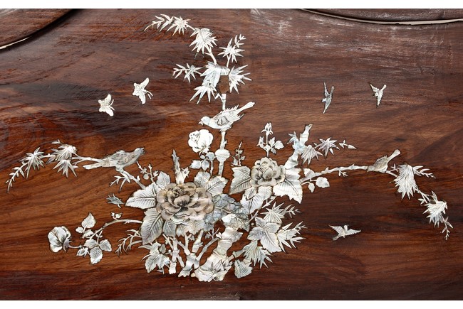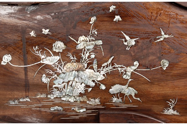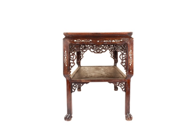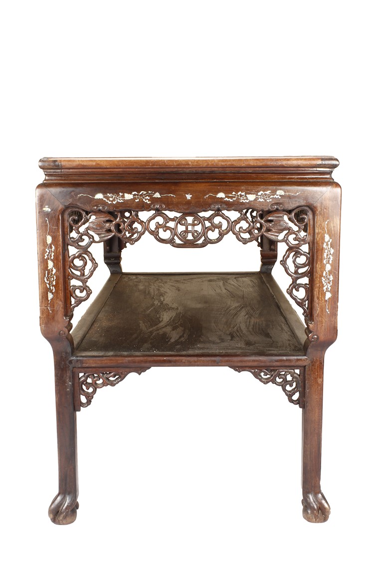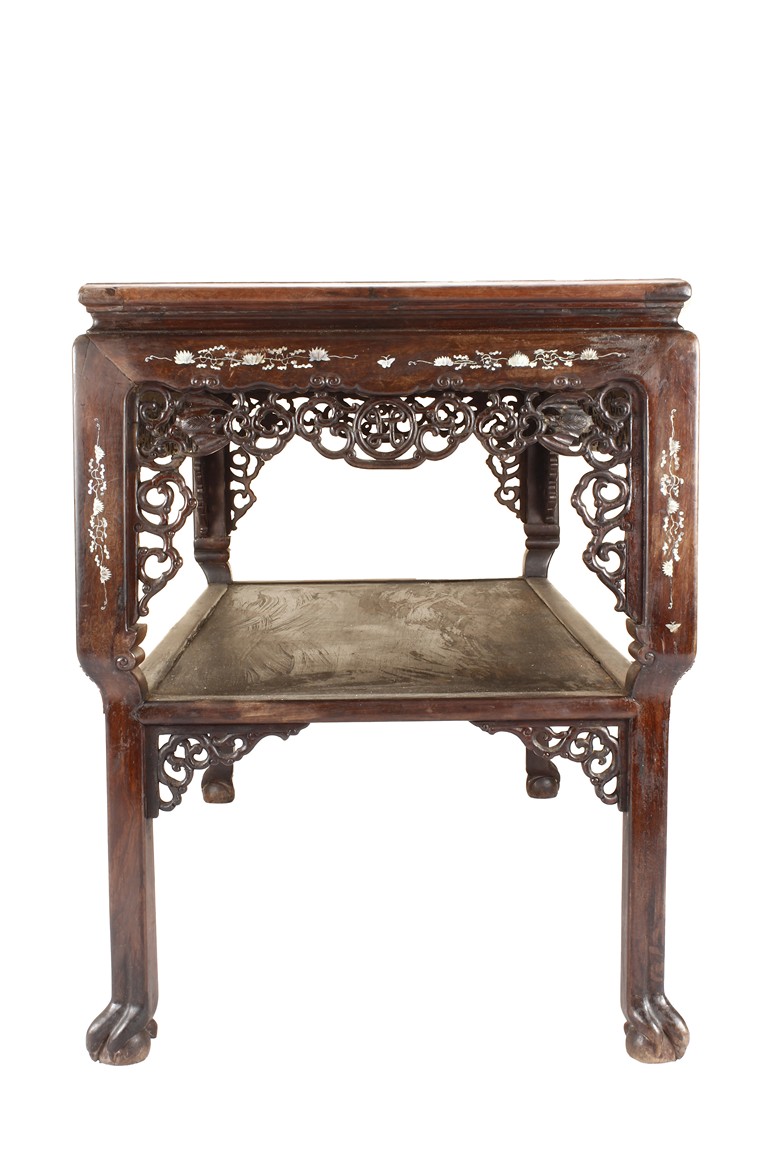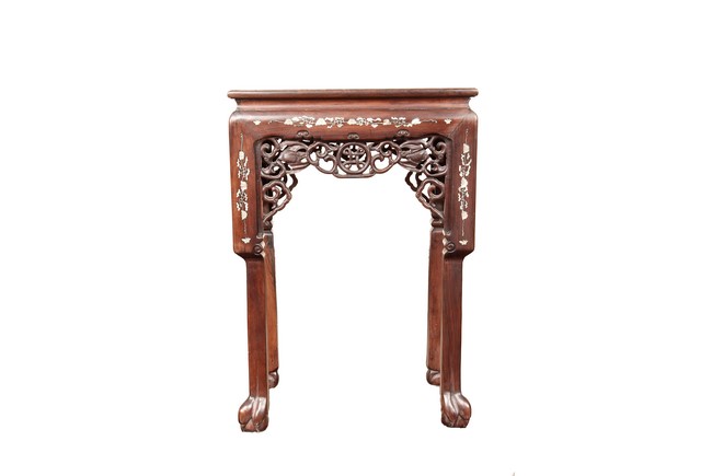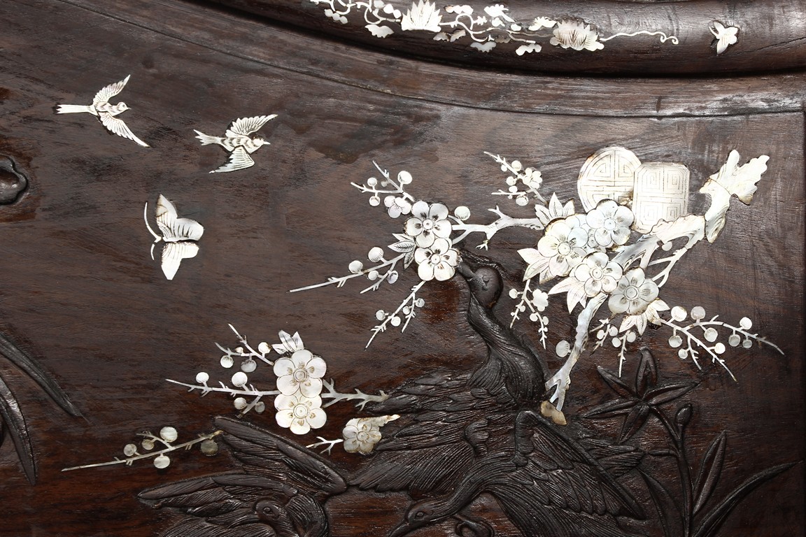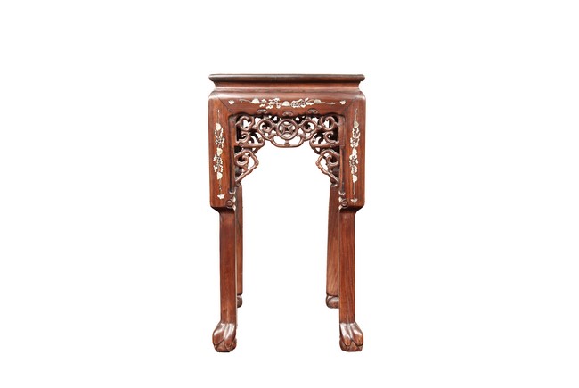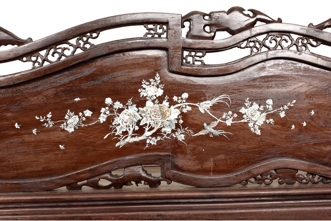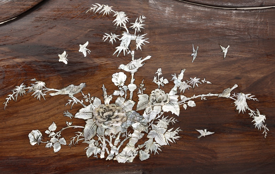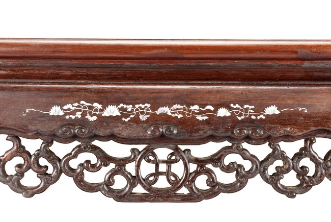 The furniture set includes four long seats, two chairs, two stands, and one table. The single piece wood table surface inset with mother-of-pearls, depicting butterflies and swallows flying near a large tree next to blossoming flowers, within a rectangular pattern, the apron pierce carved in ruyi cloud, bats, and coin shapes, another supporting board below, attached to four feet, with additional carved aprons at the corners, all stands on tapered in beast legs. The stand exhibits similar design and motif as the table, but without the supporting wooden board. The long seats and chairs have slightly differing design, the front with stylistically carved and embellished back rest depicting either cranes flying past lotus flowers and bamboo trees, between five pierce carved bats and floral patterns, the apron carved with bats and ruyi clouds, attached to beast legs. Includes Certificates of Antiquity issued from Kin Fat Antiques Curios & Woodenware Co., dated 1987. Qing Dynasty Period.