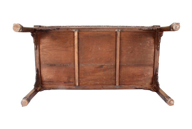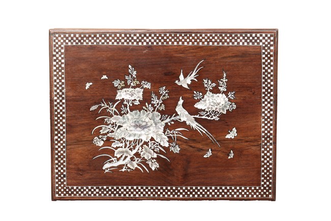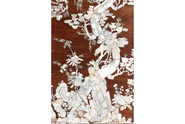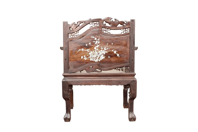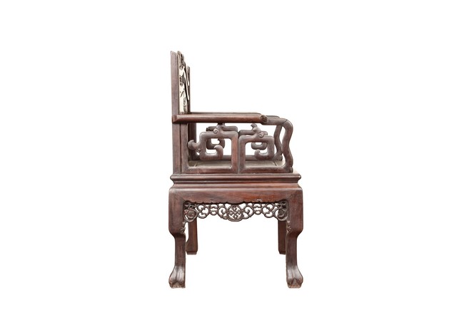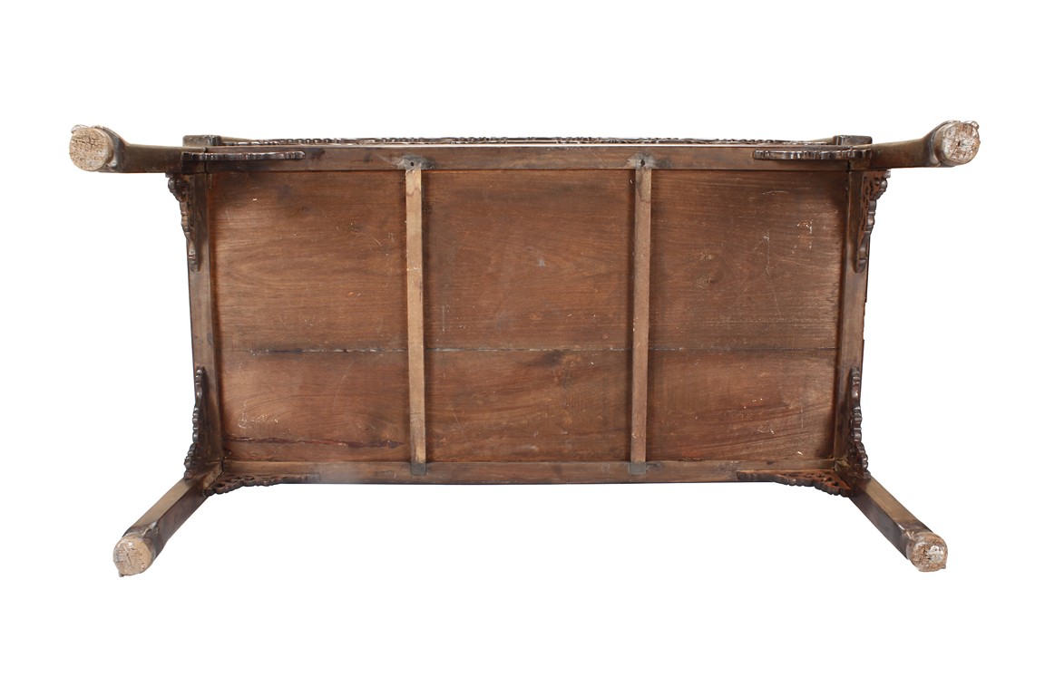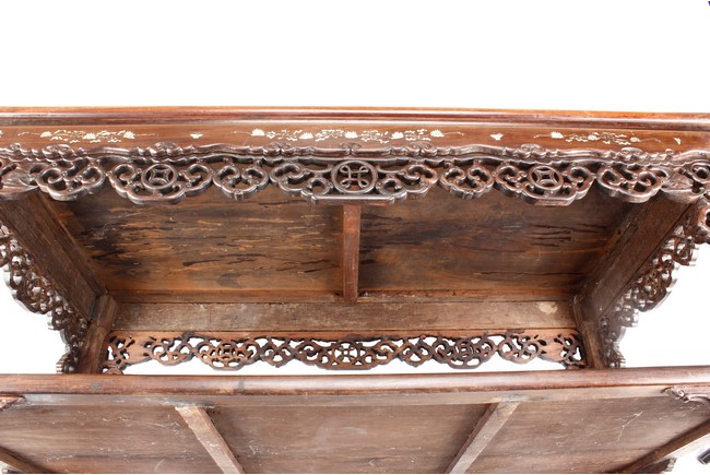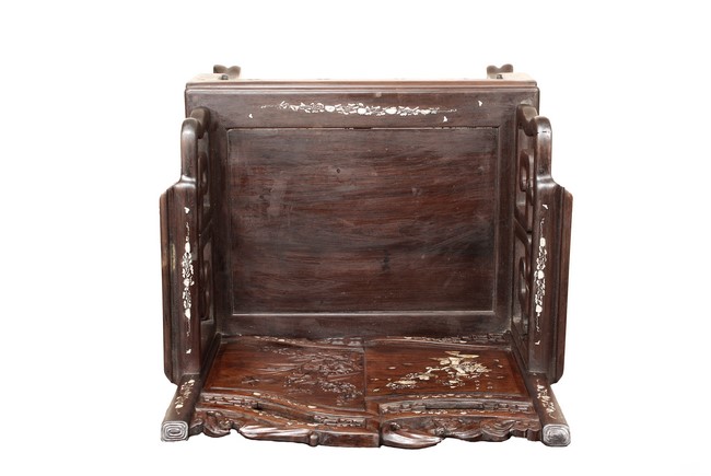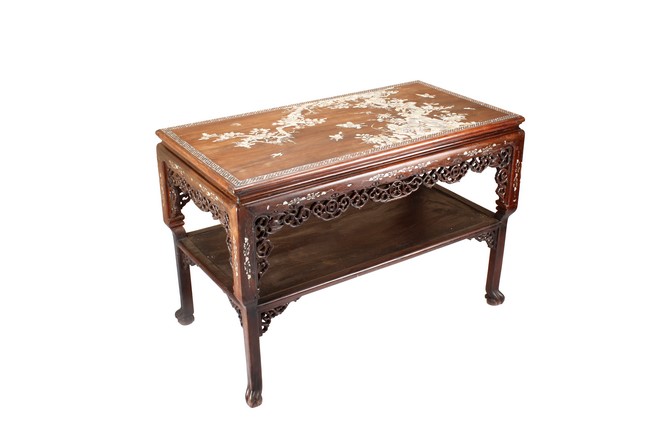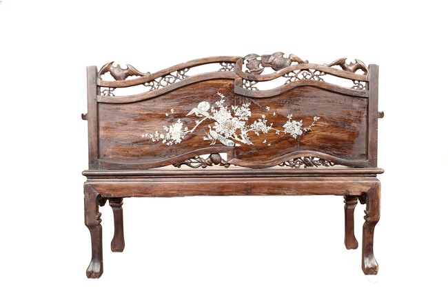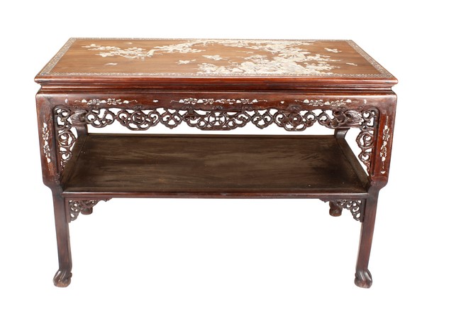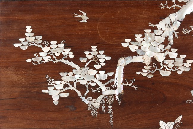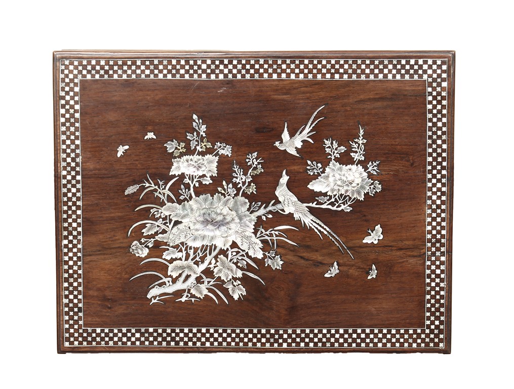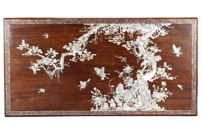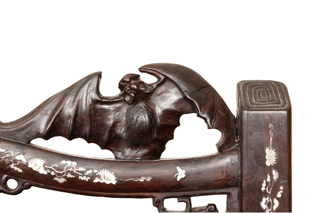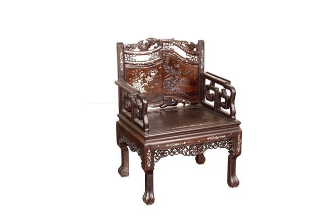 The furniture set includes four long seats, two chairs, two stands, and one table. The single piece wood table surface inset with mother-of-pearls, depicting butterflies and swallows flying near a large tree next to blossoming flowers, within a rectangular pattern, the apron pierce carved in ruyi cloud, bats, and coin shapes, another supporting board below, attached to four feet, with additional carved aprons at the corners, all stands on tapered in beast legs. The stand exhibits similar design and motif as the table, but without the supporting wooden board. The long seats and chairs have slightly differing design, the front with stylistically carved and embellished back rest depicting either cranes flying past lotus flowers and bamboo trees, between five pierce carved bats and floral patterns, the apron carved with bats and ruyi clouds, attached to beast legs. Includes Certificates of Antiquity issued from Kin Fat Antiques Curios & Woodenware Co., dated 1987. Qing Dynasty Period.