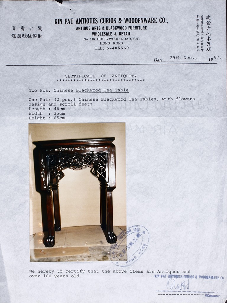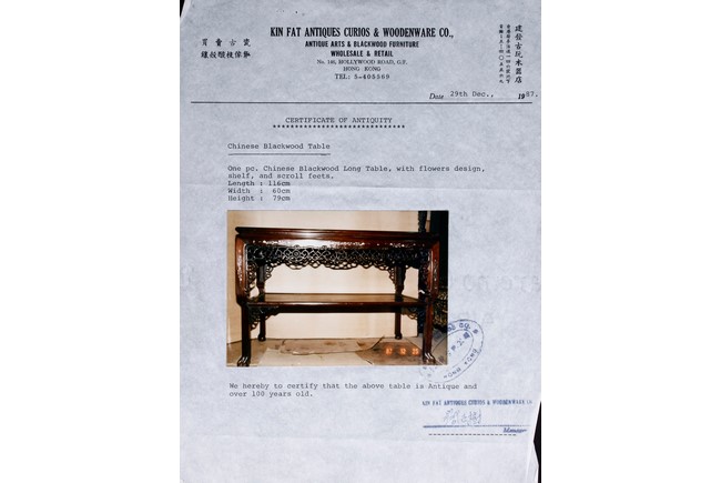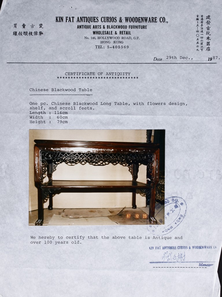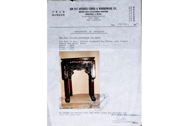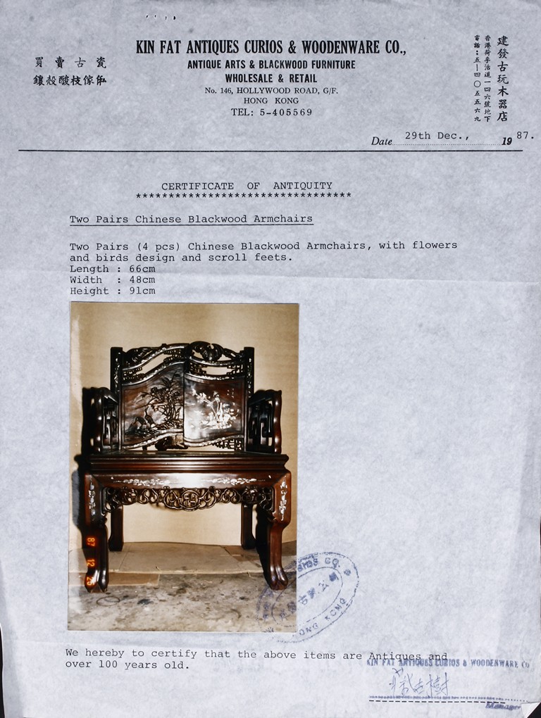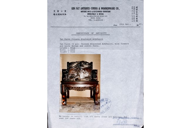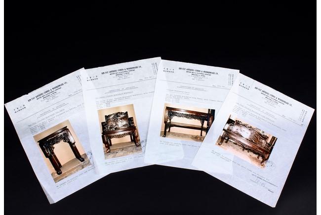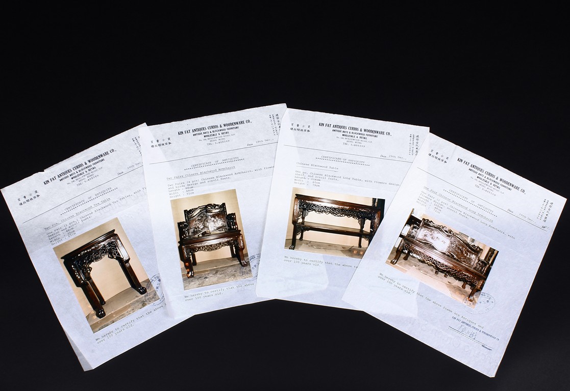 此九件家具,作工精細,圖案分明,氣派,有歷史感,另附早期香港"建發古玩木器店" (1987年) 證書一套。