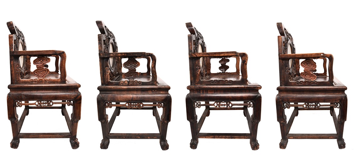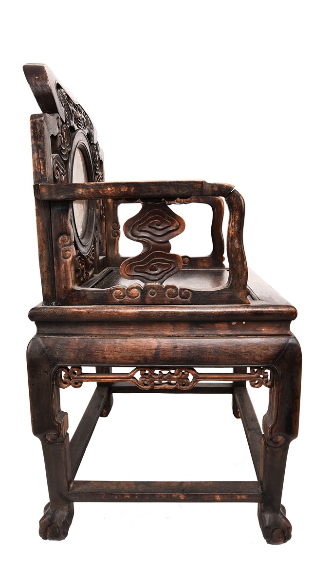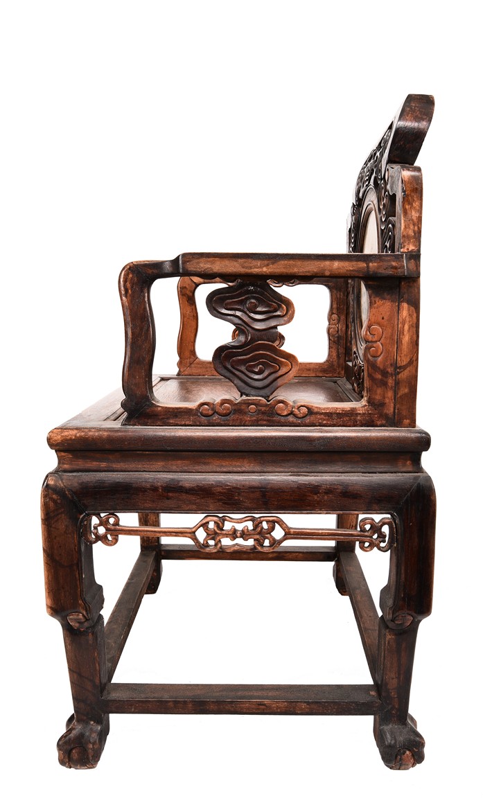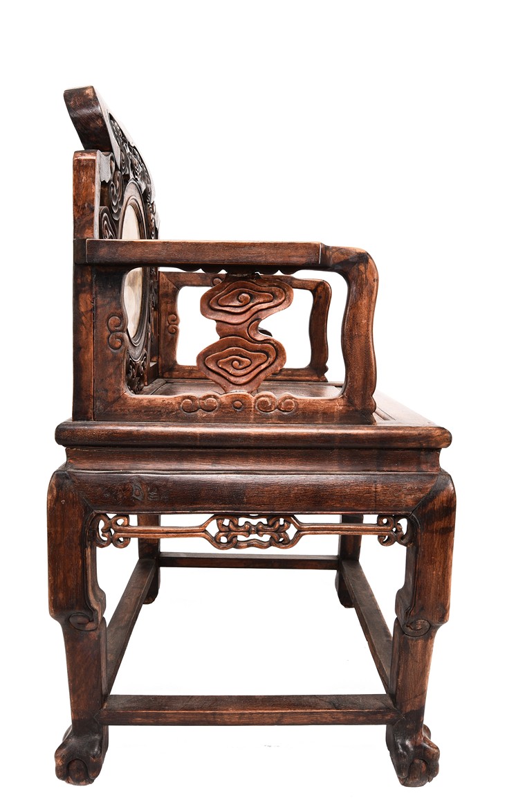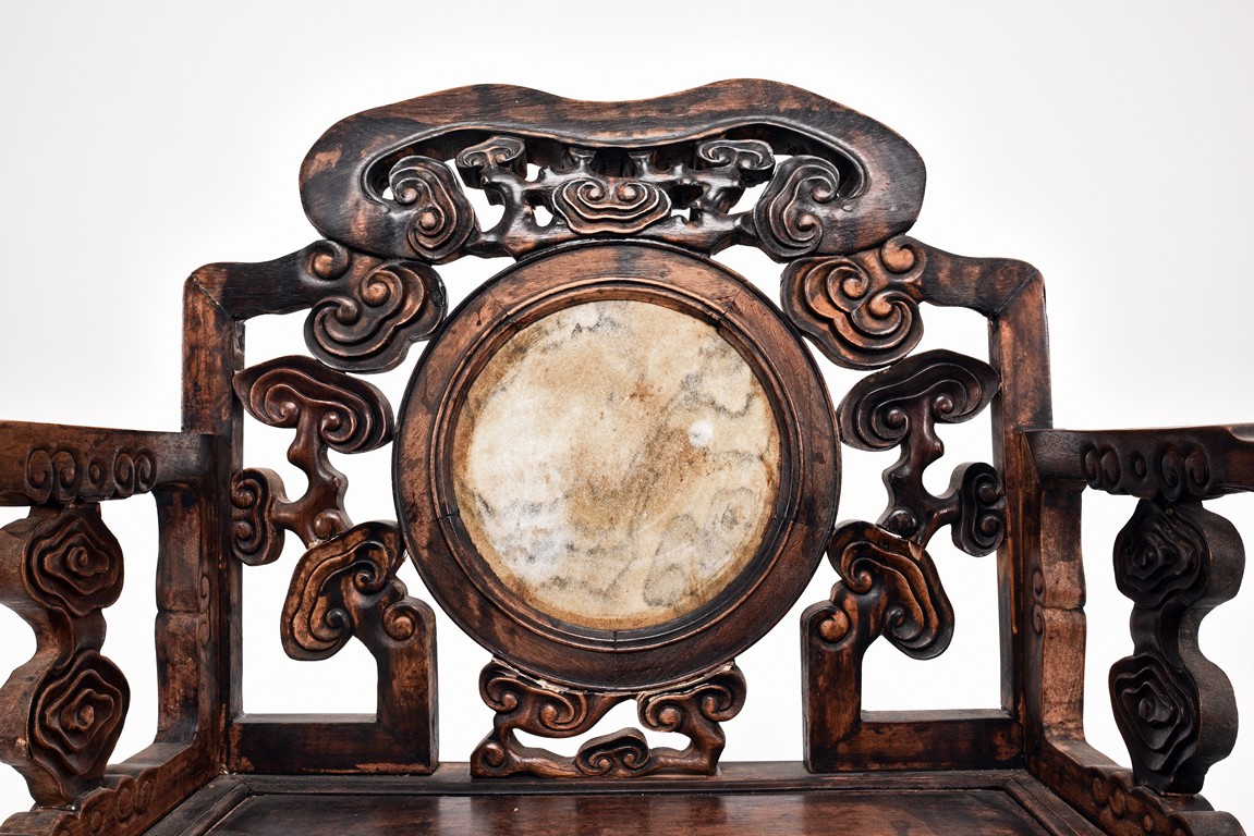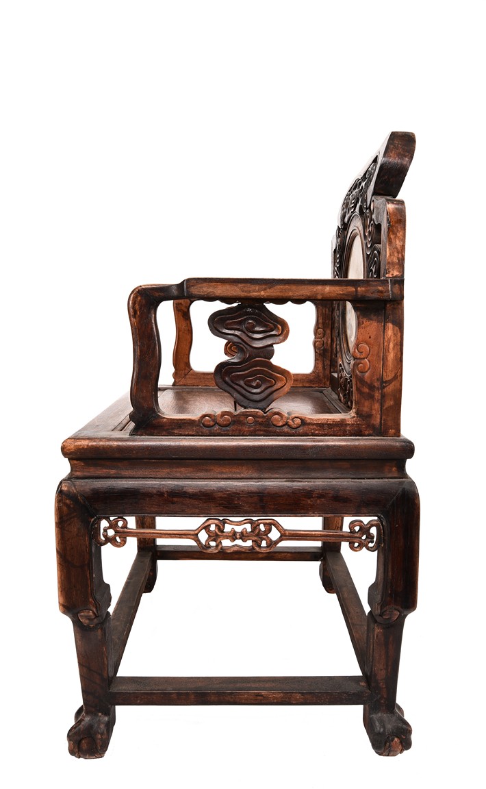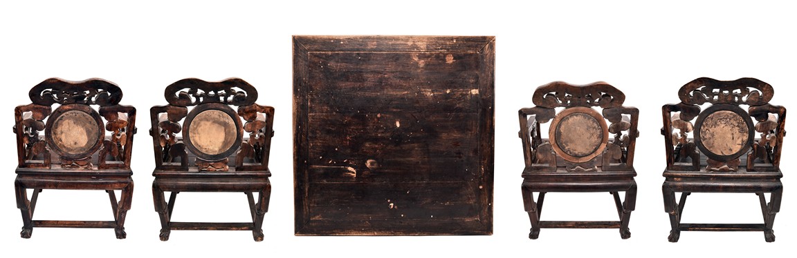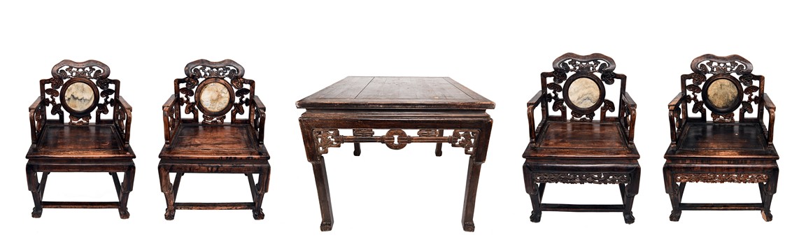 Each chair inset with a circular marbel panels as back splat, surrounded by pierced and carved lingzhi, the recessed waist underneath the hard board seat, supported on cabriole legs joined by stretchers; the table has top panels set within square frame, with recessed waist underneath, the apron reticulated with pattern. Qing Dynasty period.