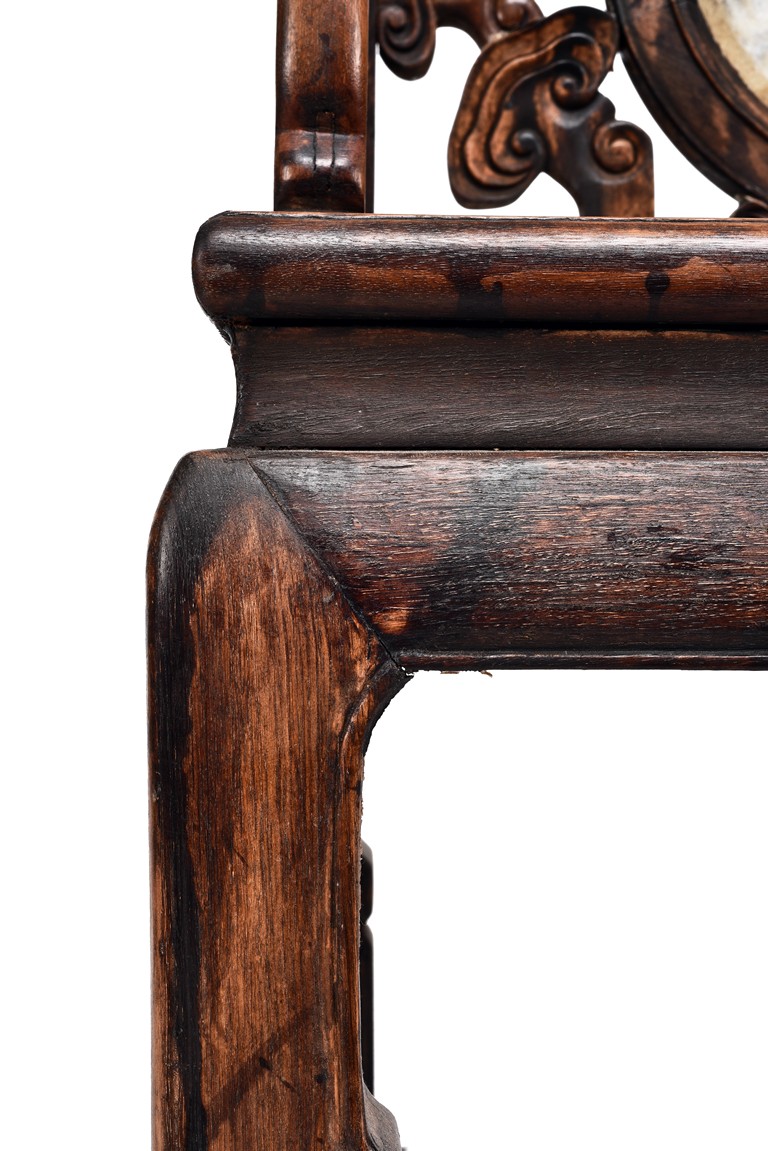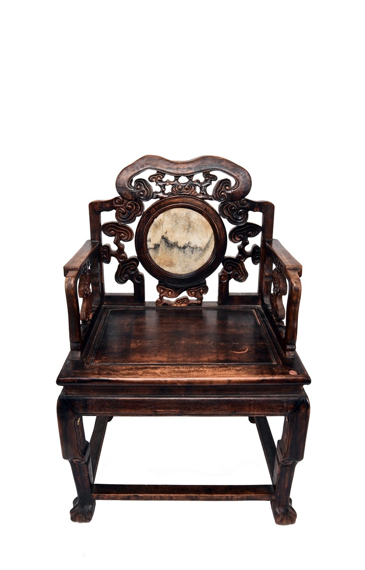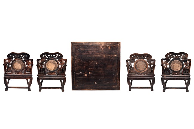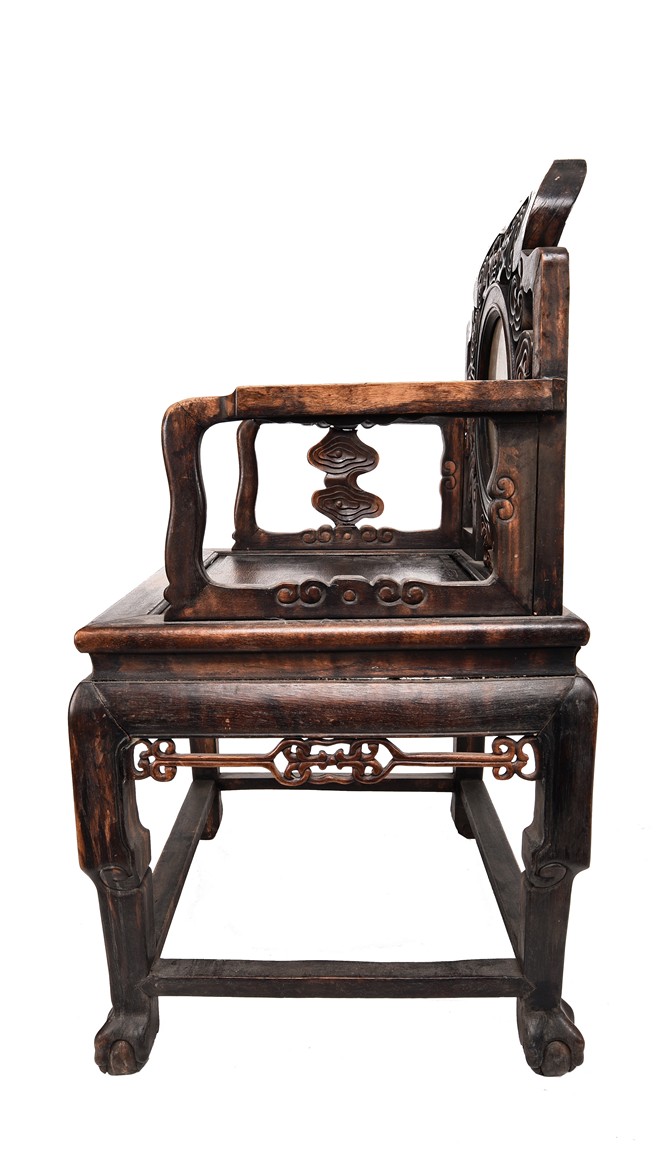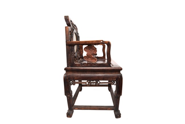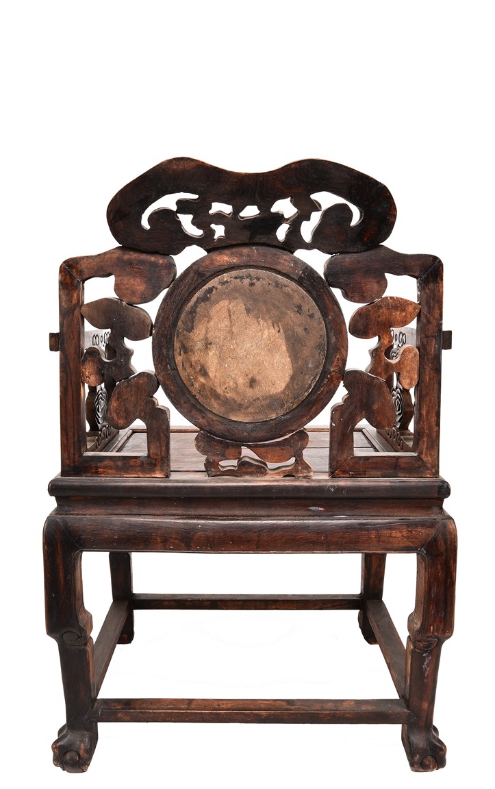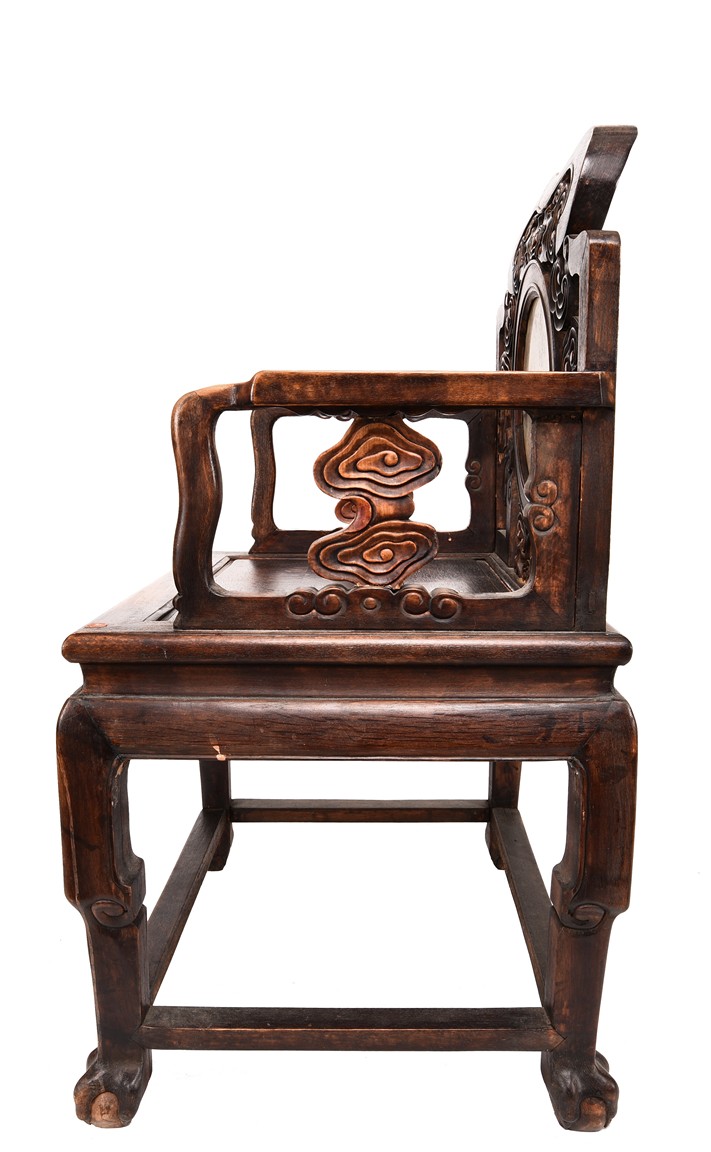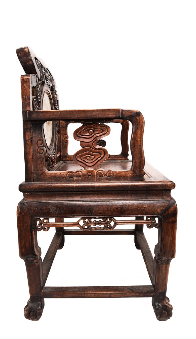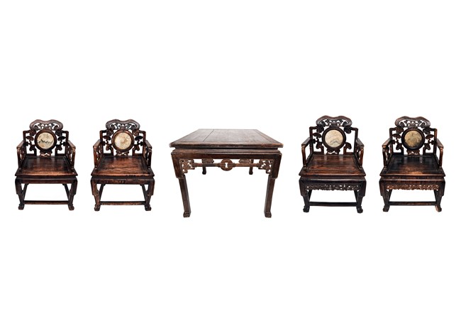 Each chair inset with a circular marbel panels as back splat, surrounded by pierced and carved lingzhi, the recessed waist underneath the hard board seat, supported on cabriole legs joined by stretchers; the table has top panels set within square frame, with recessed waist underneath, the apron reticulated with pattern. Qing Dynasty period.