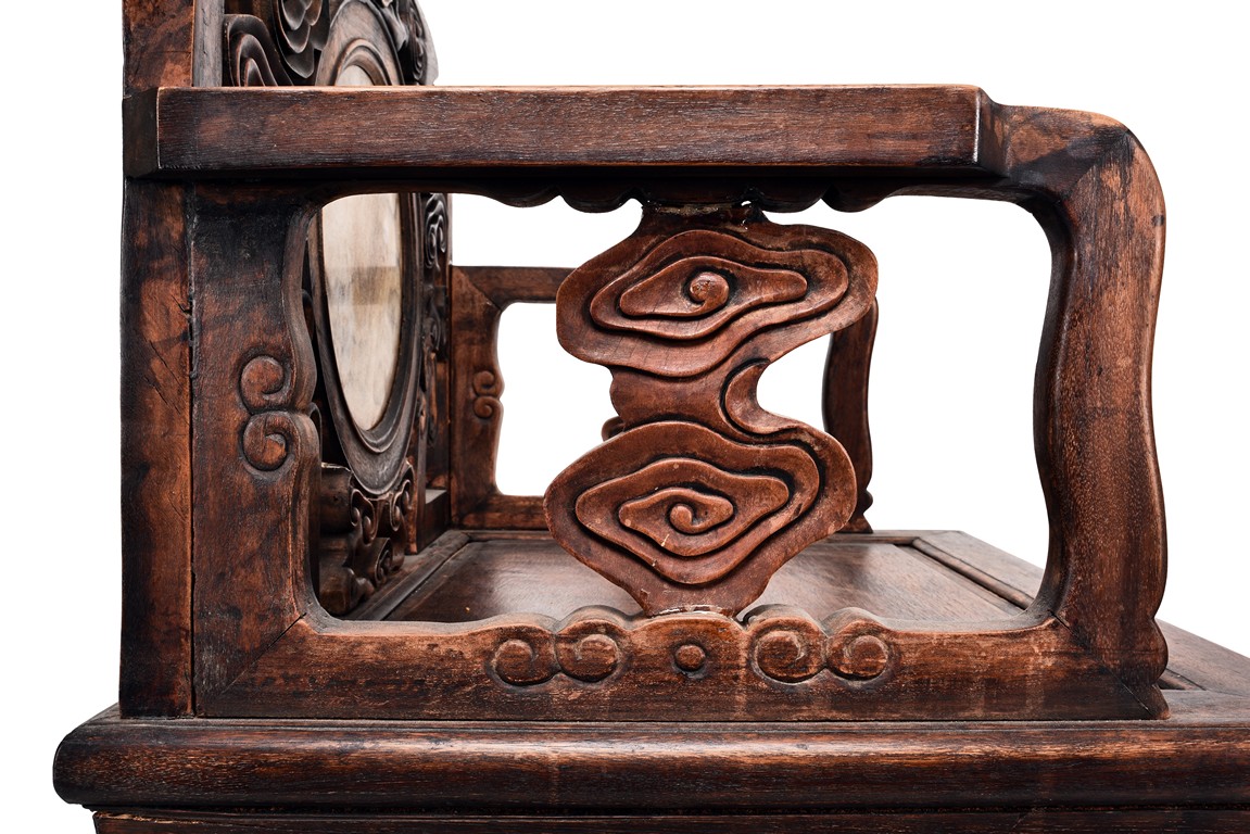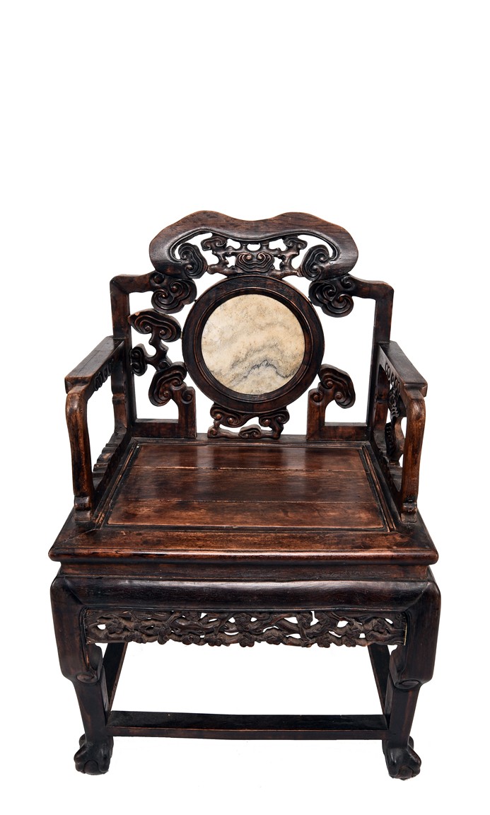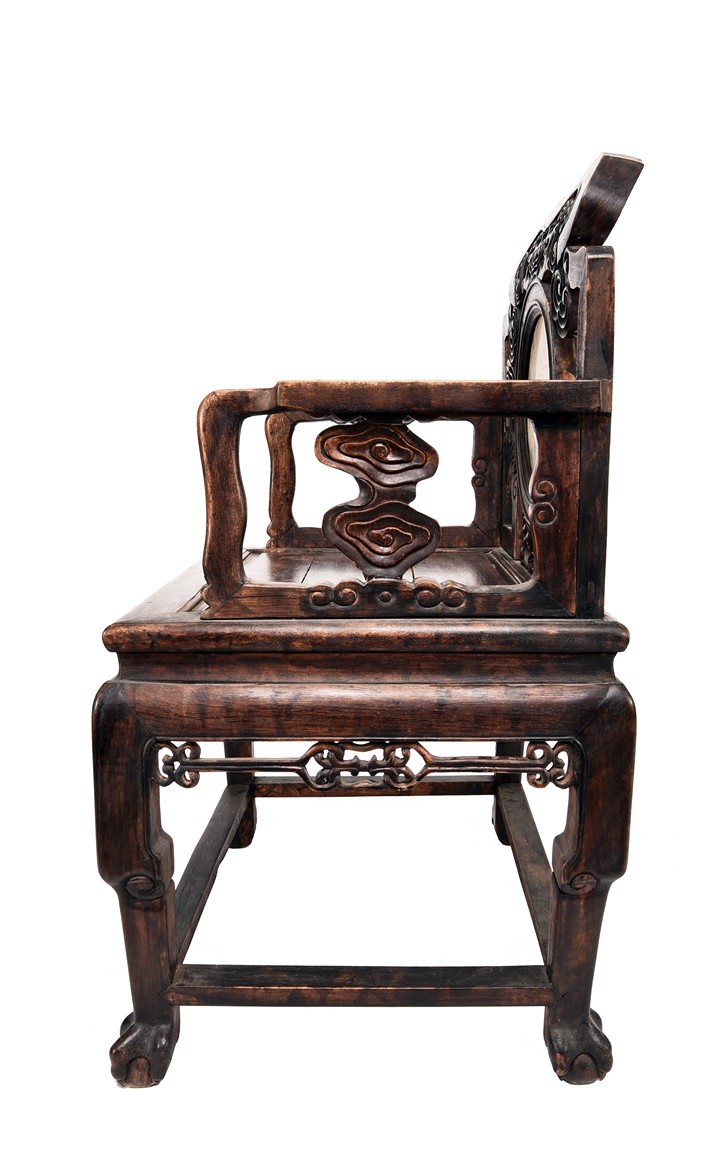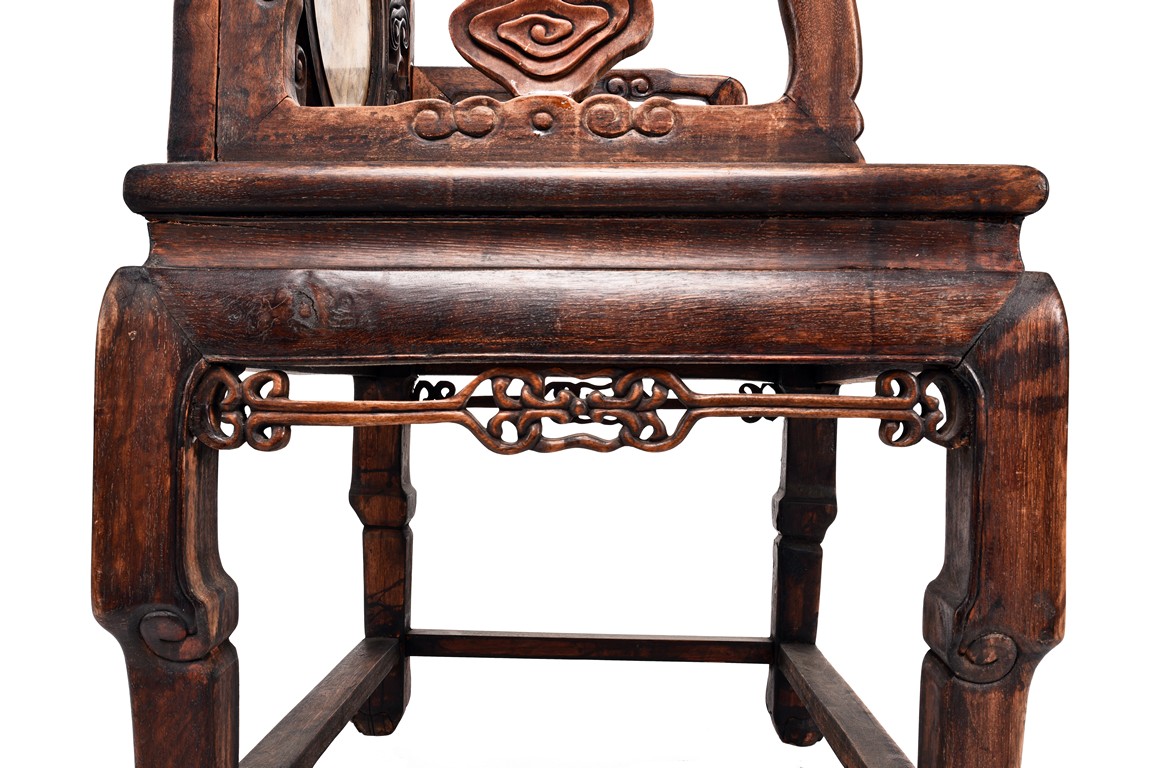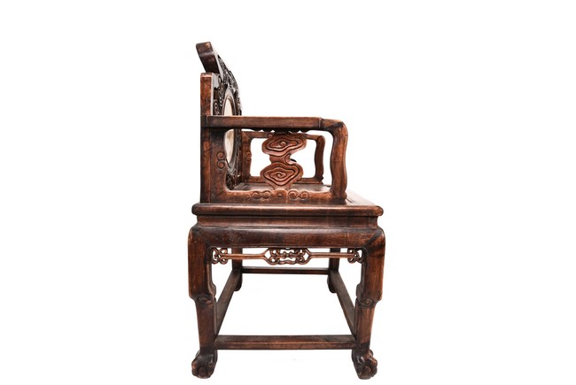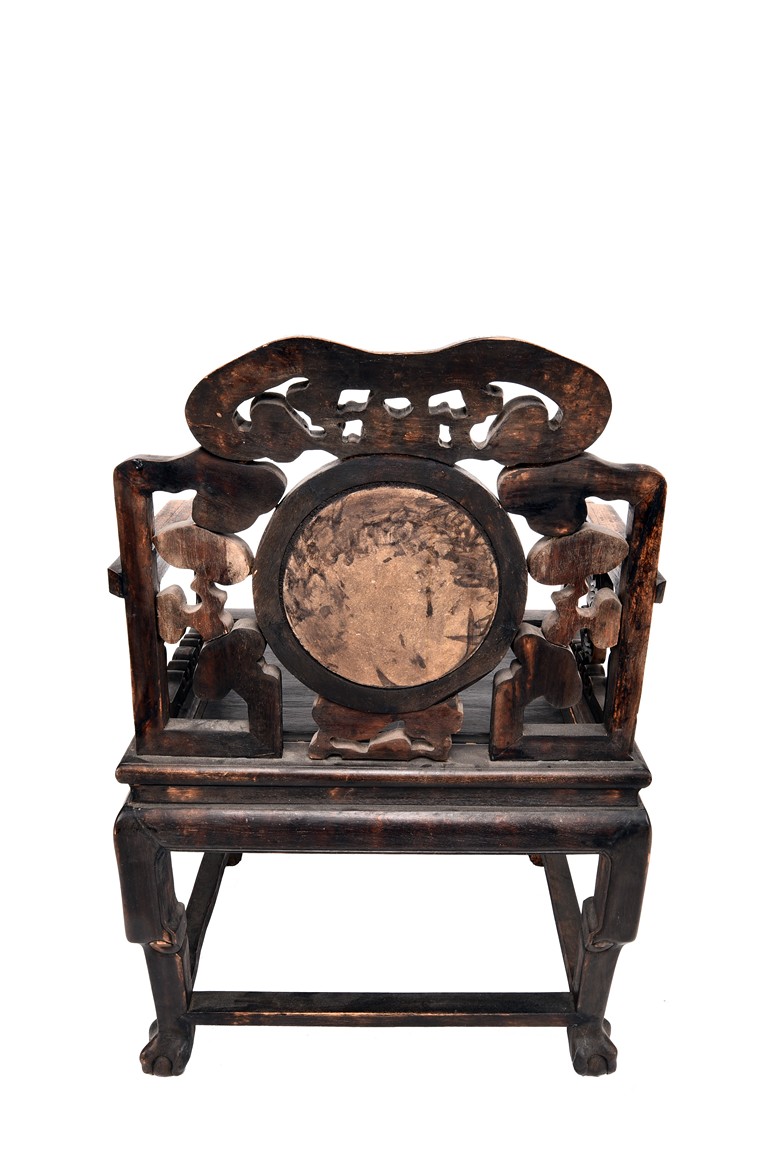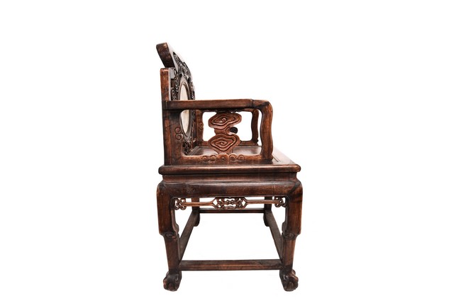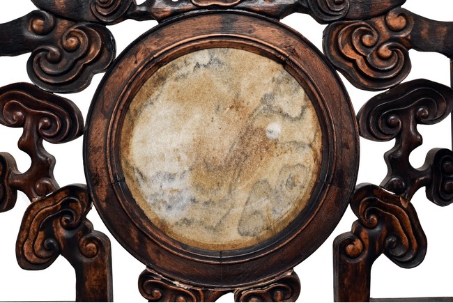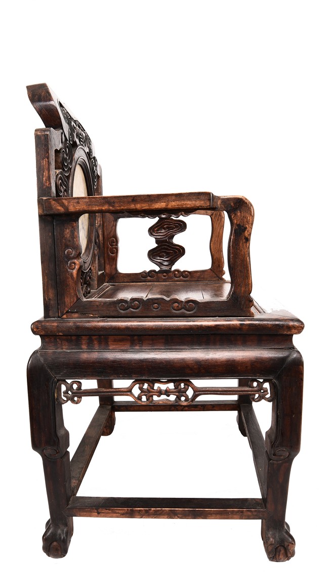 Each chair inset with a circular marbel panels as back splat, surrounded by pierced and carved lingzhi, the recessed waist underneath the hard board seat, supported on cabriole legs joined by stretchers; the table has top panels set within square frame, with recessed waist underneath, the apron reticulated with pattern. Qing Dynasty period.