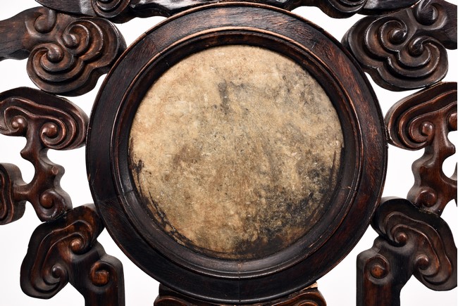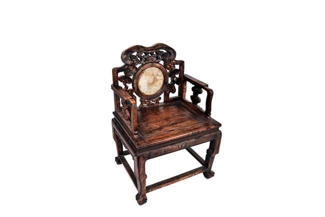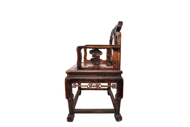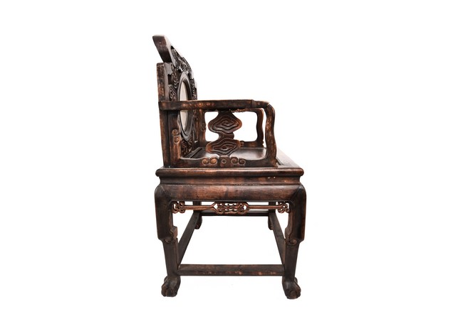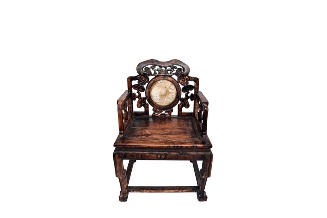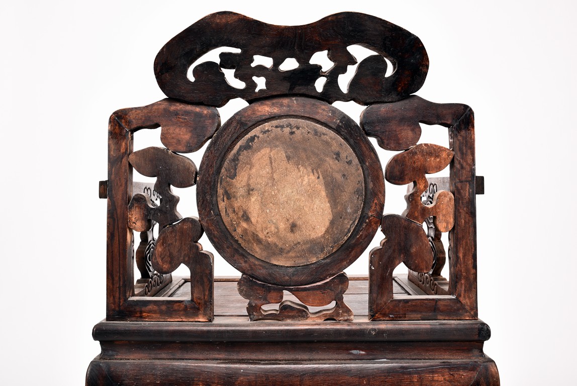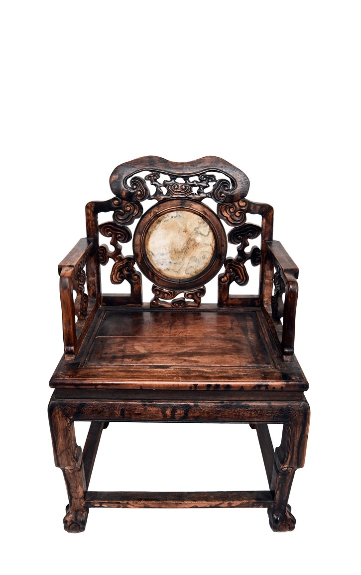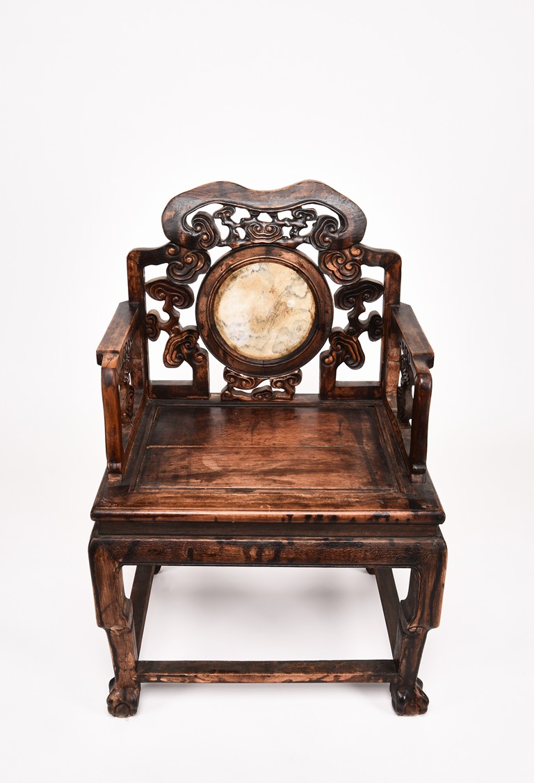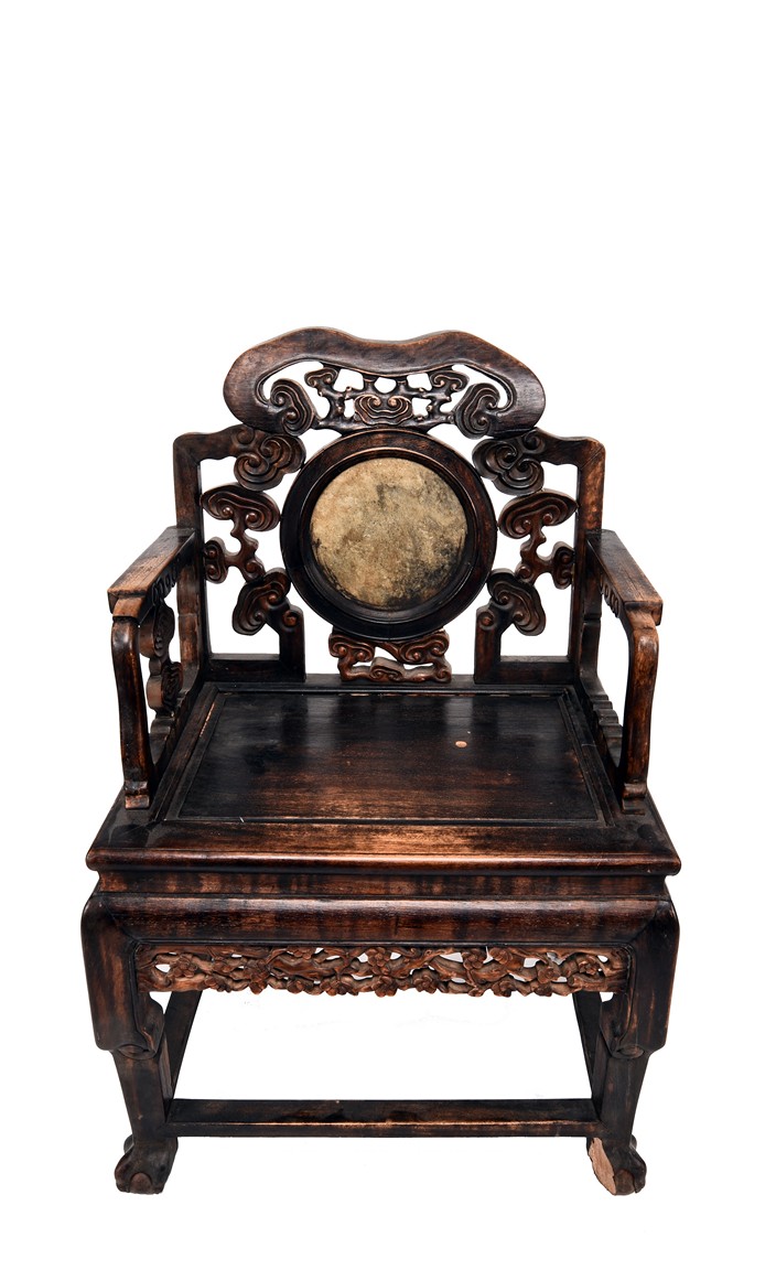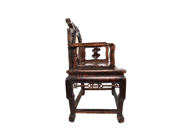 Each chair inset with a circular marbel panels as back splat, surrounded by pierced and carved lingzhi, the recessed waist underneath the hard board seat, supported on cabriole legs joined by stretchers; the table has top panels set within square frame, with recessed waist underneath, the apron reticulated with pattern. Qing Dynasty period.