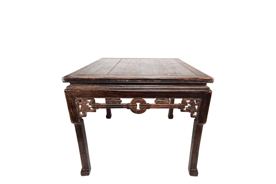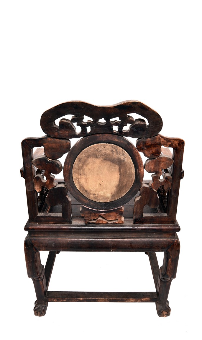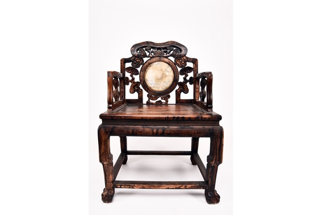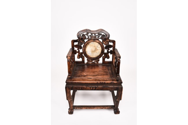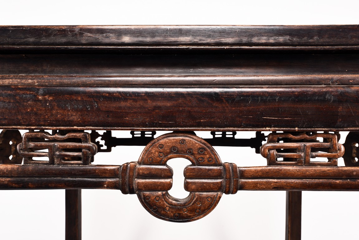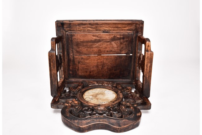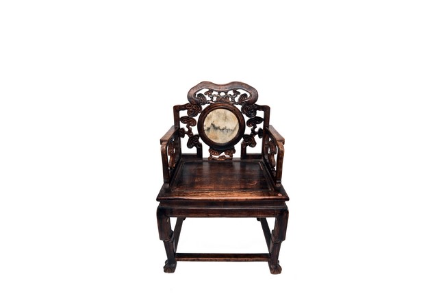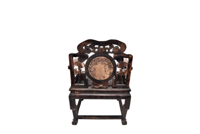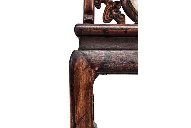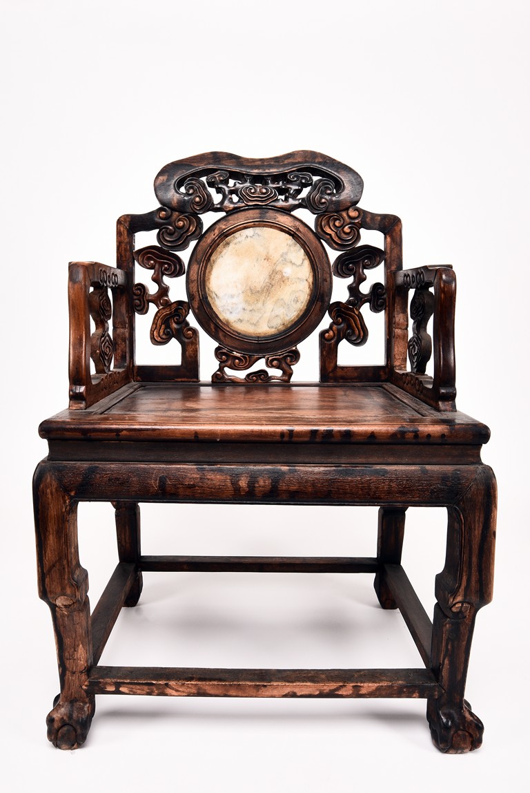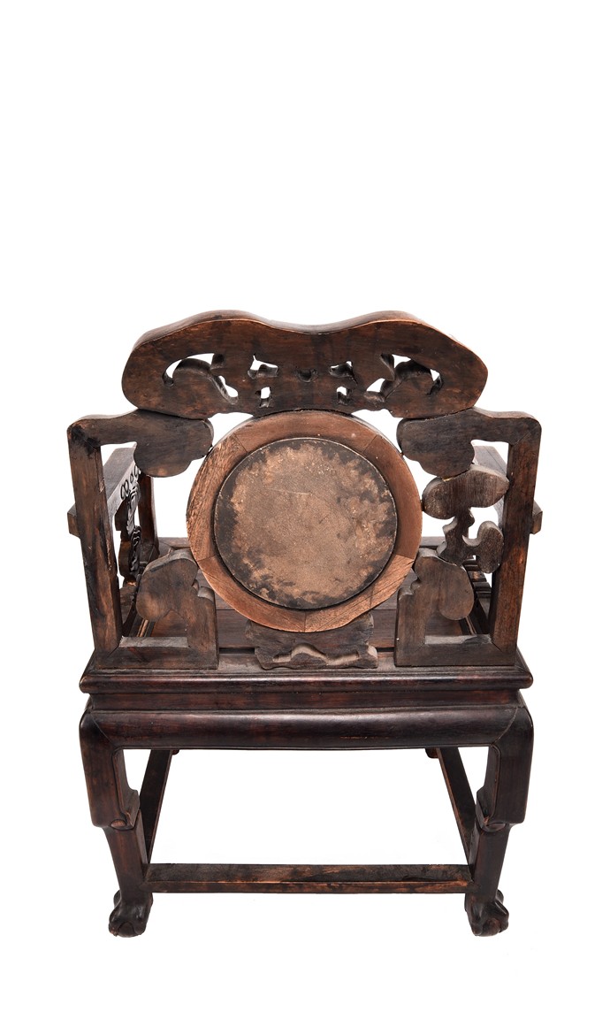Each chair inset with a circular marbel panels as back splat, surrounded by pierced and carved lingzhi, the recessed waist underneath the hard board seat, supported on cabriole legs joined by stretchers; the table has top panels set within square frame, with recessed waist underneath, the apron reticulated with pattern. Qing Dynasty period.
