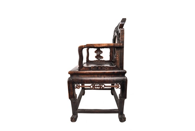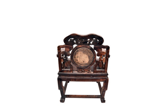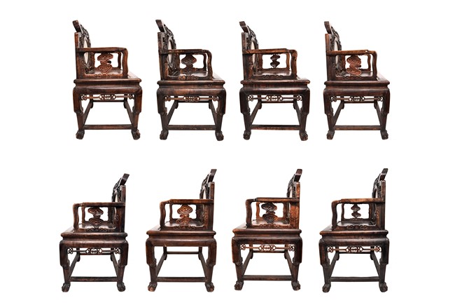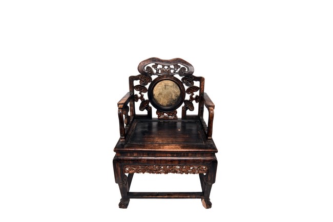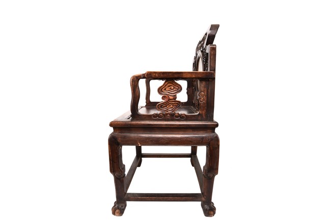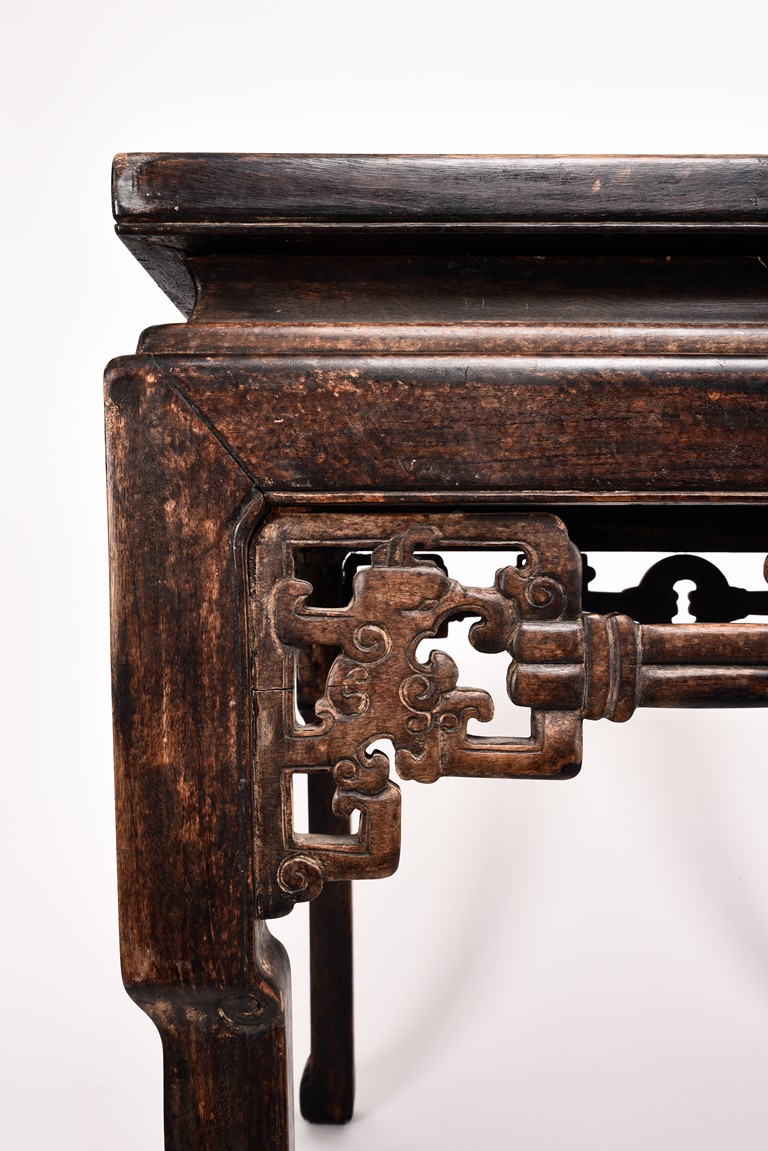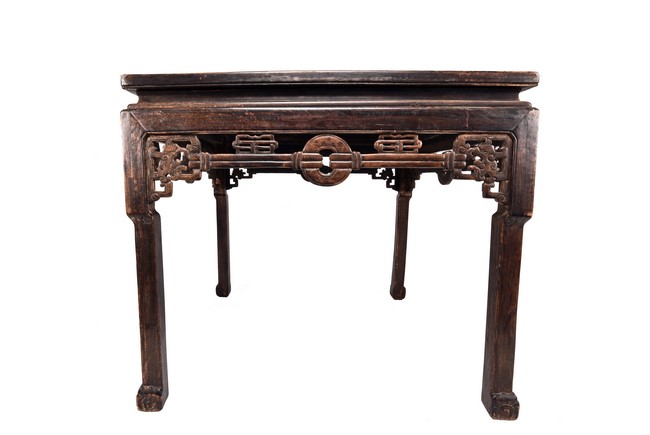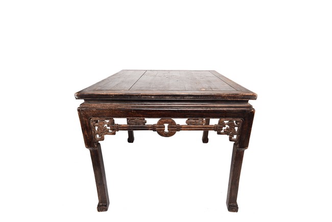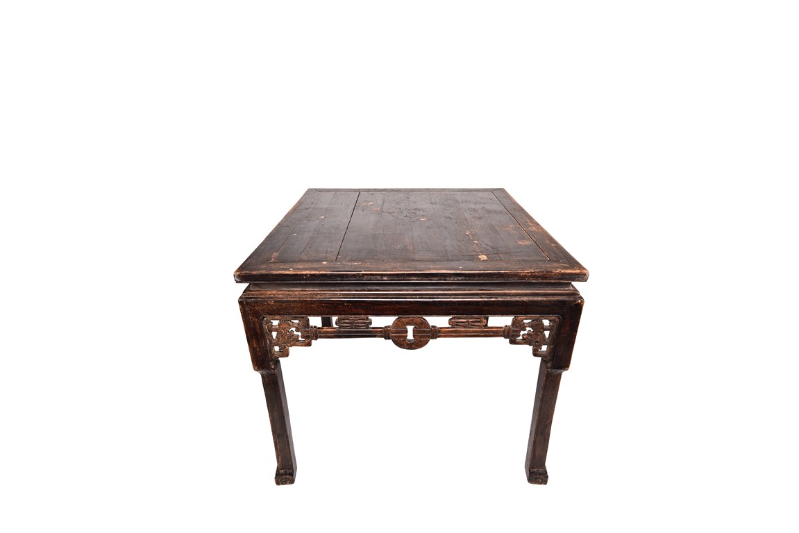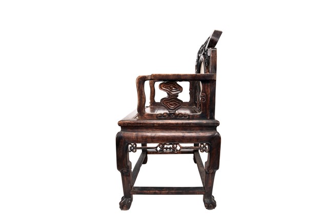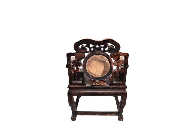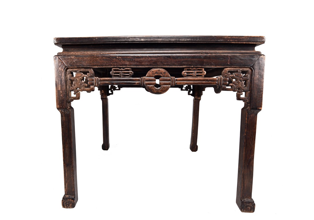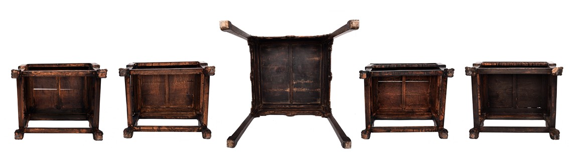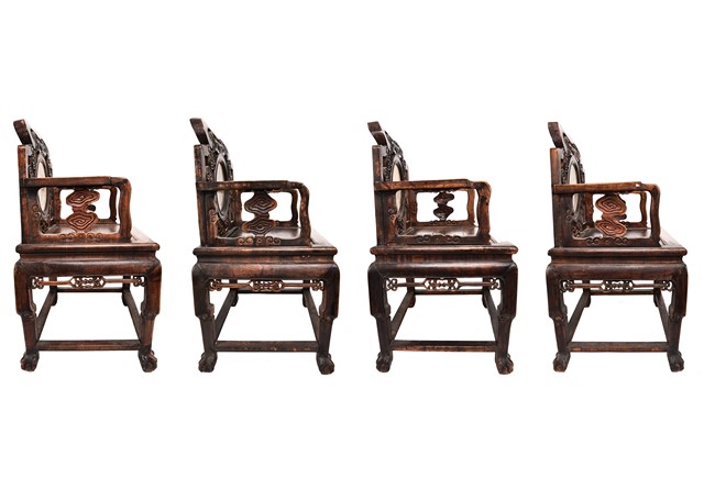 Each chair inset with a circular marbel panels as back splat, surrounded by pierced and carved lingzhi, the recessed waist underneath the hard board seat, supported on cabriole legs joined by stretchers; the table has top panels set within square frame, with recessed waist underneath, the apron reticulated with pattern. Qing Dynasty period.