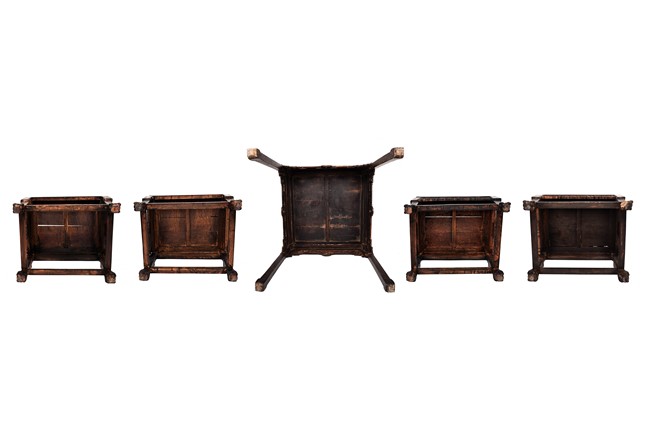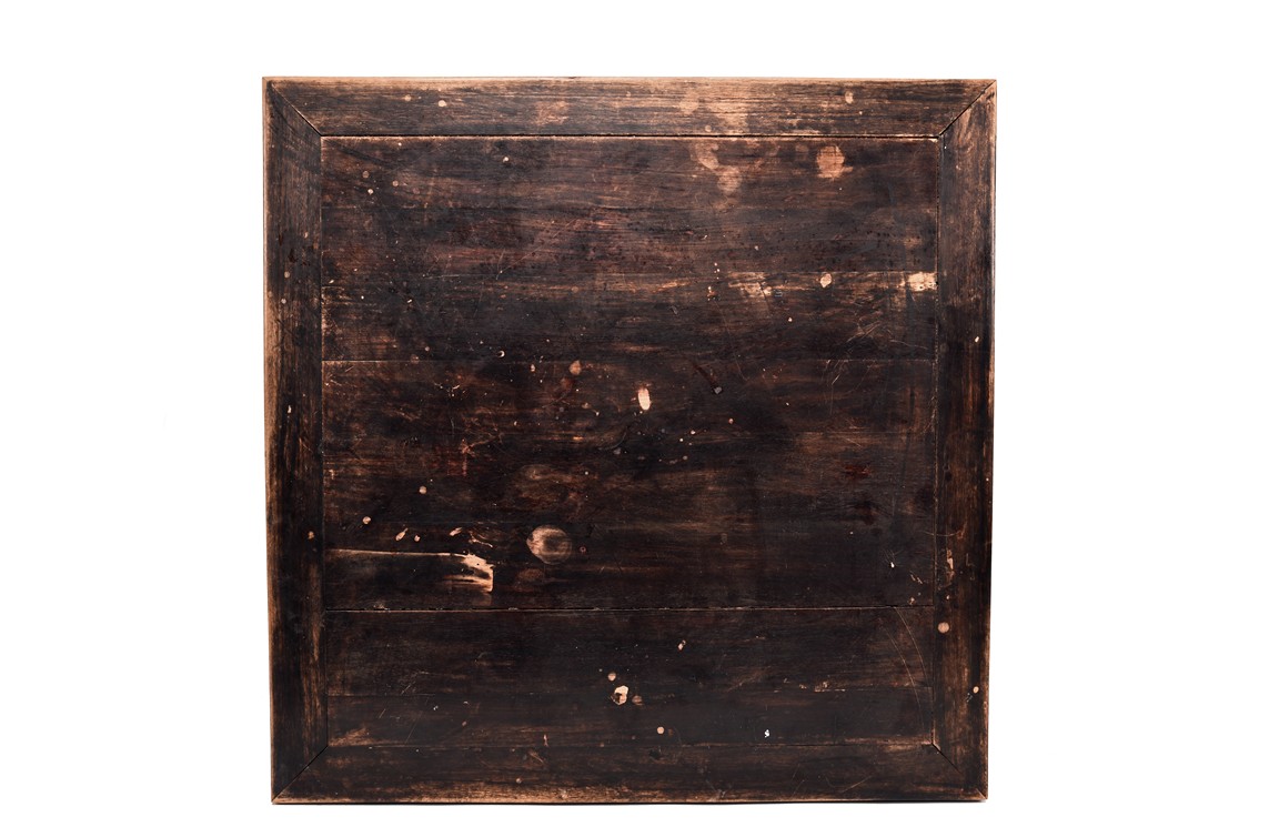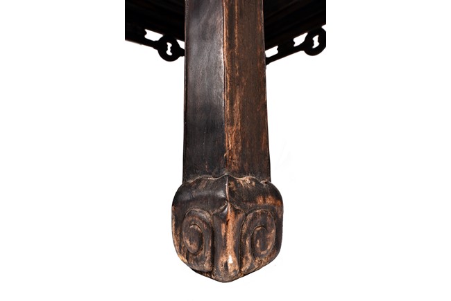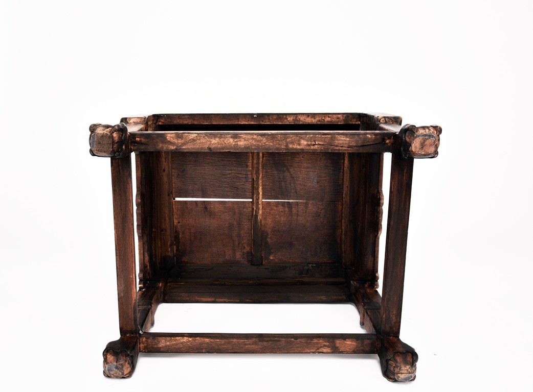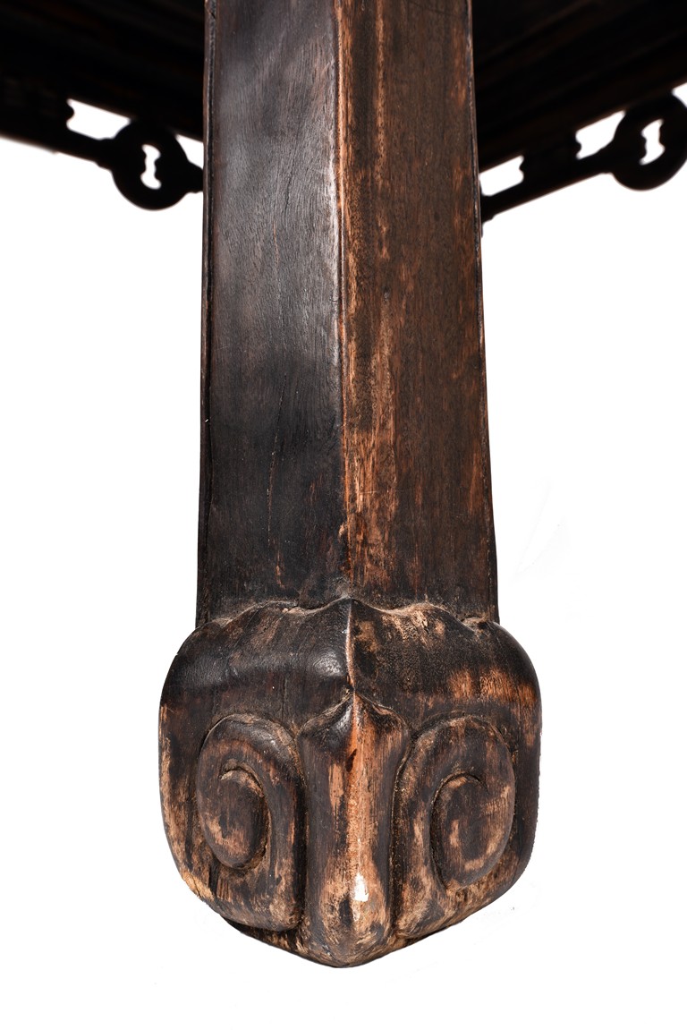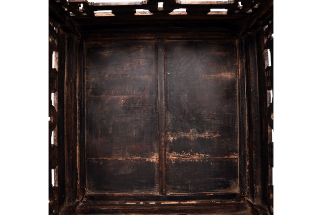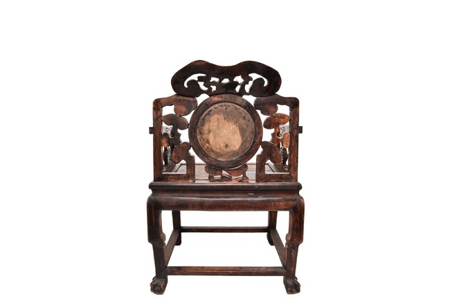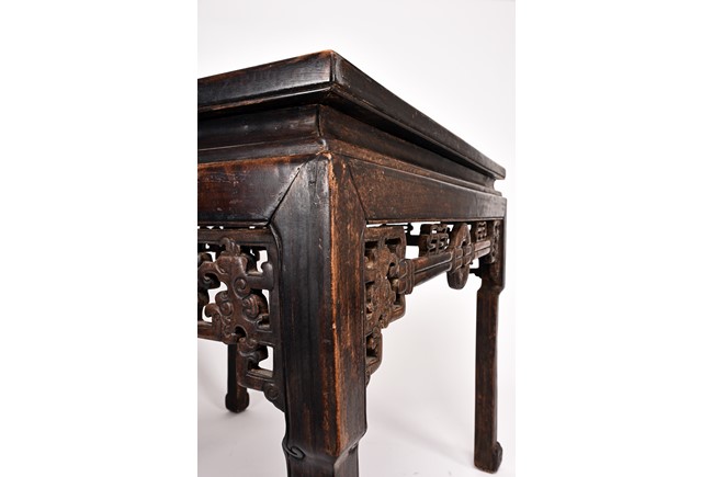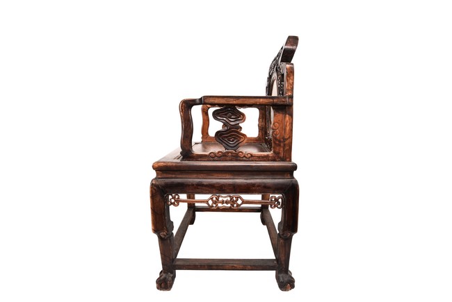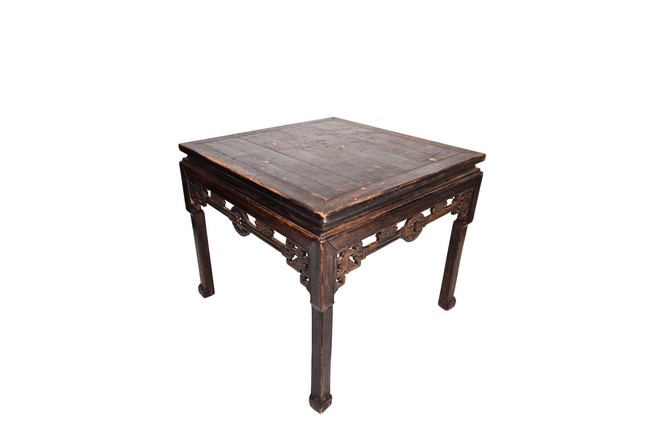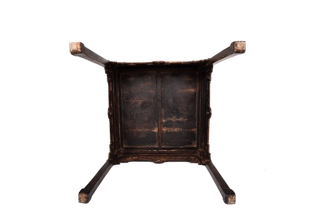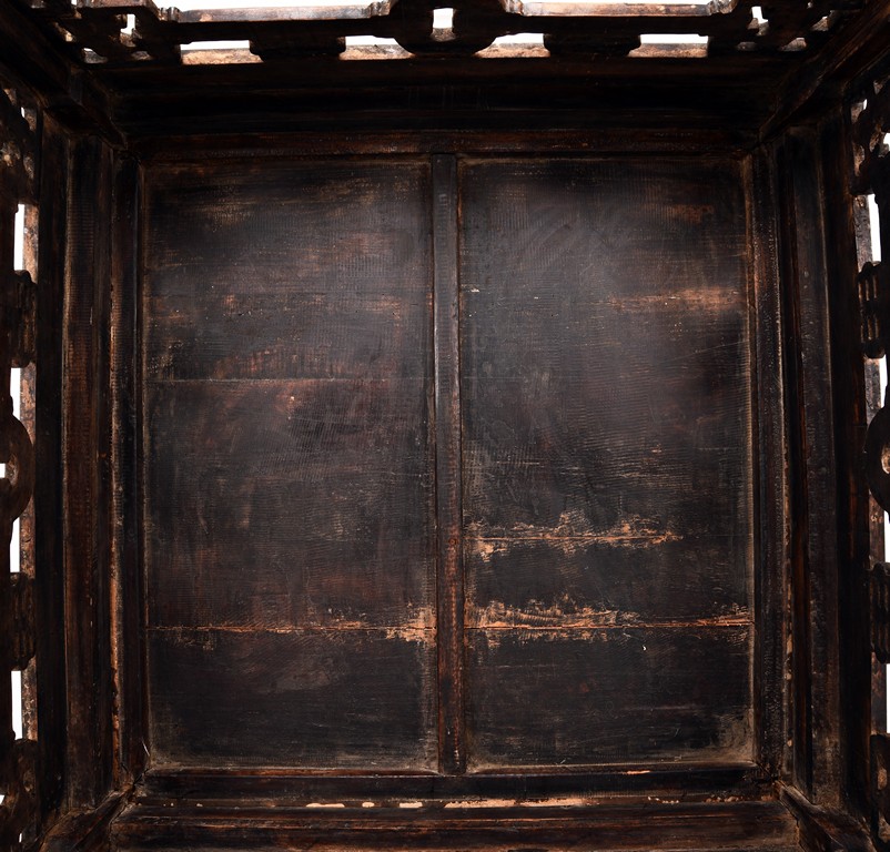 Each chair inset with a circular marbel panels as back splat, surrounded by pierced and carved lingzhi, the recessed waist underneath the hard board seat, supported on cabriole legs joined by stretchers; the table has top panels set within square frame, with recessed waist underneath, the apron reticulated with pattern. Qing Dynasty period.