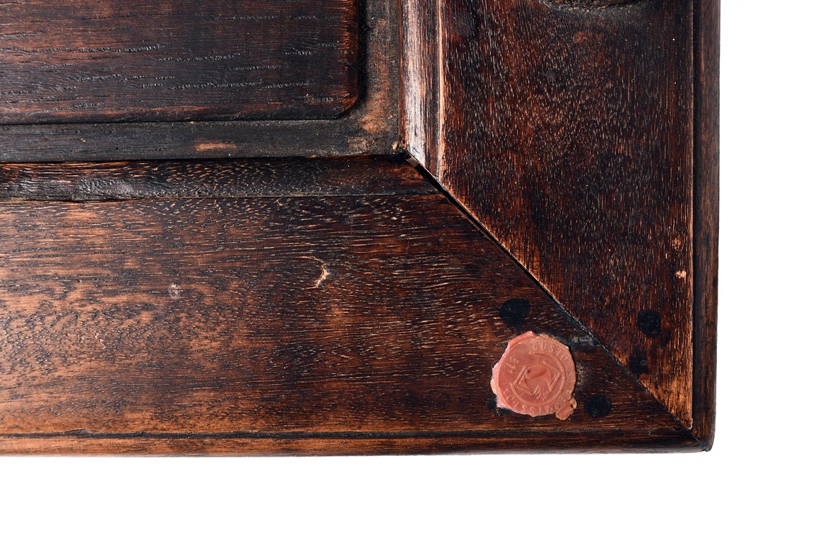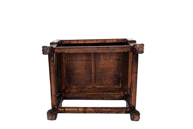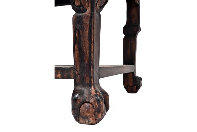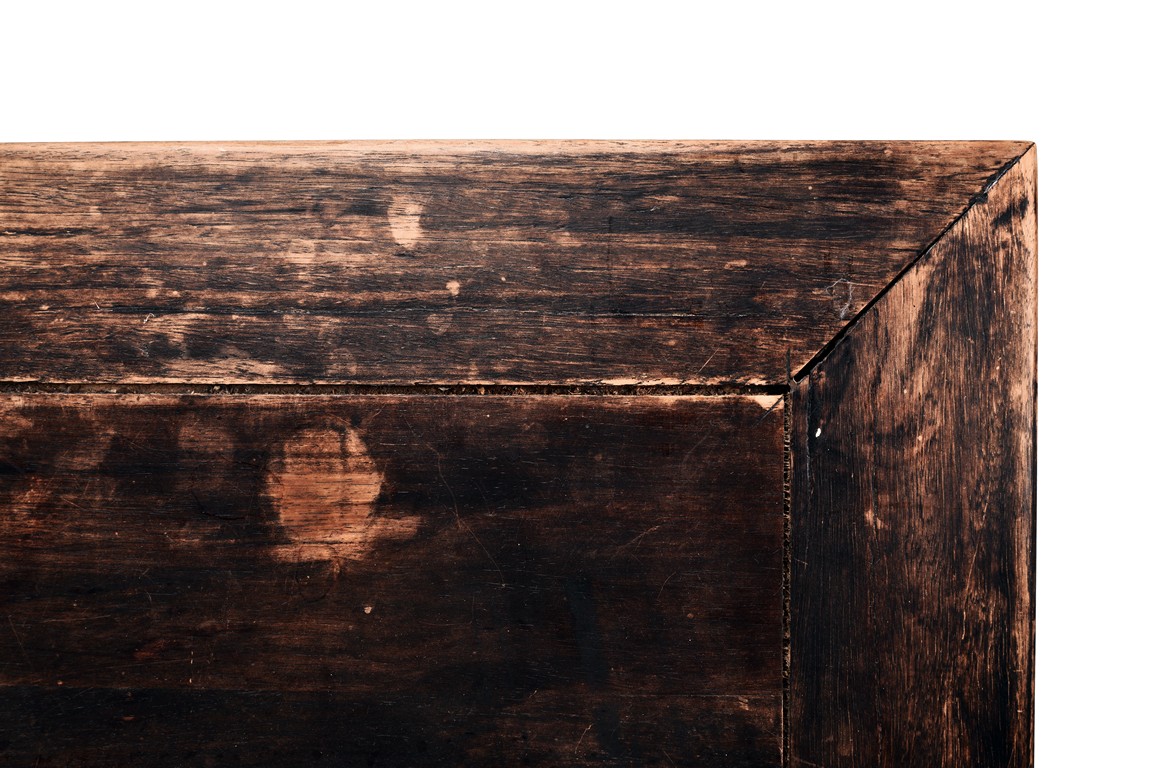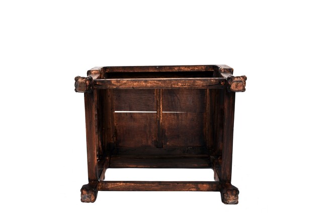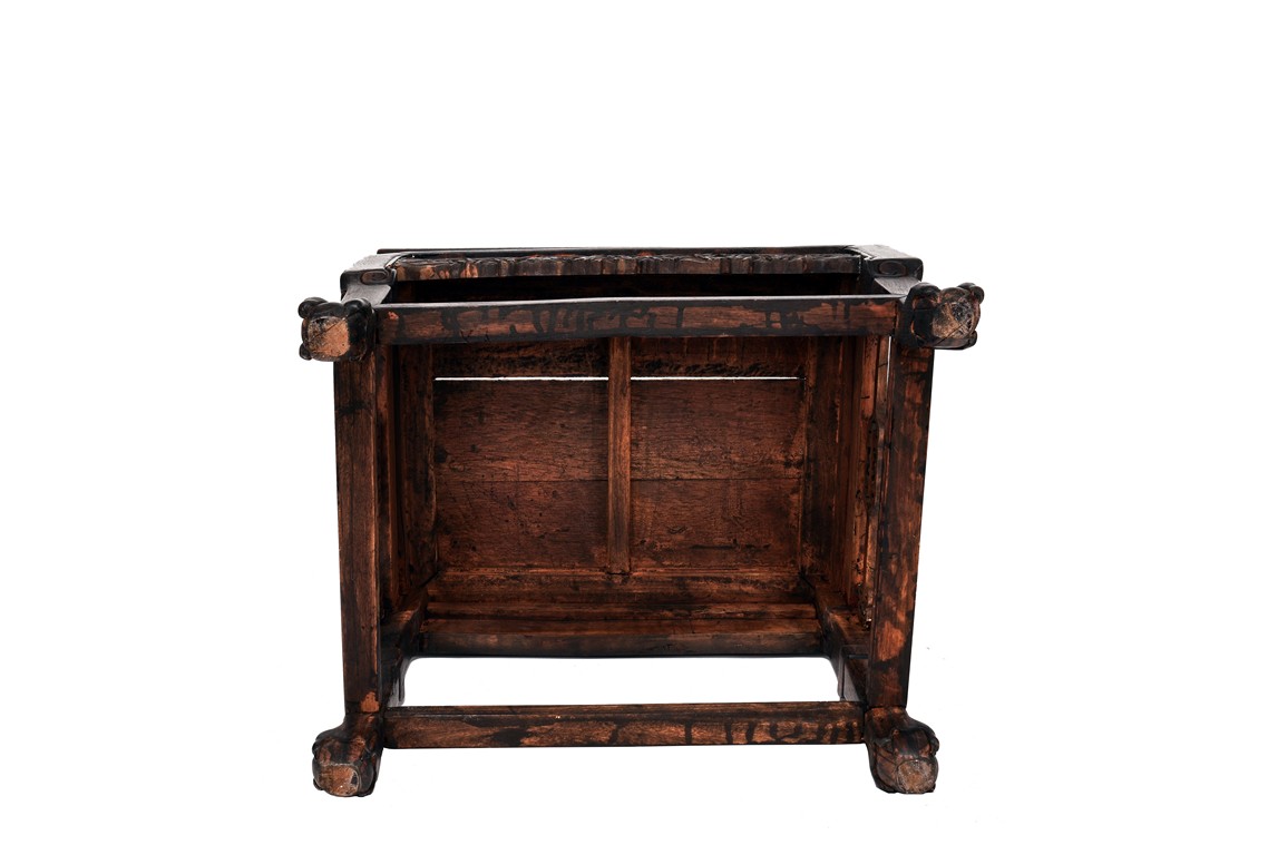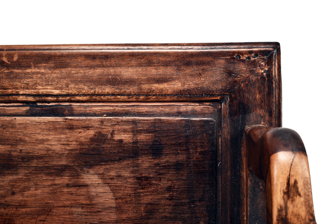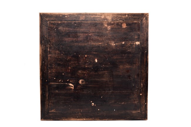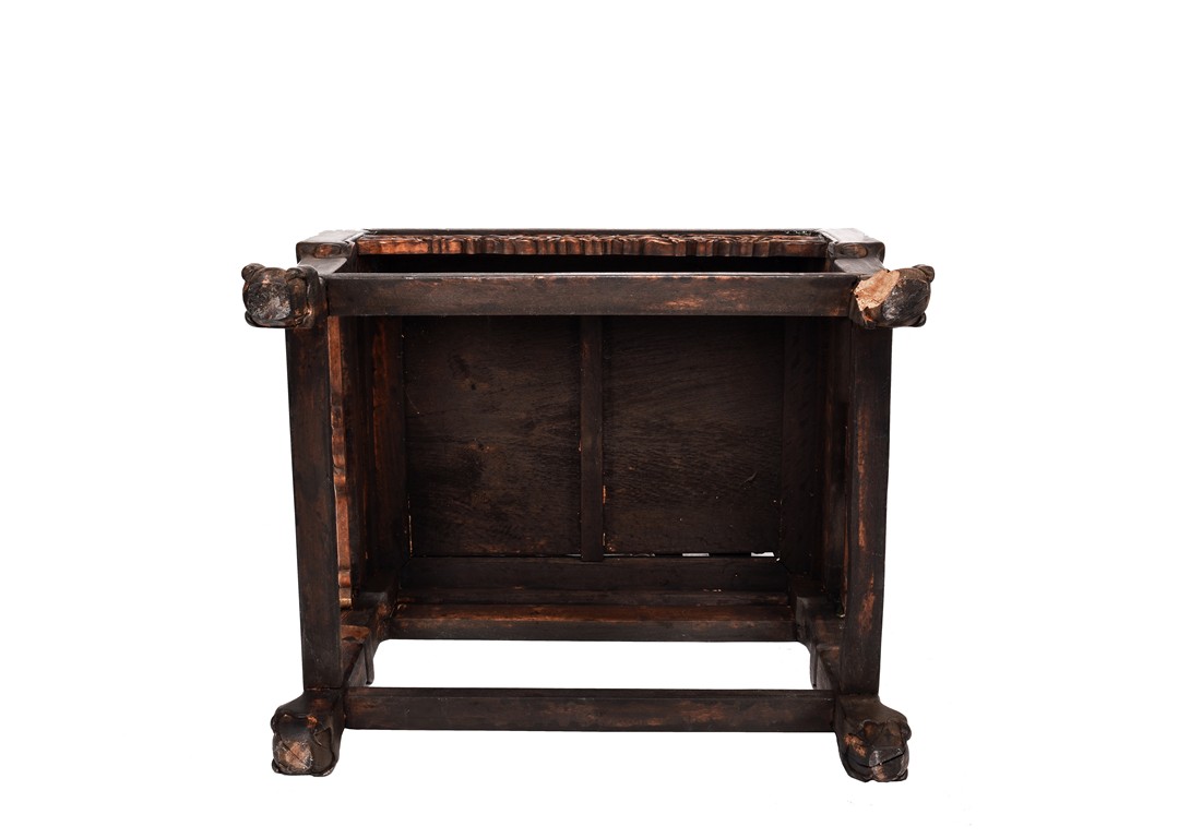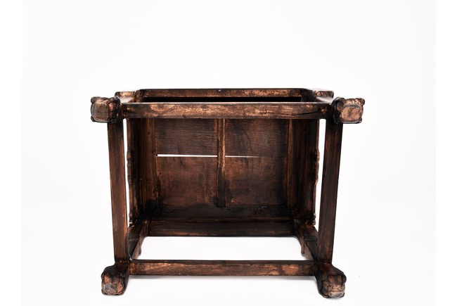 Each chair inset with a circular marbel panels as back splat, surrounded by pierced and carved lingzhi, the recessed waist underneath the hard board seat, supported on cabriole legs joined by stretchers; the table has top panels set within square frame, with recessed waist underneath, the apron reticulated with pattern. Qing Dynasty period.