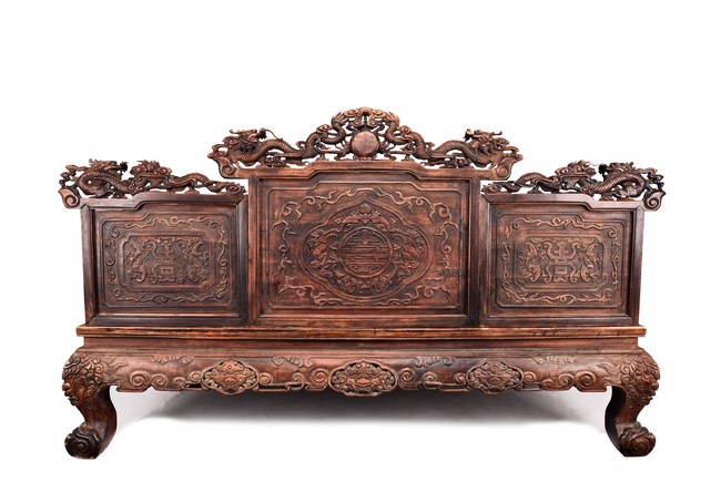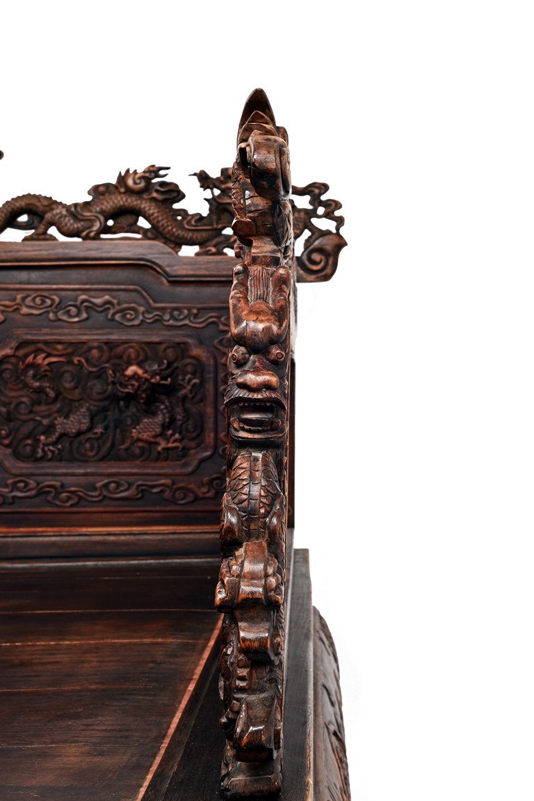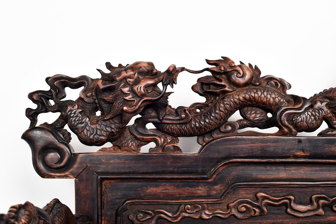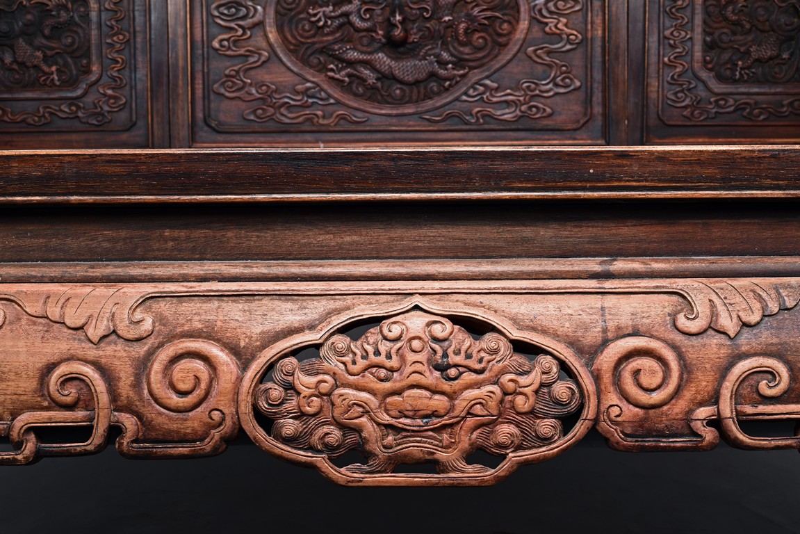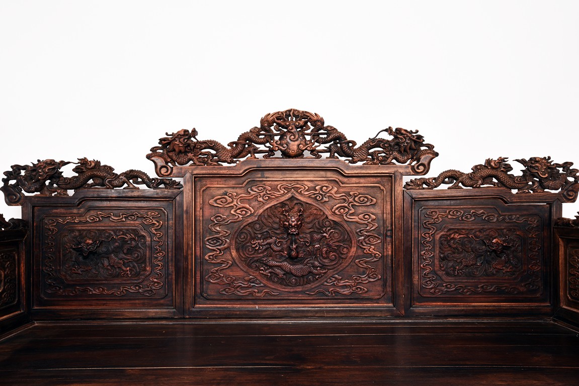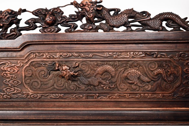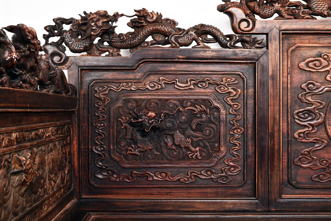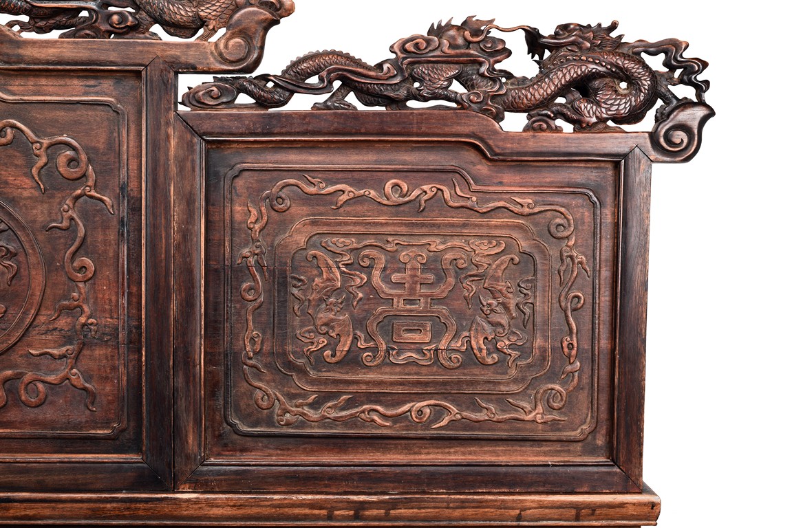 Of superb quality and massive form, the rectangular wood set within a frame above a recessed waist and a delicately carved apron with mythical beast masks, the legs terminating in mythical beast feet, the two side rails intricately carved in relief with issuing dragon amid turbulent waves, below a pierced carved two dragons flanking a flaming bowl amid auspicious clouds, the back panel carved with imperial dragon with five claws, symbolizing the superb power of the Emperor, surrounded by aupicious clouds, the back carved with three panels of auspicious five bat flanking stylized shou character symbol. Qing Dynasty period.