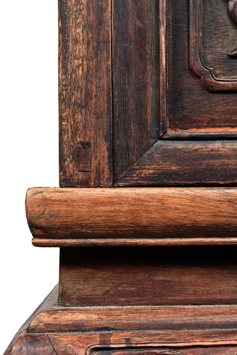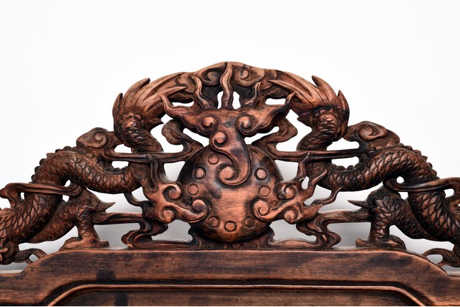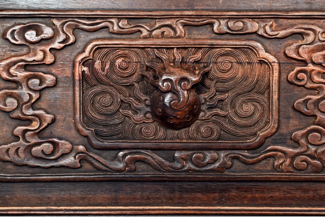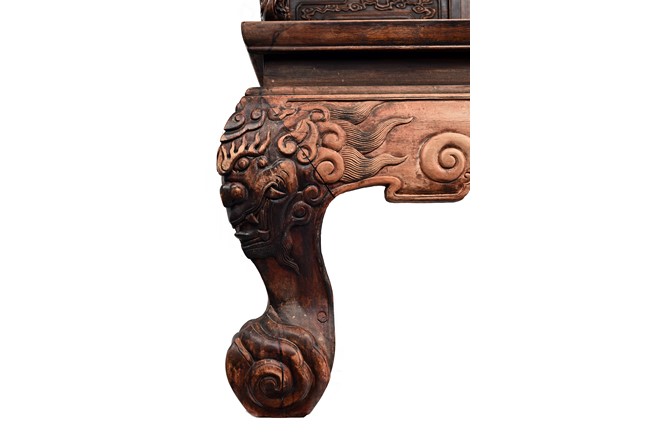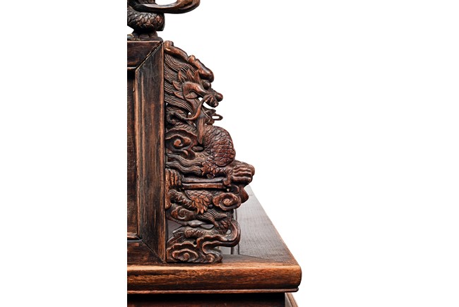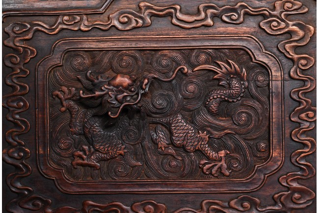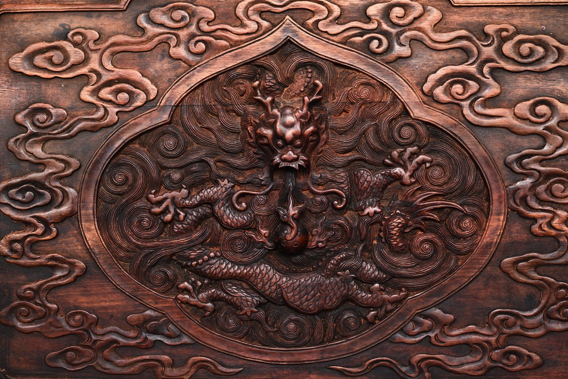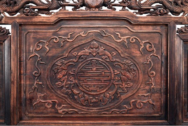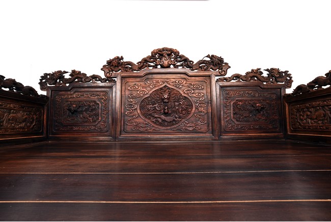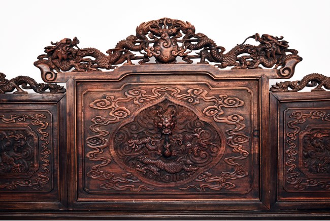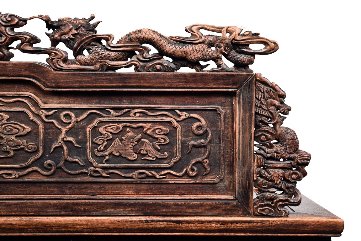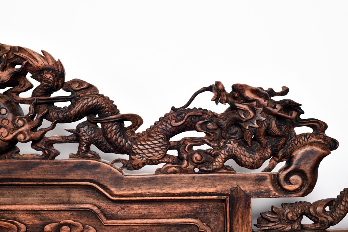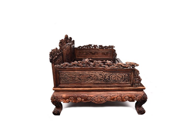 Of superb quality and massive form, the rectangular wood set within a frame above a recessed waist and a delicately carved apron with mythical beast masks, the legs terminating in mythical beast feet, the two side rails intricately carved in relief with issuing dragon amid turbulent waves, below a pierced carved two dragons flanking a flaming bowl amid auspicious clouds, the back panel carved with imperial dragon with five claws, symbolizing the superb power of the Emperor, surrounded by aupicious clouds, the back carved with three panels of auspicious five bat flanking stylized shou character symbol. Qing Dynasty period.