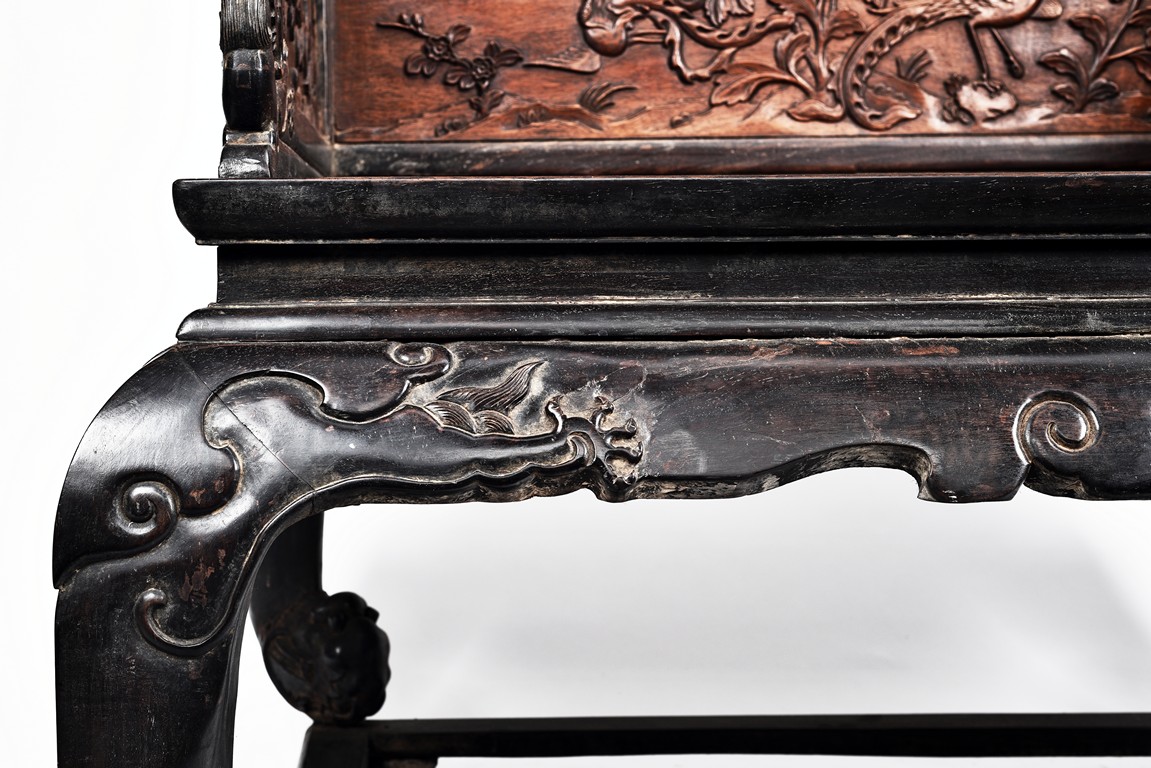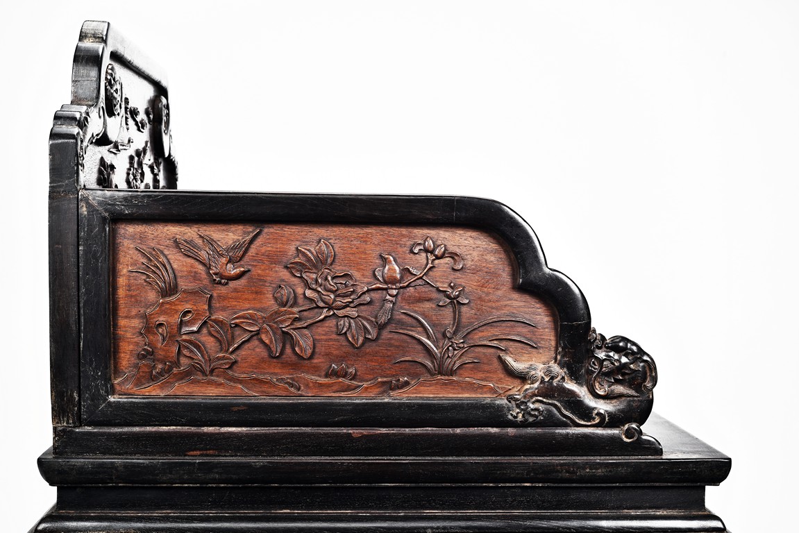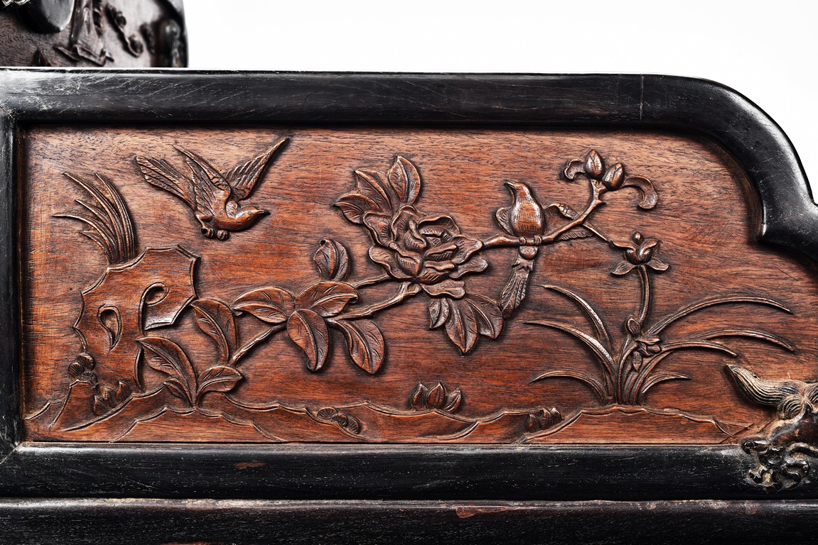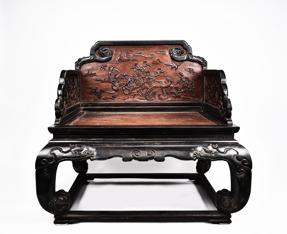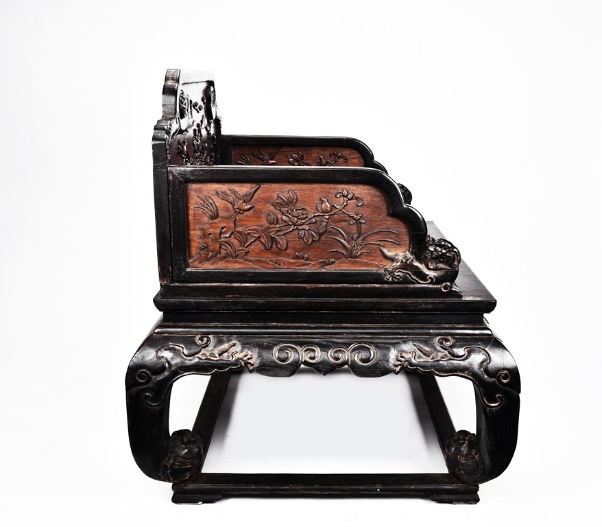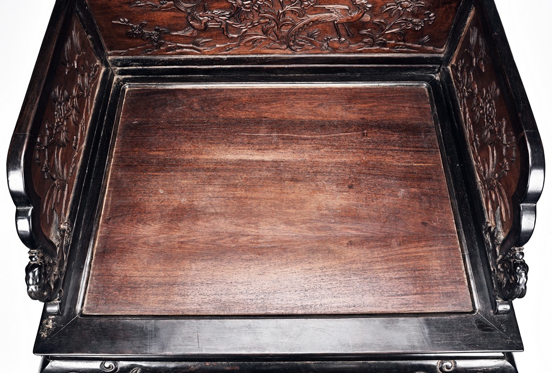 The throne is constructed of a rectangular seat framed with ice-plate edge supporteding peripheral panel screens, finely carved in relief with scene of birds and flowers on both sides, the chair back comprising a single panel finely carved with scene of birds paying homage to phoenix, all set above recessed waist supported on ruyi head and buddhist lion decorated apron, the powerful legs curved inwards as heads of lions, each rested on a floor stretcher. Qing Dynasty period.