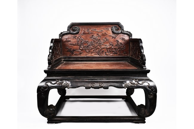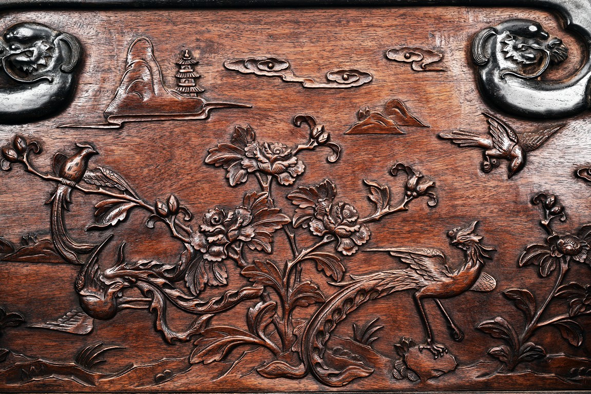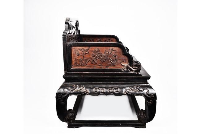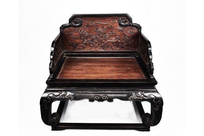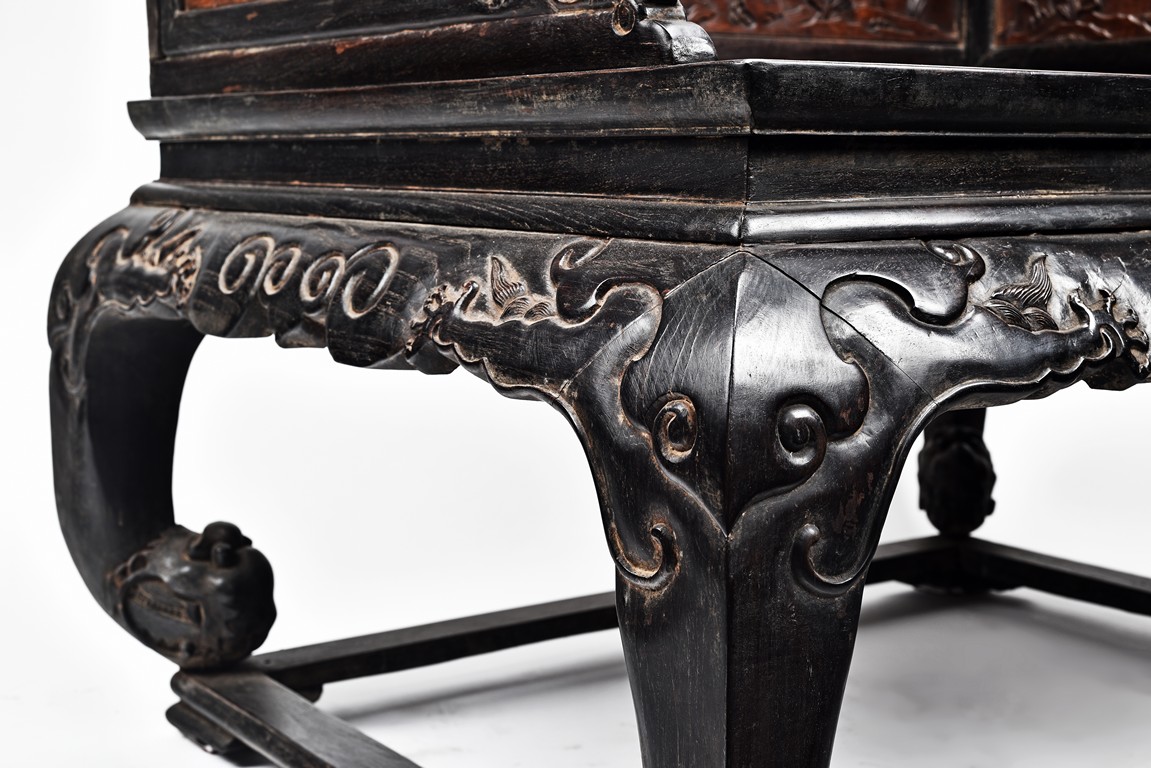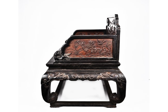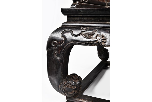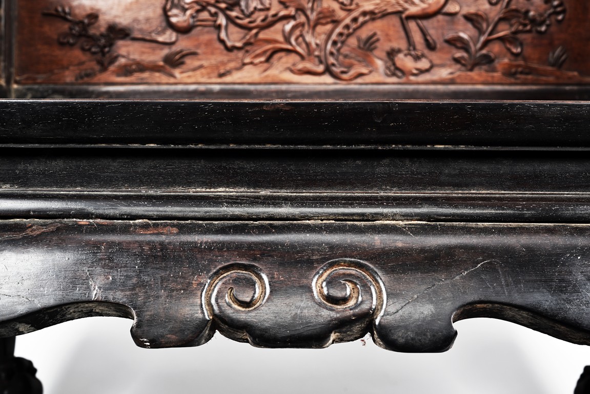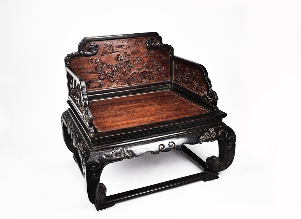 The throne is constructed of a rectangular seat framed with ice-plate edge supporteding peripheral panel screens, finely carved in relief with scene of birds and flowers on both sides, the chair back comprising a single panel finely carved with scene of birds paying homage to phoenix, all set above recessed waist supported on ruyi head and buddhist lion decorated apron, the powerful legs curved inwards as heads of lions, each rested on a floor stretcher. Qing Dynasty period.