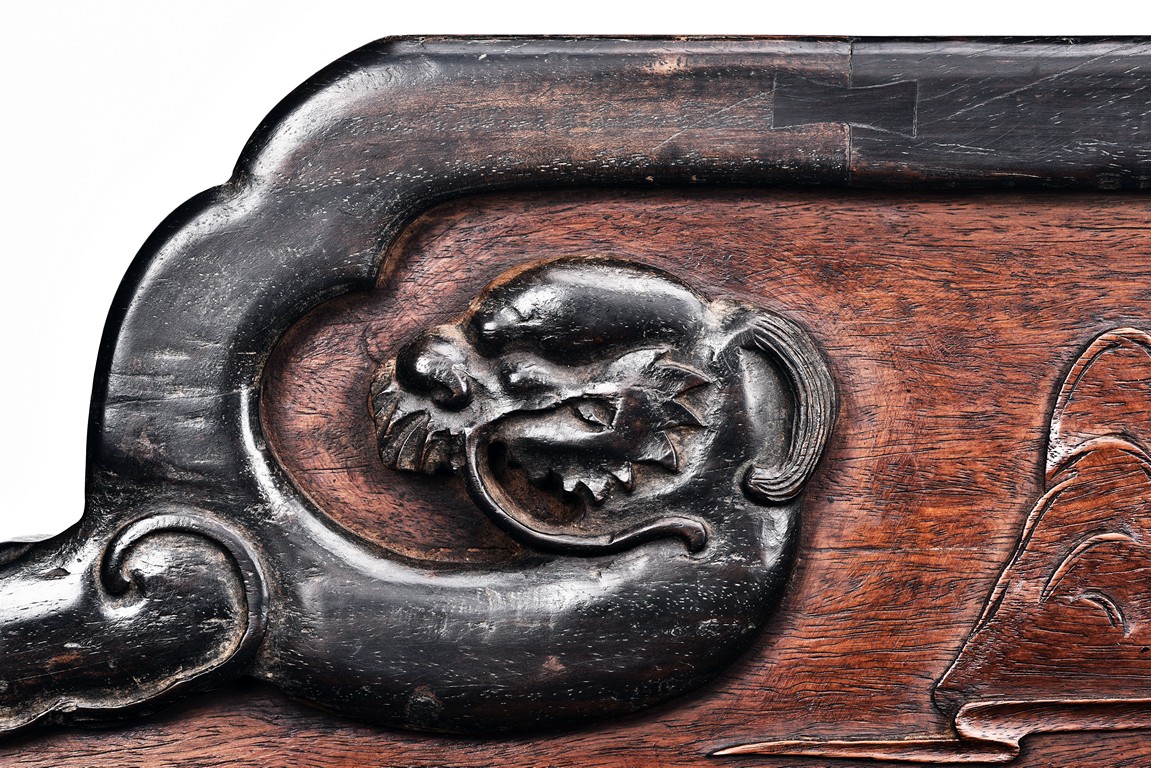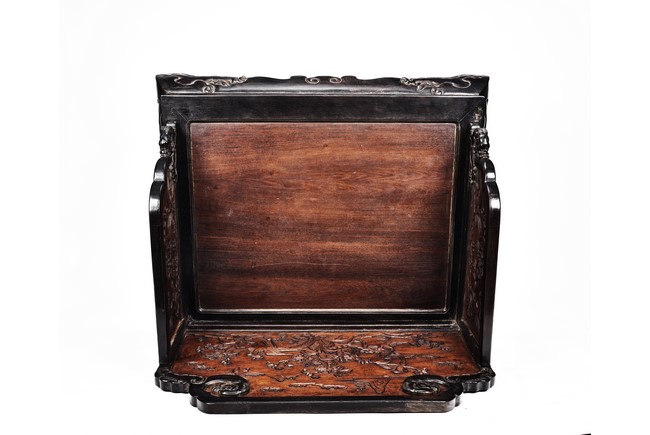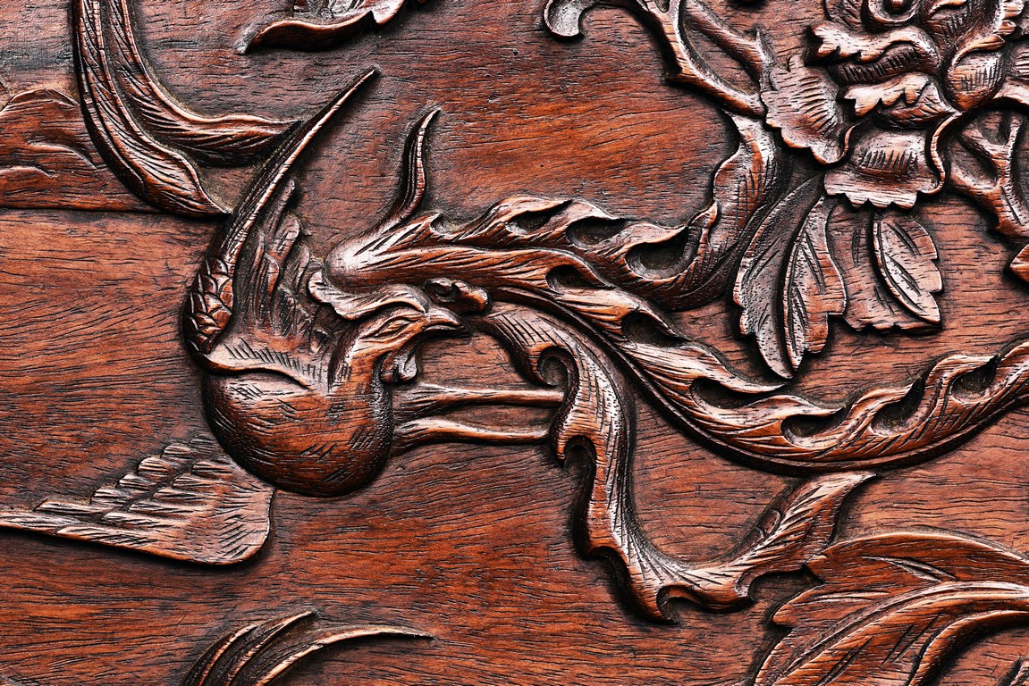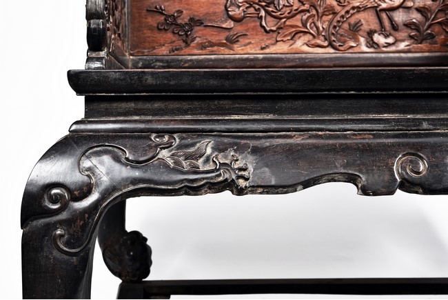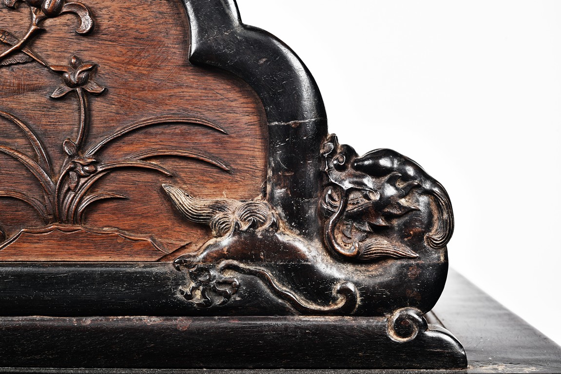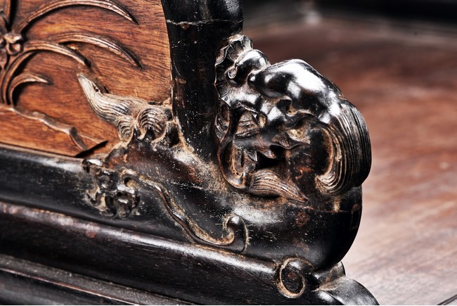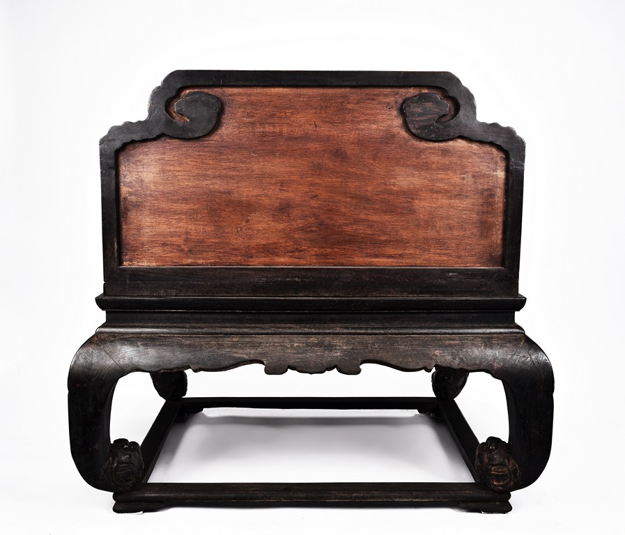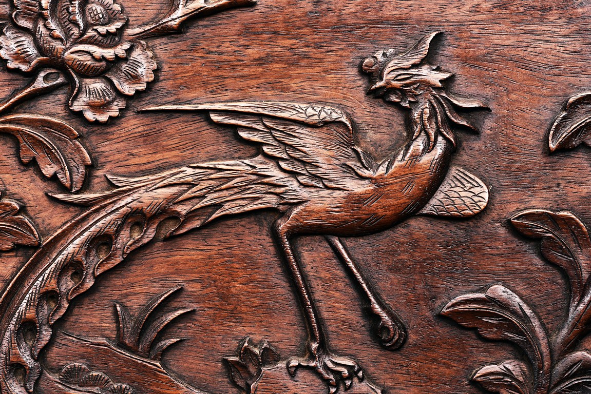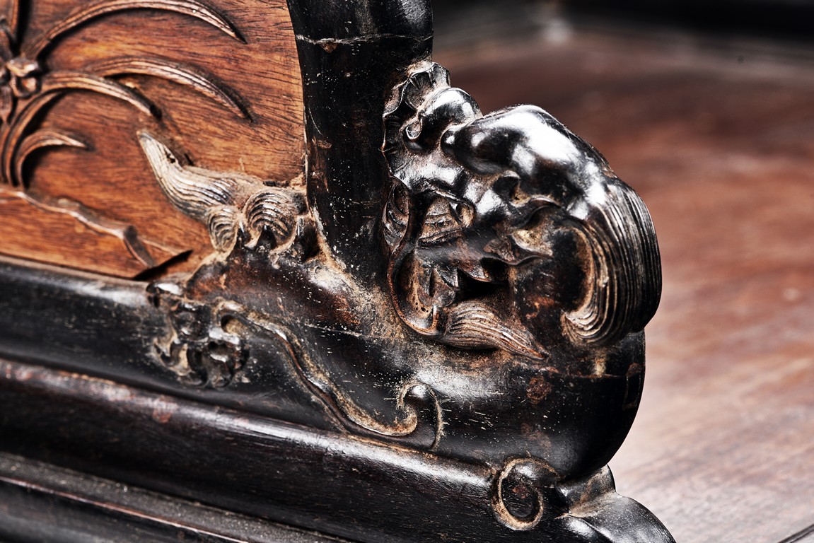 The throne is constructed of a rectangular seat framed with ice-plate edge supporteding peripheral panel screens, finely carved in relief with scene of birds and flowers on both sides, the chair back comprising a single panel finely carved with scene of birds paying homage to phoenix, all set above recessed waist supported on ruyi head and buddhist lion decorated apron, the powerful legs curved inwards as heads of lions, each rested on a floor stretcher. Qing Dynasty period.